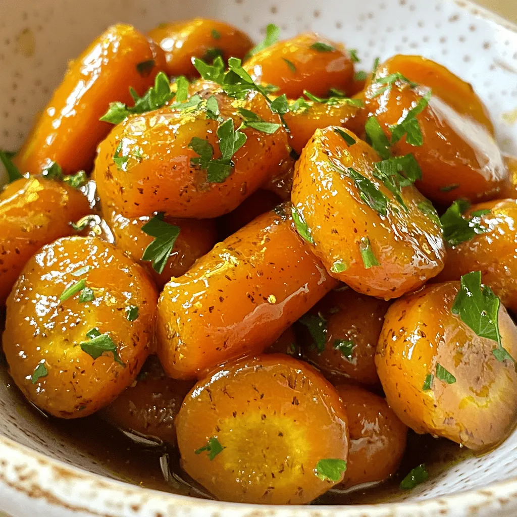 - 1 pound baby carrots - 1 large orange (zested and juiced) - 2 tablespoons honey - 1 tablespoon butter - 1 teaspoon fresh ginger (grated) - 1/4 teaspoon cinnamon - Salt to taste - Fresh parsley (chopped) When making orange glazed carrots, you need fresh baby carrots. These sweet, tender bites make a great base. Use one large orange to add bright flavor. Zest and juice it for the best taste. Honey brings sweetness and helps the glaze stick. To enhance the flavor, use butter for richness. Fresh ginger adds warmth and a slight kick. Cinnamon brings a cozy note, while salt balances it all. For garnishing, chop fresh parsley. It gives a pop of color and freshness. This simple yet vibrant dish will impress your family and friends. You can find the full recipe [here](#). Start by boiling water in a medium saucepan. You need about 1 inch of water. Add the baby carrots and steam them for about 5 to 7 minutes. The goal is to make them tender but still crisp. Once they are cooked, drain them and set them aside. This process helps keep the carrots bright and sweet. In a large skillet over medium heat, melt the butter. Once it melts, add the grated ginger. Stir it for about 30 seconds until it smells great. Now, pour in the juice and zest from the orange. Then, add the honey and cinnamon. Mix everything well. Allow the mixture to simmer gently. You want it to reduce a bit for about 3 to 4 minutes. This step brings out all the sweet and tangy flavors. Now it’s time to add the steamed carrots into the skillet. Toss them well to coat with the orange glaze. Cook them for another 2 to 3 minutes. This helps the glaze thicken and stick to the carrots. Make sure to season with salt to your taste. Give the carrots one last toss in the skillet. They should be shiny and flavorful. For the full recipe, check out the detailed instructions. Enjoy your delicious orange glazed carrots! To get the best texture for your carrots, start by steaming them. Steam them for about 5 to 7 minutes. You want them tender, but still a bit crisp. If they feel too soft, they may not hold up well in the glaze. The glaze should thicken nicely while you cook. You will see it coat the back of a spoon. When it clings well, you know it's ready. A good sign is when the glaze starts to bubble gently. You can add fun spices or herbs to change the flavor. A pinch of nutmeg or some fresh thyme can make a big difference. If you want a sweeter taste, try adding more honey. Just stir it in and taste as you go. Everyone has a different sweet tooth! For special occasions, think about how you serve the carrots. A nice white plate can make the bright orange pop. You can also serve them in a bowl with a sprinkle of chopped parsley on top. Garnishing is key! Try using orange zest or even some toasted nuts for crunch. These simple touches make your dish look and taste gourmet. For the full recipe, check out the details provided earlier. {{image_2}} You can easily make this dish vegan. Simply replace the butter with olive oil or coconut oil. Both options add great flavor and keep the carrots moist. For gluten-free cooking, this recipe is already safe. None of the ingredients contain gluten, so you can enjoy these glazed carrots worry-free. Want a bit of crunch? Add some chopped nuts or seeds. Toasted almonds or sunflower seeds work wonderfully. They give a nice texture and flavor boost. You can also switch up the citrus. Try using lemon or lime juice instead of orange juice. This adds a unique twist and brightens the dish. For an Asian twist, consider adding soy sauce or sesame oil. This gives a savory kick that pairs well with the sweetness of the carrots. You might also try a Mediterranean version. Toss in fresh herbs like thyme or rosemary, and add some olives for a salty bite. These variations can take your orange glazed carrots to a whole new level. Enjoy experimenting! After making orange glazed carrots, let them cool down. Then, transfer them to airtight containers. This helps keep the flavors fresh. Store them in the fridge for up to four days. To reheat your carrots, use the stove for best results. Warm them gently in a skillet. This keeps their texture nice. If you need a quicker option, use the microwave. Heat them in short bursts, checking often to avoid overcooking. Freezing orange glazed carrots is easy. Place cooled carrots in a freezer-safe bag or container. Remove as much air as possible. They can last for about three months. To thaw, move them to the fridge overnight. Reheat them on the stove or in the microwave after thawing. Enjoy your delicious dish at any time! You can find the [Full Recipe] for orange glazed carrots in the previous sections. How long do orange glazed carrots last in the fridge? Orange glazed carrots last about 3 to 5 days in the fridge. Store them in an airtight container to keep them fresh. When you reheat them, they may lose some crunch but will still taste great. Can I use frozen carrots instead of fresh ones? Yes, you can use frozen carrots! They will cook faster, so adjust your steaming time. Just make sure to thaw and drain them before adding to the glaze for the best flavor. What are the key nutrients in orange glazed carrots? Orange glazed carrots are rich in vitamins A and C. They also provide dietary fiber and antioxidants. The honey adds a touch of natural sweetness, while ginger gives it a nice kick. Is this recipe healthy for children and families? Absolutely! This recipe is healthy and packed with nutrients. The bright flavors make it appealing for kids, and the ingredients are simple and wholesome for the whole family. Can I double the recipe for a larger gathering? You can easily double this recipe! Just make sure you have a larger skillet or cook in batches. The glaze will still coat the carrots perfectly. What side dishes pair well with orange glazed carrots? Orange glazed carrots go well with grilled chicken, roasted pork, or even a hearty quinoa salad. They add a sweet and colorful touch to a