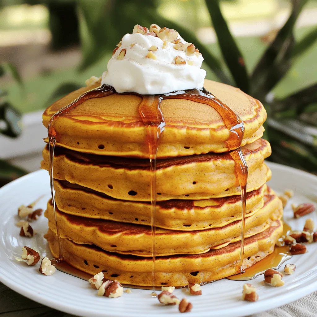 ![Here are the ingredients you need for pumpkin spice pancakes. They come together fast and taste amazing. - 1 cup all-purpose flour - 2 tablespoons brown sugar - 1 tablespoon baking powder - 1 teaspoon pumpkin spice (cinnamon, nutmeg, ginger) - 1/2 teaspoon salt - 1 cup milk (or dairy-free alternative) - 1/2 cup pure pumpkin puree - 1 large egg - 2 tablespoons melted butter (or coconut oil for dairy-free) - Optional toppings: maple syrup, whipped cream, or chopped nuts Each ingredient plays a key role in making these pancakes tasty and fluffy. The flour gives them structure, while the brown sugar adds sweetness. Baking powder helps them rise, making each bite light and airy. Pumpkin spice brings warmth and a cozy flavor that reminds you of fall. Using fresh pumpkin puree is great too! Just make sure to drain it well. If you want a dairy-free option, coconut oil and plant-based milk work perfectly. These pancakes are easy to make and even easier to enjoy! You’ll love how they look and taste. For the full recipe, check out the instructions to get started on this flavorful breakfast treat. - Whisk together dry ingredients: flour, brown sugar, baking powder, pumpkin spice, and salt. - Combine wet ingredients: milk, pumpkin puree, egg, and melted butter in a separate bowl. - Mix wet and dry ingredients carefully. Stir gently until just combined. A few lumps are fine. - Preheat a non-stick skillet over medium heat. Grease it lightly if needed. - Pour about 1/4 cup of the batter onto the skillet for each pancake. Cook until bubbles form. - Flip the pancakes when edges look set. Cook until golden brown, about 2-3 minutes more. - Serve warm with toppings like maple syrup, whipped cream, or chopped nuts. - Adjust cooking method as necessary to ensure perfect pancakes every time. For the full recipe, check out the detailed instructions above! To get fluffy pumpkin spice pancakes, avoid overmixing the batter. Mix just until the dry and wet ingredients combine. Some lumps are okay! This keeps the pancakes light and airy. The ideal skillet temperature is medium heat. If it's too hot, the outside will burn before the inside cooks. Pumpkin spice pancakes pair well with maple syrup and whipped cream. You can also try adding chopped nuts for crunch. For a fun twist, top your pancakes with fresh fruit, like sliced bananas or berries. A sprinkle of cinnamon or nutmeg adds a nice touch too. One common mistake is cooking on too high heat. This can lead to burnt pancakes. Keep an eye on your skillet and adjust the heat as needed. Another mistake is incorrect measuring of ingredients. Always use the right tools, like dry measuring cups for flour. This helps ensure your pancakes turn out perfect every time. {{image_2}} You can make your pumpkin spice pancakes even better! Try adding fun mix-ins. Here are some ideas: - Chocolate chips - Chopped nuts, like walnuts or pecans If you need a gluten-free option, swap all-purpose flour for almond flour or oat flour. These flours work great and keep the taste yummy! Want to change the flavor? Use different spices instead of pumpkin spice. Here are some options: - Cinnamon - Nutmeg - Ginger - Cardamom You can also add extracts. A few drops of vanilla or almond extract can make your pancakes extra special! Need more pancakes? Double the recipe for larger batches. It’s perfect for family gatherings or brunch. You can also make smaller servings. Just cut the recipe in half! For fun, think about a theme. How about “36 days of Pumpkin Spice Pancakes”? Each day, you can try a new twist or topping. It’s a fun way to enjoy these tasty treats! For the complete recipe, check out the [Full Recipe]. To keep your pumpkin spice pancakes fresh, store them properly. First, let the pancakes cool completely. Then, stack them with parchment paper between each pancake. This keeps them from sticking. Place the stack in an airtight container. You can refrigerate leftovers for up to three days. If you want to save some for later, freeze them. Wrap each pancake in plastic wrap. Then place them in a freezer bag. They will last up to three months. Just remember to label the bag with the date. This way, you always know how long they have been in there. When it’s time to eat, you can reheat pancakes easily. The microwave is quick. Just place a pancake on a plate and cover it with a damp paper towel. Heat for about 20-30 seconds. This keeps it moist. You can also use the stovetop. Heat a skillet over low heat. Place the pancake in the skillet and cover it. Heat for a few minutes until warm. This method helps maintain the nice texture of the pancakes. For the best results, avoid overheating. You want them warm, not dry. Enjoy your delicious pumpkin spice pancakes again! Yes, you can use fresh pumpkin. Start by selecting a sugar pumpkin. These are sweeter and softer. Cut it in half, scoop out the seeds, and roast the halves until soft. This takes about 45 minutes at 350°F (175°C). Once it's cool, scoop out the flesh and blend until smooth. This makes a creamy pumpkin puree perfect for your pancakes. You can easily make this recipe vegan. For eggs, use a flax egg. Mix 1 tablespoon of ground flaxseed with 2.5 tablespoons of water. Let it sit for 5 minutes. Instead of milk, use almond milk or oat milk. For butter, swap it with coconut oil or a plant-based butter. These swaps keep the flavor rich and tasty. Toppings can make your pancakes even better. Maple syrup is classic and sweet. Whipped cream adds fluffiness and richness. You can also sprinkle chopped nuts for crunch. For an extra touch, add a sprinkle of cinnamon or a drizzle of caramel sauce. Each choice enhances the pumpkin flavor beautifully. You learned how to make delicious pumpkin spice pancakes from start to finish. We covered the key ingredients, step-by-step instructions, and helpful tips for perfect texture. Remember, avoid overmixing the batter and don't cook on high heat. Feel free to get creative with flavors and toppings