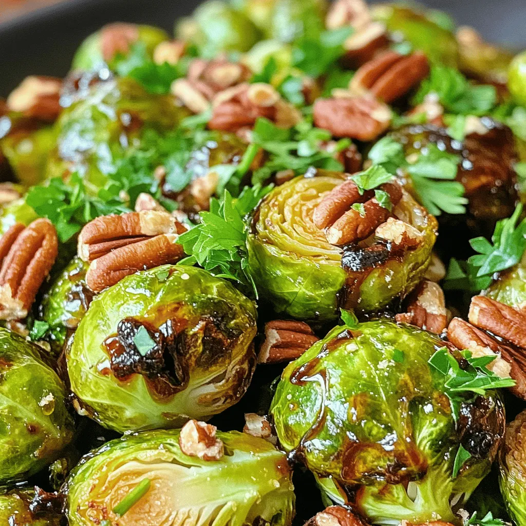 While the sprouts roast, prepare the glaze. In a small saucepan, mix pure maple syrup and balsamic vinegar over medium heat. Stir it often until it simmers. Cook for about 5 minutes until it thickens slightly. This glaze adds a sweet and tangy flavor. After roasting, remove the sprouts from the oven. Drizzle the maple glaze over them. Toss gently to coat every sprout. If you want some crunch, sprinkle chopped pecans on top. Return the baking sheet to the oven for an extra 5 minutes. This helps the glaze caramelize. Finally, garnish with fresh parsley before serving hot.