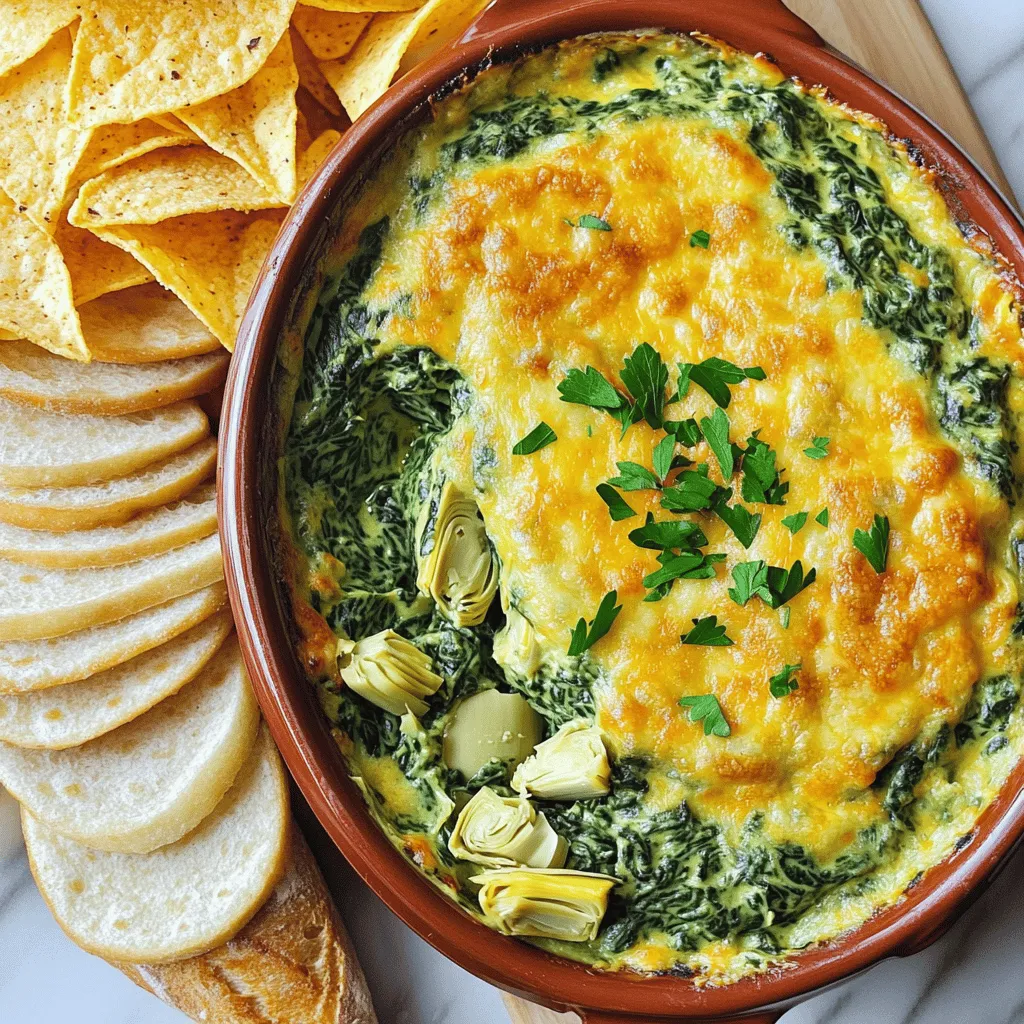 - 1 cup frozen spinach - 1 can (14 oz) artichoke hearts - 1 cup cream cheese - ½ cup sour cream - ½ cup mayonnaise - 1 cup shredded mozzarella cheese - ½ cup grated Parmesan cheese - 2 cloves garlic - ½ teaspoon red pepper flakes (optional) - Salt and pepper I love this dip because it is simple yet delicious. The frozen spinach and artichoke hearts bring a nice earthiness. Cream cheese gives it a rich texture. Sour cream and mayonnaise add creaminess. Mozzarella and Parmesan give it cheesy goodness. - Tortilla chips - Sliced baguette When serving, I suggest pairing the dip with crunchy tortilla chips or warm, sliced baguette. These options help balance the creamy dip. You can even mix and match! Enjoy the fun of dipping and sharing with friends. For the full recipe, check out the steps to make this dip. It’s a tasty crowd pleaser that everyone loves! - Preheat your oven to 350°F (175°C). - In a large bowl, combine 1 cup of softened cream cheese, ½ cup of sour cream, and ½ cup of mayonnaise. Mix these until smooth and creamy. - Next, stir in 2 cloves of minced garlic, 1 can of chopped artichoke hearts, and 1 cup of thawed, well-drained spinach. Mix until everything is well combined. - Now, add in 1 cup of shredded mozzarella cheese, ½ cup of grated Parmesan cheese, and ½ teaspoon of red pepper flakes if you want a little heat. Season with salt and pepper to taste, then mix everything thoroughly. - Transfer your creamy mixture into a baking dish and spread it out evenly. - Bake in the preheated oven for 25-30 minutes. You will know it's ready when the dip is bubbly and golden on top. - Once baked, remove the dish from the oven. Let it cool slightly before serving. This dish is great served with tortilla chips or sliced baguette for dipping. For the full recipe, check out the details above! To make the best creamy spinach artichoke dip, start with your spinach. You need to ensure proper drainage. If you skip this step, your dip might be too watery. After thawing, squeeze the spinach in a clean kitchen towel to remove excess moisture. This keeps your dip thick and rich. Next, adjust the seasonings for your taste. I like to start with salt and pepper. You can also add garlic for extra flavor. If you want more heat, sprinkle in some red pepper flakes. Taste as you go. It’s all about making it your own! Presentation matters when serving your dip. Garnish with fresh parsley or a sprinkle of grated Parmesan cheese. This adds color and makes your dish look fancy. For serving suggestions, use crispy tortilla chips or sliced baguette. Both options are great for scooping. Arrange them around the dip for a nice touch. You can also serve it in a bread bowl for a fun twist. Enjoy your delicious dip! For the full recipe, check out the detailed section above. {{image_2}} You can make Creamy Spinach Artichoke Dip lighter. Try using Greek yogurt instead of sour cream. Greek yogurt adds creaminess and cuts calories. It also boosts protein. Another option is to use low-fat cream cheese. This still gives a rich texture but saves on fat. You can enjoy the dip guilt-free while still savoring the flavor. Want to kick up the taste? Add some fresh herbs like basil or thyme. These herbs bring a fresh twist that brightens the dip. You can even mix in some cooked bacon for a savory crunch. Sautéed onions also make a tasty addition. They add sweetness and depth. Both options create a flavor explosion that keeps everyone coming back for more. Serve this dip with creative dippers. Tortilla chips are classic, but you can also use sliced veggies like cucumbers or bell peppers. They add a nice crunch and are healthy too. You can also turn the dip into a spread for sandwiches. Simply slather it on bread for a tasty lunch. This twist makes it easy to enjoy the flavors in a new way. For the full recipe, check out the recipe section above. To keep your creamy spinach artichoke dip fresh, store it in an airtight container. Make sure to let it cool before sealing. This dip stays good in the fridge for about 3 to 5 days. If you want to keep it longer, consider freezing it. However, the texture may change slightly after thawing. When you’re ready to enjoy the dip again, you can reheat it in several ways. The best method is to use the oven. Preheat your oven to 350°F (175°C) and place the dip in a baking dish. Heat for about 15-20 minutes until it's warm and bubbly. If you’re short on time, you can use the microwave. Place the dip in a microwave-safe bowl and heat it in 30-second intervals. Stir after each interval until it’s hot. Both methods make it easy to enjoy this tasty crowd-pleaser again. Yes, you can prepare this dip a day ahead. Just mix all the ingredients as the recipe states. Store it in an airtight container in the fridge. When you're ready to serve, spread it in a baking dish and bake as instructed. This saves time and makes your party prep easier. Just remember, let it sit at room temperature for about 15 minutes before baking. This helps it cook evenly. To add heat, sprinkle in more red pepper flakes. You can use one teaspoon instead of half. Another option is to mix in diced jalapeños. If you like smoky flavors, try adding smoked paprika. These choices will give your dip a fun kick and make it exciting. This dip pairs well with various dippers. Tortilla chips work great for scooping. You can also use sliced baguette, pita chips, or veggies like carrots and celery. If you want something unique, try using pretzel bites. They add a nice salty crunch. Yes, you can freeze this dip. Just put it in a freezer-safe container. It will keep well for up to three months. When you're ready to eat it, thaw it in the fridge overnight. Reheat it in the oven until it’s hot and bubbly again. This way, you can enjoy it any time. For the full recipe, check out the details above! In this post, we covered how to make creamy spinach artichoke dip. We listed the ingredients and provided detailed steps for easy pre
