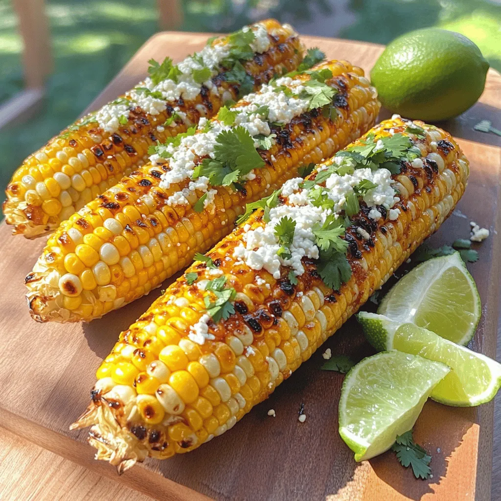 Now it’s time to grill! Brush your corn ears with the chili-lime mix. Make sure to cover every ear well. Once your grill is hot, place the corn directly on the grates. Grill for about 10 to 12 minutes. Turn the corn every few minutes. You want it to be tender and have nice grill marks. When it’s done, carefully take it off the grill and let it cool a bit. After cooling, sprinkle cotija cheese on top. Finish it with fresh cilantro for a pop of color and flavor. Serve warm and enjoy this tasty summer treat!