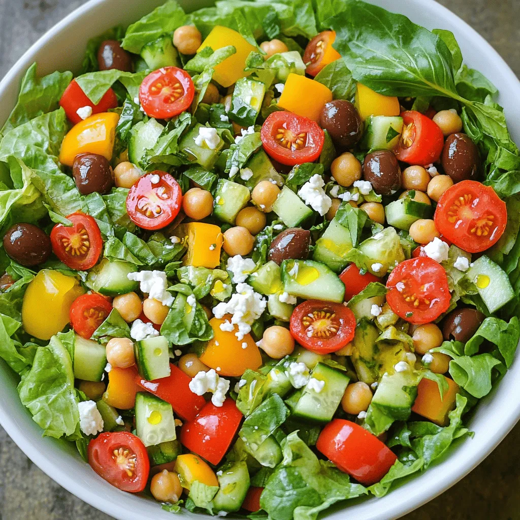 ![- 2 cups romaine lettuce, chopped - 1 cup cherry tomatoes, halved - 1 cucumber, diced - 1 bell pepper (red or yellow), diced - 1/2 red onion, finely chopped - Fresh basil leaves When making a Classic Italian Chopped Salad, fresh produce is key. Romaine lettuce gives a nice crunch. Cherry tomatoes add sweetness. Cucumbers bring a cool taste. A bell pepper adds color and flavor. Red onion gives a slight bite. Fresh basil leaves top it off with a fragrant finish. - 1 cup cooked chickpeas, drained and rinsed - 1/2 cup Kalamata olives, pitted and halved - 1/4 cup feta cheese, crumbled Don’t forget the canned and packaged items. Chickpeas add protein and heartiness. Kalamata olives bring a salty kick. Feta cheese adds creaminess and tang. Each of these ingredients makes the salad more filling and satisfying. - 3 tablespoons extra virgin olive oil - 2 tablespoons red wine vinegar - 1 teaspoon Dijon mustard - Salt and pepper to taste Condiments and seasonings are where the magic happens. Extra virgin olive oil gives richness. Red wine vinegar adds acidity and brightness. Dijon mustard brings a little spice. Salt and pepper enhance all the flavors. Together, they create a simple dressing that ties everything together perfectly. For the full recipe, check out the [Full Recipe]. First, we chop the vegetables. Start with the romaine lettuce. Use a sharp knife to cut it into small pieces. Then, halve the cherry tomatoes. Dice the cucumber and bell pepper into bite-sized pieces. Next, finely chop the red onion. It adds a nice crunch and flavor. Lastly, rinse the cooked chickpeas under cold water. Drain them well. For the olives, cut them in half. This step makes all the flavors blend nicely. Now, let’s make the dressing. In a small bowl, add the extra virgin olive oil, red wine vinegar, and Dijon mustard. Use a whisk to mix these together. Make sure they blend well. Add a pinch of salt and pepper. Whisk until the dressing is smooth and creamy. This dressing will bring our salad to life! Next, it’s time to combine everything. In a large bowl, add all the chopped vegetables, chickpeas, and olives. Pour the dressing over the salad. Toss gently, so everything gets coated. Be careful not to break the feta too much when you add it. Give it one last toss. Let the salad sit for about 5-10 minutes. This helps the flavors come together. Now, serve the salad in bowls or on a large platter. Don’t forget to add fresh basil leaves on top. They add color and a lovely aroma. You can find the Full Recipe to see all the details! To boost the flavor of your Classic Italian Chopped Salad, try marinating it. After you mix the salad, let it sit for 10 minutes. This helps the ingredients soak up the dressing. You can also swap ingredients for a new twist. Use arugula instead of romaine for a peppery kick. Substitute cherry tomatoes with sun-dried tomatoes for a deeper taste. If you want a creamier salad, try using goat cheese instead of feta. When serving, think about how it looks. For gatherings, use a large platter. Arrange the salad in layers for a colorful display. Garnish your salad with fresh basil leaves. You can also sprinkle some extra feta on top for a nice touch. Another great idea is to add a drizzle of olive oil just before serving. This adds shine and flavor. Prep your ingredients ahead of time. You can chop the veggies the night before. Store them in airtight containers in the fridge. This makes salad-making quick and easy. Consider using canned chickpeas instead of dried ones. Canned chickpeas save time because you don't need to soak them. Just rinse and drain before adding them to your salad. This keeps the cooking process simple and fast. For the full recipe, check out the Italian Rustic Chopped Salad. {{image_2}} You can boost your salad's texture with a few tasty add-ins. - Avocado: Adding creamy avocado makes your salad richer and smoother. It brings a nice balance to the crunch of the veggies. - Nuts or seeds: Toss in some nuts or seeds for a delightful crunch. Pine nuts, walnuts, or sunflower seeds work well. They add flavor and healthy fats. You have options when it comes to dressing your salad. - Homemade vs. store-bought options: I always recommend making your own dressing. It's simple and fresh. However, store-bought dressings can save time when you’re busy. Look for ones with clean ingredients. - Different vinegar choices: While red wine vinegar is classic, you can swap it for apple cider vinegar or balsamic vinegar. Each type gives the salad a unique taste. Change your ingredients to match the season for a fresh twist. - Summer versions: In warmer months, add sweet corn, ripe peaches, or fresh herbs. These bring bright flavors and colors. - Winter versions: For cold months, try adding roasted root vegetables or hearty greens like kale. These ingredients make the salad warm and satisfying. For the full recipe, check out the Italian Rustic Chopped Salad 🥗 section. To keep your Italian chopped salad fresh in the fridge, follow these tips. First, store the salad in an airtight container. This helps keep moisture out. Second, keep the dressing separate. Adding it right before eating keeps the salad crisp. Use the salad within three days for the best flavor and texture. Freezing this salad is not ideal, but you can freeze some ingredients. For example, cooked chickpeas freeze well. Just drain and rinse them, then place in a freezer bag. You can also freeze diced bell peppers. When you want to use them, thaw in the fridge overnight. To enjoy leftovers, I recommend serving them cold. If you want to warm any ingredients, heat them gently. Be careful not to overcook. Mix in fresh greens or add more dressing to brighten the flavor. Enjoy your meal! For the full recipe, check out the Italian Rustic Chopped Salad. A Classic Italian Chopped Salad is a fresh mix of flavors and textures. It usually includes: - Romaine lettuce - Cherry tomatoes - Cucumber - Bell pepper - Chickpeas - Red onion - Ka