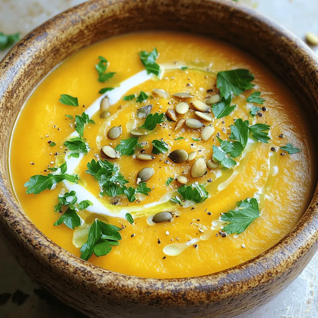 - 1 medium butternut squash, peeled and diced - 1 large onion, chopped - 2 cloves garlic, minced - 2 tablespoons olive oil - 4 cups vegetable broth - ½ cup coconut milk (for creaminess) - 1 teaspoon ground cumin - 1 teaspoon ground coriander - ½ teaspoon nutmeg - Salt and pepper to taste The main star of this soup is the butternut squash. It gives a sweet and nutty taste. You want to peel and dice it into small pieces. This helps it cook faster and blend well. Onions and garlic add a nice depth of flavor. Chop the onion into small pieces. Mince the garlic cloves finely for a strong aroma. Olive oil is key for roasting. It helps the squash and onion caramelize, which adds rich flavor. Vegetable broth is a great base. It makes the soup hearty and full of goodness. You can use homemade or store-bought broth. Coconut milk is optional but adds creaminess. It also gives a nice hint of sweetness. When it comes to spices, cumin and coriander bring warmth. They pair perfectly with butternut squash. Nutmeg adds a hint of sweetness. Adjust salt and pepper to your taste. For the full recipe, check the section earlier. This soup is easy to make and so rewarding! 1. Preheat your oven to 400°F (200°C). This heat will help caramelize the squash. 2. On a large baking sheet, spread the diced butternut squash and chopped onion. 3. Drizzle the vegetables with 2 tablespoons of olive oil. 4. Sprinkle with salt, pepper, cumin, coriander, and nutmeg. 5. Toss everything until well coated. 1. Roast in the oven for 25-30 minutes. The squash should be tender and caramelized. 2. Stir the veggies halfway through to ensure even cooking. 1. In a large pot, add the roasted squash, onions, and 2 minced garlic cloves. 2. Pour in 4 cups of vegetable broth and bring to a simmer over medium heat. 3. Let it simmer for about 10 minutes. 4. Blend the mixture until smooth. Use an immersion blender or a countertop blender. 5. If using, stir in ½ cup of coconut milk for extra creaminess. 6. Adjust seasoning with salt and pepper as needed. 7. Heat through, then remove from the heat. For the complete recipe, see the [Full Recipe]. How to Select the Right Butternut Squash When choosing butternut squash, look for ones that feel heavy for their size. The skin should be a deep tan color and free from soft spots. A firm squash means fresh flavor. Also, pick a squash with a long neck. The neck has more flesh and less seed. Ensuring Smooth Consistency with Blending Techniques To achieve a smooth soup, use an immersion blender. It is easier and less messy. If you use a regular blender, let the soup cool a bit first. Blend in small batches to avoid spills. Make sure to blend until it’s silky and lump-free for that perfect texture. Presentation Tips for an Elegant Bowl Serve the soup in a deep bowl for a cozy feel. Swirl in a bit of coconut milk for a nice look. You can also drizzle some olive oil on top. This adds shine and makes it appealing. A sprinkle of toasted pumpkin seeds adds a nice crunch and color. Garnish Ideas for Added Flavor and Texture Garnish with fresh herbs like parsley or cilantro for brightness. Chopped nuts or seeds can give it extra texture. A pinch of smoked paprika can add a nice touch of heat. These small additions can change the flavor and make your soup stand out. How to Properly Store Leftover Soup Let the soup cool completely before storing. Use airtight containers to keep it fresh. The soup will last in the fridge for about five days. You can also freeze it for up to three months. Just make sure to leave space in the container for expansion. Best Practices for Reheating When reheating, do it slowly over low heat. Stir often to prevent sticking. If the soup seems too thick, add a splash of broth or water. This will help return it to the right consistency. Always taste before serving to adjust seasoning as needed. For the best flavor, enjoy it warm! For a detailed guide on making this rich and flavorful soup, check out the Full Recipe. {{image_2}} To make a vegan version of roasted butternut squash soup, consider using different non-dairy creamers. Almond milk or cashew cream can add a nice touch. They keep the soup creamy without dairy. You can also enhance the flavor by adding extra vegetables. Carrots or sweet potatoes blend well with squash. You can roast them together for a richer taste. When making this soup gluten-free, ensure all your ingredients are safe. Most vegetables and spices are gluten-free, but check labels on store-bought broth. You can pair the soup with gluten-free bread or crackers. This adds texture and makes the meal more filling. Look for options made from rice or chickpeas for a tasty crunch. To create an extra creamy soup, I recommend blending for longer. The smoother your soup, the richer it feels. You can also add dairy alternatives for extra richness. Cream cheese or sour cream can work well. If you prefer non-dairy, try cashew cream for a nutty flavor. This can elevate the soup's taste, making it feel luxurious and satisfying. For the Full Recipe, check the detailed instructions to guide your cooking process. Each serving of roasted butternut squash soup has: - Calories: About 150 - Carbohydrates: 30 grams - Fiber: 5 grams - Protein: 3 grams These numbers can change based on added ingredients. For example, adding coconut milk boosts the calories and fat content. The soup is rich in vitamins A and C. It also provides potassium and magnesium. These nutrients help keep your body strong and healthy. - Butternut Squash: This main ingredient is full of vitamins and minerals. It supports eye health and boosts your immune system. - Onion: Onions have antioxidants. They help fight inflammation and improve heart health. - Garlic: Garlic has many health benefits. It can help lower blood pressure and support your immune system. - Coconut Milk: By adding coconut milk, you get healthy fats. These fats can improve heart health and aid digestion. Butternut squash is a superfood. It is low in c