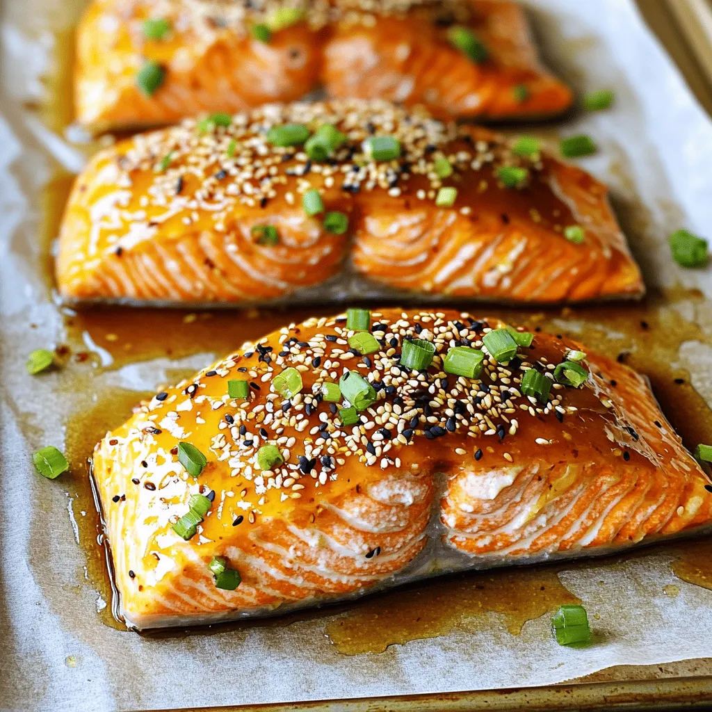 Now, bake the salmon in the oven for about 12-15 minutes. Look for the salmon to be fully cooked and flaky. If you want a crispy finish, broil the salmon for 2-3 minutes at the end. This step gives the crust a nice golden color. When it’s done, let the salmon rest for a few minutes before serving. Enjoy with chopped green onions on top for added flavor!