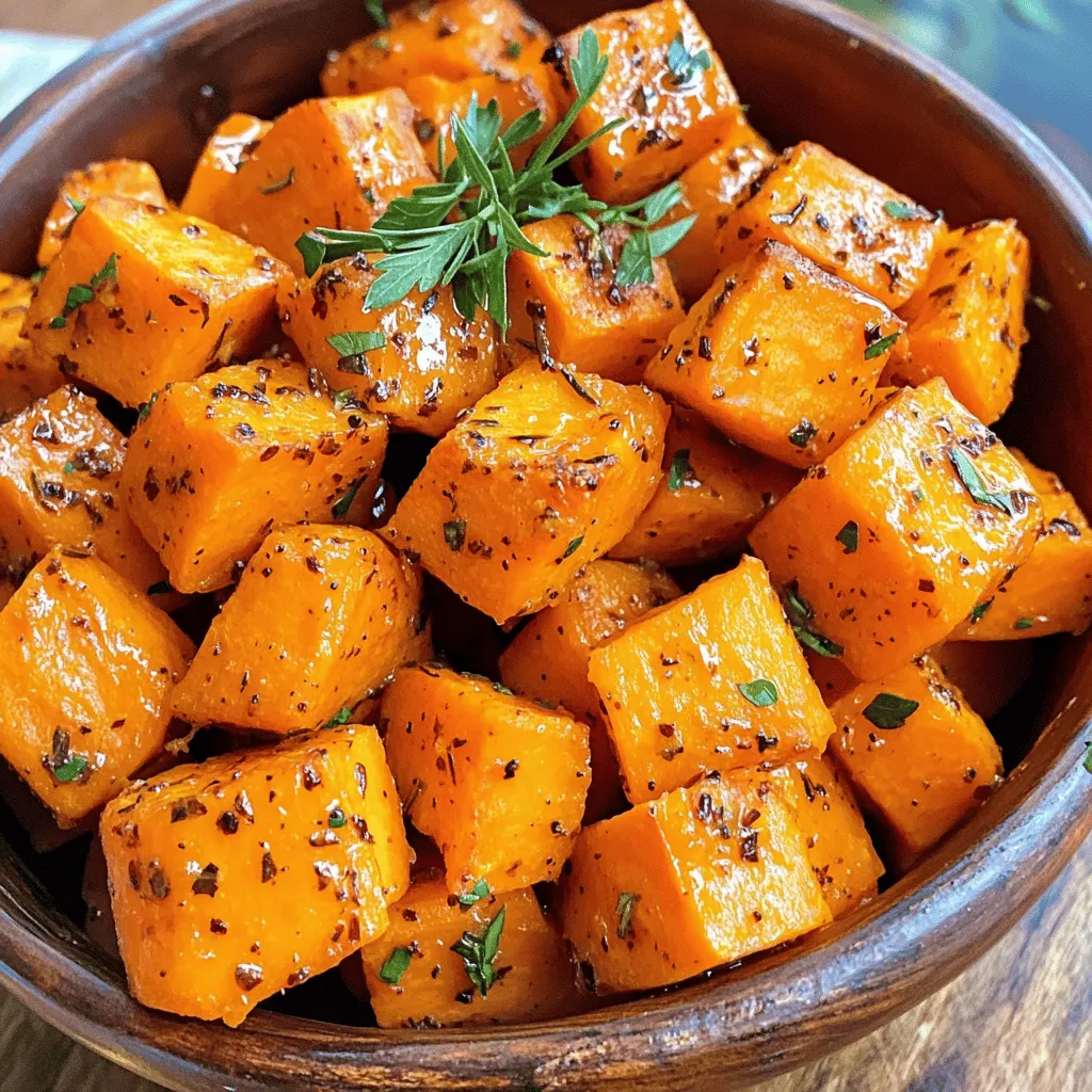 - 4 medium sweet potatoes, peeled and diced into 1-inch cubes - 4 cloves garlic, minced - 3 tablespoons olive oil Sweet potatoes are the star of this dish. They are sweet and creamy. The garlic adds a strong flavor that pairs well with the sweet potatoes. Olive oil helps everything roast nicely, giving it a golden color. - 1 teaspoon dried thyme - 1 teaspoon dried rosemary - 1 teaspoon smoked paprika Dried thyme brings a warm, earthy note. Dried rosemary adds a pine-like taste that brightens the dish. Smoked paprika gives a subtle smoky flavor that takes it up a notch. - Salt and pepper - Fresh parsley for garnish Salt and pepper enhance all the flavors. Fresh parsley adds a pop of color and freshness on top. This simple garnish makes the dish look inviting and vibrant. 1. Preheat your oven to 425°F (220°C). This step is key for crispy edges. 2. Peel the sweet potatoes. Then, dice them into 1-inch cubes. Make sure the pieces are even for best cooking. 1. In a large mixing bowl, combine the diced sweet potatoes with: - 4 cloves garlic, minced - 3 tablespoons olive oil - 1 teaspoon dried thyme - 1 teaspoon dried rosemary - 1 teaspoon smoked paprika - Salt and pepper to taste 2. Toss everything together well. You want all the sweet potato cubes coated nicely with the herbs and oil. This mix gives the sweet potatoes a great flavor. 1. Spread the sweet potatoes in a single layer on a baking sheet. Use parchment paper to help with cleanup. 2. Roast them in the oven for 25-30 minutes. Flip the sweet potatoes halfway through. This helps them brown evenly. Look for a golden color and fork-tender texture. Enjoy the amazing aroma while they cook! Choosing the right sweet potatoes For the best flavor, select medium sweet potatoes. They should feel firm to the touch. Look for vibrant color. This shows they are fresh. Avoid any soft spots or blemishes. Ensuring even cooking Cut the sweet potatoes into 1-inch cubes. This size helps them cook evenly. Spread them in a single layer on your baking sheet. Overcrowding leads to steaming, not roasting. Flip the sweet potatoes halfway through cooking. This ensures all sides get that nice golden brown. Additional herbs or spices You can mix in other herbs like oregano or basil. A pinch of cayenne adds a warm kick. These simple changes keep the dish exciting. Feel free to try different combinations. Drizzling olive oil for serving Before serving, drizzle a bit of olive oil on top. It adds shine and flavor. This small step makes a big difference. You can also sprinkle some sea salt for an extra flavor boost. Stylish serving ideas Serve the sweet potatoes in a rustic bowl. This gives a cozy feel to the dish. A touch of fresh parsley on top makes it pop. It adds color and freshness to your meal. Additional toppings for flavor Consider adding toasted nuts for crunch. Chopped pecans or walnuts pair well with sweet potatoes. You might also try a dollop of Greek yogurt. This adds creaminess and balances the sweetness. {{image_2}} You can switch up the herbs in your garlic herb roasted sweet potatoes. Try using fresh herbs, like basil or oregano. They add bright flavors. For a spicy kick, add red pepper flakes. This change brings warmth and depth to each bite. These sweet potatoes pair well with proteins. Serve them with grilled chicken or fish. They also work great alongside a juicy steak. If you want a lighter meal, toss them into salads. They add sweetness and texture to greens. This recipe is vegan-friendly. You can enjoy it without any animal products. It is also gluten-free, making it safe for those with gluten sensitivities. With these options, everyone can enjoy this tasty dish. After you enjoy your garlic herb roasted sweet potatoes, store any leftovers. Let them cool first. Place them in an airtight container. This helps keep them fresh. Store them in your fridge for up to four days. Use glass or plastic containers with lids for the best results. When it's time to reheat, you have options. You can use an oven or a microwave. The oven keeps the texture crispy. Set it to 350°F (175°C). Place the sweet potatoes on a baking sheet. Heat for about 10-15 minutes. Flip them halfway to warm evenly. The microwave is fast but may make them soft. Heat in 30-second bursts. Check often to avoid overheating. Want to save some for later? Freezing is a great option. First, let the sweet potatoes cool completely. Spread them in a single layer on a baking sheet. Freeze them for about an hour. Once frozen, transfer them to a freezer-safe bag or container. Remove as much air as possible. They can last for up to three months. When you're ready to eat, thaw them in the fridge overnight. Reheat them in the oven for the best texture. Garlic herb roasted sweet potatoes will last about 3 to 5 days in the fridge. Make sure to store them in an airtight container. This keeps them fresh and tasty. Check for any signs of spoilage before eating. Yes, you can make garlic herb roasted sweet potatoes ahead of time. You can roast them a day in advance. Just store them in the fridge after cooling. Reheat them in the oven to keep them crispy. This makes meal prep easy and saves time. Garlic herb roasted sweet potatoes pair well with many main dishes. Try them with grilled chicken or fish for a hearty meal. They also go great with a fresh salad, like a spinach or arugula mix. Adding a zesty dressing will bring more flavor to your plate. Garlic herb roasted sweet potatoes bring warmth and flavor to any meal. We explored key ingredients like sweet potatoes, garlic, and olive oil, along with herbs such as thyme and rosemary. You learned step-by-step preparation and roasting tips to achieve delicious results. I shared ways to enhance flavor and serve your dish stylishly. Remember, you can customize herbs, adjust seasonings, and easily store leftovers. Enjoy experimenting with this recipe and making it your own. Happy cooking!