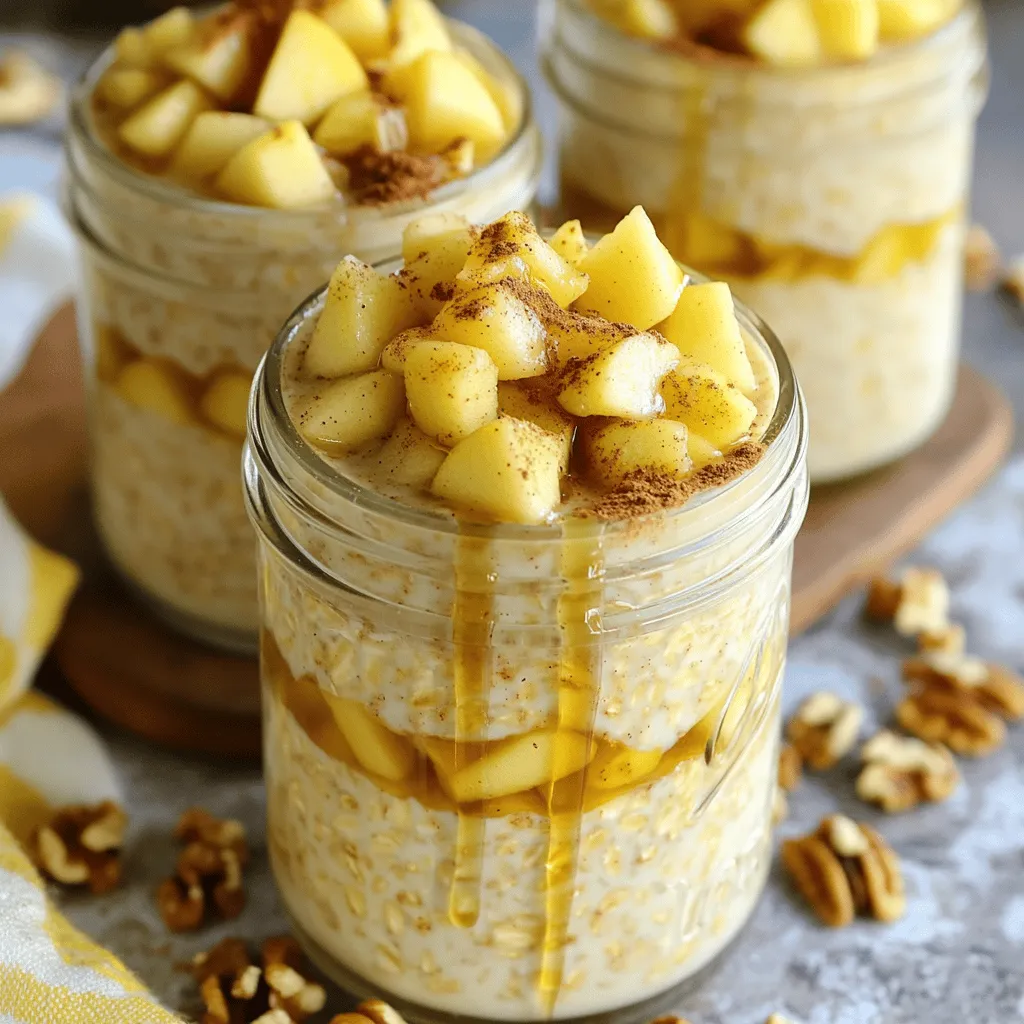 To create my tasty apple cinnamon overnight oats, you need these simple ingredients: - 1 cup rolled oats - 1 ½ cups almond milk (or any milk of choice) - 1 medium apple, diced (preferably a sweet variety like Fuji or Honeycrisp) - 1 teaspoon ground cinnamon - 2 tablespoons maple syrup (adjust to taste) - 1 tablespoon chia seeds - ¼ cup Greek yogurt (optional, for creaminess) - ¼ teaspoon vanilla extract - Pinch of salt - Chopped nuts (like walnuts or pecans) for topping (optional) If you don't have a few items, no worries! Here are some swaps: - Rolled oats: Use quick oats, but the texture may change. - Almond milk: Any milk works, like cow's milk, soy, or oat milk. - Apple: Swap for pear or banana if you want a different taste. - Maple syrup: Honey or agave syrup can sweeten instead. - Chia seeds: You can skip these, but they add fiber. - Greek yogurt: Try a plant-based yogurt for a dairy-free option. Each ingredient adds flavor and nutrition to your oats: - Rolled oats: They provide fiber, helping you feel full. - Almond milk: This milk adds creaminess and is low in calories. - Apple: Apples add sweetness and vitamins like vitamin C. - Cinnamon: This spice boosts flavor and may help lower blood sugar. - Maple syrup: This natural sweetener contains minerals and antioxidants. - Chia seeds: They are high in omega-3 fatty acids and fiber. - Greek yogurt: This adds protein and creaminess, making oats richer. - Vanilla extract: It enhances flavor without extra sugar. - Salt: A pinch of salt balances the sweetness. - Nuts: Chopped nuts add healthy fats and a crunchy texture. These ingredients combine to make a filling, healthy breakfast that you can enjoy any day! For the full recipe, check the details above. To make these tasty apple cinnamon overnight oats, start by gathering your ingredients. You will need rolled oats, almond milk, a diced apple, ground cinnamon, maple syrup, chia seeds, Greek yogurt, vanilla extract, and a pinch of salt. Here’s what to do: 1. In a medium bowl, mix the rolled oats and almond milk. 2. Add the diced apple, ground cinnamon, and maple syrup to the bowl. 3. Stir in the chia seeds, Greek yogurt, vanilla extract, and salt. 4. Make sure every ingredient blends well. 5. You can divide the mixture into two jars or airtight containers. 6. Seal the jars and place them in the fridge. Leave them overnight or for at least four hours. The key to great overnight oats is how you prepare them. Here’s how to get that perfect creamy texture: - Use rolled oats for a chewy bite. Instant oats can get mushy. - Almond milk adds a nice flavor but feel free to use any milk you like. - If you want creamier oats, add a little more Greek yogurt or a splash of milk in the morning. - Stir your oats well before eating. This helps mix the flavors. Overnight oats are all about saving time. Here are some ways to make it even easier: - Prepare your oats the night before, so breakfast is ready when you wake up. - You can make a batch for the week. Just keep them sealed in the fridge. - Use jars for easy storage and a quick grab-and-go option. - Chop your apple in advance and store it in lemon juice to prevent browning. For the full recipe, check out the details above. Enjoy your delicious apple cinnamon overnight oats! To boost flavor, try using fresh spices. Fresh cinnamon gives a strong taste. You can also add nutmeg for warmth. If you like crunch, mix in nuts or seeds. Walnuts or pecans work well. For creaminess, Greek yogurt is a great choice. It makes each bite richer and smoother. Making overnight oats is simple. You can prepare multiple jars at once. Just follow the full recipe and store them in the fridge. They stay fresh for several days. This way, you have a quick breakfast ready every morning. Grab a jar, and you are set to go! Serve your oats in clear jars to show off the layers. Add a slice of apple on top for a nice touch. A sprinkle of cinnamon adds color and flavor. If you want more sweetness, drizzle maple syrup before serving. Enjoy your delicious and healthy breakfast! {{image_2}} You can make overnight oats your own. Try adding different toppings and mix-ins. Here are some ideas: - Nuts: Add walnuts, pecans, or almonds for crunch. - Seeds: Sprinkle pumpkin seeds or sunflower seeds for extra nutrition. - Dried Fruit: Raisins, cranberries, or apricots can add sweetness. - Nut Butter: Stir in peanut or almond butter for creaminess and flavor. - Fresh Berries: Blueberries or strawberries can brighten your oats. These additions help change the taste and texture of your dish. Mix and match to find your favorite combination. While apple cinnamon is a classic, many other flavors work well. Here are a few tasty combos: - Banana Nut: Use ripe bananas and add chopped walnuts. - Berry Bliss: Mix in strawberries and blueberries for a fruity twist. - Chocolate Hazelnut: Add cocoa powder and chopped hazelnuts for a treat. - Pumpkin Spice: Stir in canned pumpkin, cinnamon, and nutmeg for fall vibes. - Coconut Mango: Use coconut milk and diced mango for a tropical flavor. These options let you explore new tastes while keeping it simple. If you want a vegan version, it’s easy to switch things up. Here are some ideas: - Milk: Substitute almond milk with oat or coconut milk. - Yogurt: Use coconut yogurt instead of Greek yogurt for creaminess. - Sweetener: Maple syrup is already vegan, but feel free to use agave nectar. - Chia Seeds: These seeds are vegan-friendly and add healthy fats. Switching to plant-based options ensures everyone can enjoy this dish. You can still enjoy delicious flavors without dairy. For the full recipe, check out the Apple Cinnamon Delight Overnight Oats. Store your Apple Cinnamon Overnight Oats in airtight containers. Glass jars work great. Keep them in the fridge to stay fresh. Make sure to seal the lids tightly. This way, they won’t absorb other food smells. You can also layer different flavors in each jar. This keeps your breakfast fun and exciting! These 