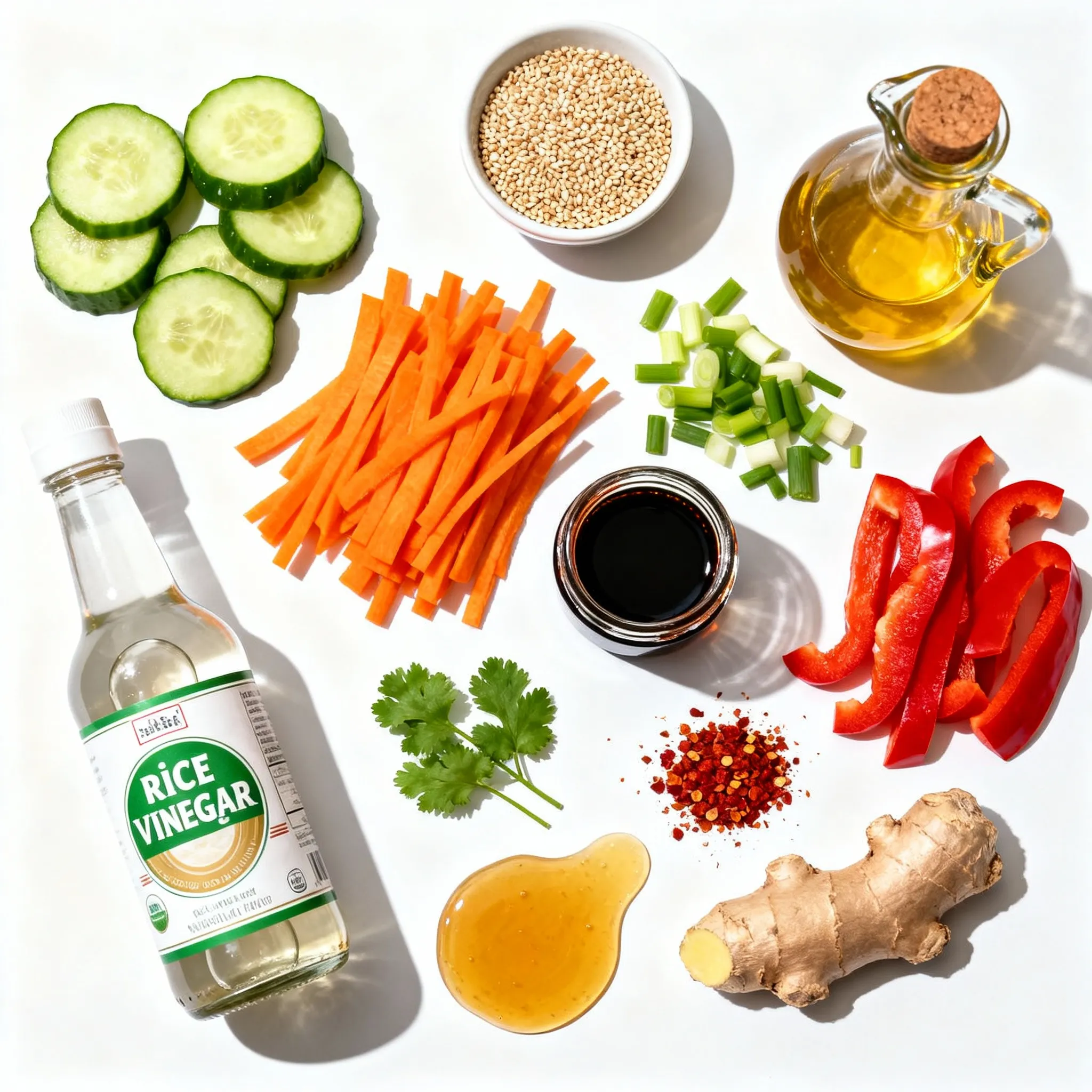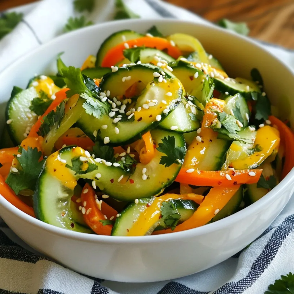 A refreshing salad featuring cucumbers, carrots, and bell peppers, dressed in a flavorful sesame vinaigrette.