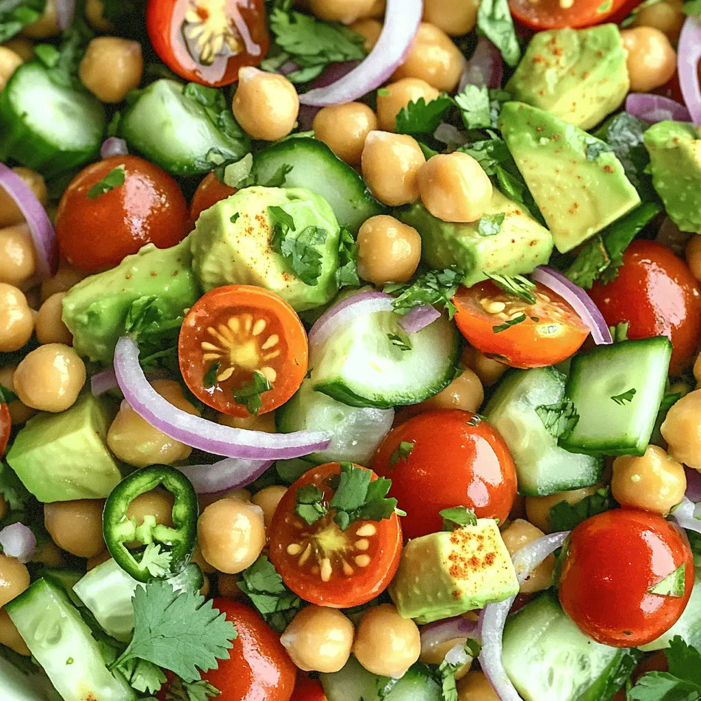 - 1 can (15 oz) chickpeas, rinsed and drained - 2 ripe avocados, diced - 1 cup cherry tomatoes, halved - 1/2 red onion, finely chopped - 1/2 cucumber, diced - 1/4 cup fresh cilantro, chopped - 1 jalapeño, finely minced (optional for spice) - 2 tablespoons lime juice - 2 tablespoons olive oil - Salt and pepper to taste - 1/2 teaspoon cumin - 1/4 teaspoon smoked paprika Chickpeas are great for your health. They are full of fiber and protein. This helps you feel full and strong. Avocados are rich in healthy fats. They also have vitamins and minerals that help your body. Eating avocados can support heart health and improve skin. When picking avocados, look for ones that feel soft when you press them gently. A ripe avocado has dark green skin. You can also check for a stem. If it comes off easily, the avocado is ripe. Avoid avocados that are too hard or have dark spots. You want the best ones for this salad. For the full recipe, check out the complete guide on how to make this tasty dish! To make a great avocado chickpea salad, start with the chickpeas. Rinse one can of chickpeas under cold water. Drain them well in a colander. This helps remove excess salt and makes them taste better. Next, take two ripe avocados. Cut them in half, remove the pit, and scoop out the flesh. Dice the avocado into small pieces. Now, let’s add color! Take one cup of cherry tomatoes and slice them in half. Grab half a red onion and chop it finely. Lastly, take half a cucumber and dice it. Combine all of these ingredients in a large mixing bowl. For the dressing, you need a few simple ingredients. Gather two tablespoons of lime juice, two tablespoons of olive oil, half a teaspoon of cumin, and a quarter teaspoon of smoked paprika. Add salt and pepper to taste. In a small bowl, whisk the lime juice and olive oil together. Then, mix in the spices. Make sure it’s well combined. This dressing will bring all the flavors together. Now it’s time to assemble the salad! Pour the dressing over the chickpeas and veggies in the large mixing bowl. Toss the salad gently to mix everything. Be careful not to mash the avocado pieces. To keep the avocado fresh, try to serve the salad right away. If you need to store it, add the dressing just before serving. This way, the avocado stays nice and green. Enjoy your colorful and tasty avocado chickpea salad! For the full recipe, see the earlier section. To keep leftover salad fresh, use an airtight container. This helps reduce air exposure. Place a piece of plastic wrap directly on the salad before sealing the lid. This extra layer keeps moisture in. Store the salad in the fridge. Consume within two days for the best taste. For meal prep, make the dressing in advance. Store it separately from the salad. Mix it in just before serving. This way, your greens stay crisp and your avocados remain green. Spices and seasonings can boost flavor. I recommend adding a pinch of garlic powder or chili flakes. These add warmth without overpowering the salad's taste. Fresh herbs are a great addition too. Try basil or parsley for a new twist. They bring freshness and color. You can also mix in some dill for a unique flavor. Use your creativity to find what you love best! For the full recipe, follow the steps I’ve shared. Enjoy your fresh and tasty Avocado Chickpea Salad! {{image_2}} You can make the avocado chickpea salad your own by adding more veggies. Bell peppers add a nice crunch and color. You can also toss in corn for sweetness. Carrots and radishes give it a fresh bite too. For protein, consider adding cooked chicken or tofu. These options make the salad heartier. If you like seafood, shrimp can also be a great addition. Mix and match to suit your taste! You can easily change up the dressing for this salad. A simple homemade option is mixing yogurt and lime juice. This gives a creamy and tangy flavor. You can also try a honey mustard dressing for a sweet twist. If you prefer store-bought options, look for vinaigrettes. A lemon vinaigrette or a balsamic dressing works well. They add a zesty kick to the salad. Check labels for healthy choices with low sugar. You can find the full recipe to explore more about making this dish. To keep your leftover avocado chickpea salad fresh, use an airtight container. This helps prevent air from getting in. Regular containers may not seal well. They can let moisture escape and cause the salad to dry out. Always refrigerate your salad right after serving. This keeps it safe to eat later. For the best quality, eat the leftovers within two days. The avocados may brown, but the taste will still be good. If you want to prevent browning, add a bit more lime juice before storing. Can you freeze avocado chickpea salad? The answer is no. Freezing this salad can ruin the texture of the avocados. They turn mushy when thawed. Instead, if you want to prep in advance, freeze the chickpeas and vegetables separately. You can mix them fresh with the dressing later. If you do freeze the chickpeas, thaw them overnight in the fridge before using. This way, you will enjoy a tasty salad without textural issues. For best practices: - Store chickpeas in a freezer-safe bag. - Keep veggies in a separate bag. - Thaw in the fridge overnight when ready to use. For the full recipe, check out the Avocado Chickpea Fiesta Salad. What can I add to avocado chickpea salad? You can add many things to this salad. Try bell peppers for crunch. Corn adds sweetness. You can also mix in cheese for creaminess. Fresh herbs like parsley or dill brighten the flavor. If you want some protein, add grilled chicken or tofu. How long does avocado chickpea salad last in the fridge? This salad stays good for about two days in the fridge. Keep it in an airtight container. The avocado may brown a bit, but the taste stays nice. If you want it fresh, eat it sooner. Is it healthy to eat avocado every day? Yes, eating avocado daily can be healthy. They are high in good fats. They also provide fiber, vitamins, an