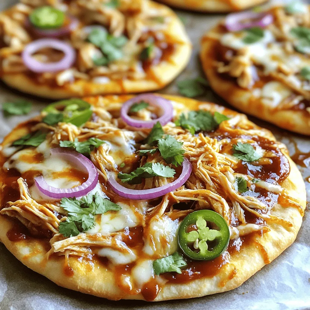 To make BBQ chicken flatbread pizza, you will need: - 2 flatbreads (store-bought or homemade) - 1 cup cooked chicken breast, shredded - 1/2 cup BBQ sauce - 1 cup shredded mozzarella cheese - 1/2 cup red onion, thinly sliced - Olive oil for brushing - Salt and pepper to taste These ingredients form the base of your delicious pizza. The flatbreads give a nice crunch, while the chicken and BBQ sauce add rich flavor. You can make this pizza your own by adding: - 1/2 cup fresh cilantro, chopped - 1/4 cup sliced jalapeños (optional, for spice) Adding cilantro gives a fresh taste. If you like heat, jalapeños are a great choice. Feel free to mix and match based on your taste! If you're missing something, here are some swaps you can try: - Use rotisserie chicken instead of cooked chicken breast. - Any cheese can work, like cheddar or pepper jack. - For a vegan option, try plant-based chicken and vegan cheese. These swaps keep the dish tasty and fun. Don't hesitate to get creative! 1. Preheat your oven to 425°F (220°C). This step makes sure your pizza cooks well. 2. In a medium bowl, mix the shredded chicken with 1/2 cup of BBQ sauce. Stir well so the chicken is fully coated. 3. Place the flatbreads on a baking sheet. You can use parchment paper to avoid sticking. 4. Brush each flatbread lightly with olive oil. This helps the crust get nice and crispy. 5. Spread the BBQ chicken mixture over the flatbreads. Leave a small edge around the sides for the crust. 6. Sprinkle the shredded mozzarella cheese on top of the chicken. Use enough to cover it well. 7. Add the red onion slices and jalapeños if you want some heat. Season with salt and pepper to taste. 8. Bake in the oven for 15-20 minutes. Watch for the cheese to get bubbly and golden brown. 9. Remove from the oven when done. The smell will be amazing! 10. Top with chopped cilantro for a fresh touch. It adds color and flavor. 11. Cut the flatbreads into slices. Serve them hot for the best taste. 12. You can pair this dish with a side salad or some fresh veggies. Enjoy your meal! To get a crispy flatbread, brush olive oil on each side. This helps it crisp up nicely in the oven. Bake at a high heat, like 425°F (220°C). The hot oven makes the flatbread cook fast. Keep an eye on it. You want it golden but not burned. Choose a BBQ sauce that fits your taste. If you like sweet, pick a sauce with honey or brown sugar. For tangy flavor, go for vinegar-based sauces. My favorite is a smoky sauce. It gives the chicken a nice depth. You can even mix two sauces for fun flavors! Don't forget to add salt and pepper to your pizza! They bring out the flavors. You can also sprinkle some garlic powder for extra taste. If you like heat, add more jalapeños. Fresh cilantro on top adds a fresh note. Always taste as you go to find your perfect balance! {{image_2}} You can make a tasty vegetarian BBQ flatbread pizza. Start with the same flatbreads. Instead of chicken, use 1 cup of black beans or roasted veggies. Sweet bell peppers, zucchini, and mushrooms work great. Mix these with your favorite BBQ sauce. Top with mozzarella cheese and bake as usual. You get a filling meal that even meat lovers will enjoy! For a spicy kick, I like to add jalapeños. Use 1/4 cup of sliced jalapeños as optional toppings. Mix them with the BBQ chicken. You can also use a spicy BBQ sauce instead of regular BBQ sauce. This adds heat and flavor. After baking your pizza, you can sprinkle red pepper flakes for extra spice. It's fun to challenge your taste buds! To make this pizza family-friendly, you can involve kids in the cooking process. Let them spread the BBQ sauce and top the flatbreads. They can pick their favorite toppings. You can also reduce the amount of onion if they don’t like it. Consider adding sweet corn or pineapple for a fun twist. This way, everyone gets a pizza they love, and you make great memories together. To keep your BBQ chicken flatbread pizza fresh, let it cool first. Place it in an airtight container. You can also wrap it in plastic wrap or aluminum foil. This helps keep moisture in and prevents it from getting dry. Store it in the fridge for up to three days. When you are ready to eat your leftovers, preheat your oven to 350°F (175°C). Place the flatbread on a baking sheet. Heat it for about 10-15 minutes or until hot and crispy. You can also use a microwave, but it may make the flatbread softer. If you want to save your pizza for later, freezing is a great option. Wrap the cooled flatbread tightly in plastic wrap. Then place it in a freezer bag or airtight container. It will stay good for about two months in the freezer. When you are ready to eat, thaw it in the fridge overnight before reheating. The best flatbread is one that is thick enough to hold toppings. I like to use naan or pita bread. They both have a nice texture and flavor. You can also use traditional pizza dough if you want a chewier base. Just remember to adjust the baking time if you use dough. Yes, you can prep it in advance. Mix the chicken and BBQ sauce ahead of time. You can also assemble the flatbreads and store them in the fridge. Just bake them when you are ready to eat. This makes it easy for weeknight meals or parties. To make this recipe gluten-free, choose gluten-free flatbread. Many stores sell gluten-free naan or pita. You can also make your own using gluten-free flour. Just ensure all other ingredients, like the BBQ sauce and cheese, are gluten-free too. Enjoy a delicious meal without gluten! BBQ chicken flatbread pizza is easy and fun to make. We covered the key ingredients, including substitutes and custom options. I shared simple steps for preparation and baking, plus tips for that perfect crispy crust. Remember, you can even switch things up with variations like spicy or vegetarian options. Store your leftovers right, and reheating is a breeze. Enjoy your delicious creation, and don’t hesitate to try new flavors or presentations! Your pizza nights will never be the same
