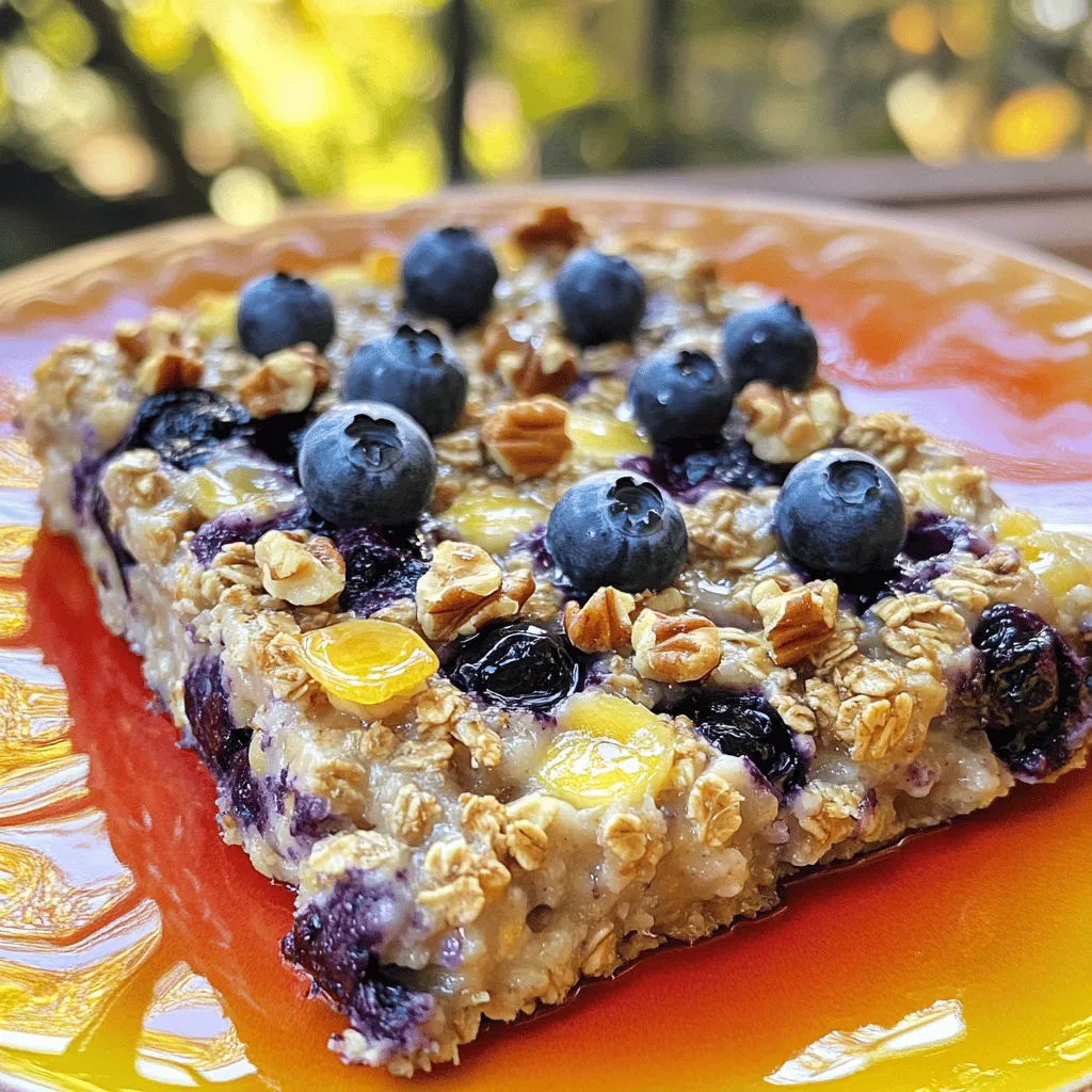 For Blueberry Banana Baked Oatmeal, you will need: - 2 cups rolled oats - 1 cup milk (dairy or plant-based) - 2 ripe bananas, mashed - 1/2 cup fresh blueberries (or frozen, thawed) - 1/4 cup maple syrup or honey - 1/4 cup chopped nuts (walnuts or pecans) - 1 teaspoon baking powder - 1 teaspoon vanilla extract - 1 teaspoon cinnamon - 1/4 teaspoon salt - 2 tablespoons melted coconut oil or butter Each ingredient plays its role. Oats form the base. Bananas add natural sweetness and moisture. Blueberries bring a burst of flavor and color. Nuts provide crunch. The milk helps bind it all together. You can easily adjust this recipe for different diets: - Use almond milk or oat milk for a dairy-free option. - Substitute maple syrup with agave syrup for a vegan choice. - If you're nut-free, skip nuts or use seeds like pumpkin seeds. - For gluten-free, ensure your oats are certified gluten-free. These swaps help everyone enjoy this dish, no matter their needs. When selecting ingredients, freshness matters: - Choose ripe bananas that are yellow with some brown spots for the best flavor. - Opt for firm, plump blueberries. Check for any mushy or moldy ones. - If using nuts, look for unsalted and fresh varieties. Smell them to avoid rancidity. - For milk, select a brand you trust. Check the expiry date for freshness. Fresh ingredients make a big difference in taste. Always pick the best! Start by preheating your oven to 350°F (175°C). This heat is perfect for baking. Next, grab a 9x9 inch baking dish and grease it with coconut oil or non-stick spray. This step helps prevent sticking. In a large bowl, mix together 2 cups of rolled oats, 1 teaspoon of baking powder, 1 teaspoon of cinnamon, and 1/4 teaspoon of salt. Stir well to blend. In another bowl, mash 2 ripe bananas until smooth. Whisk in 1 cup of milk, 1/4 cup of maple syrup or honey, 1 teaspoon of vanilla extract, and 2 tablespoons of melted coconut oil or butter. This wet mixture binds everything together. Now, combine the wet and dry mixtures. Stir gently until they just mix. Avoid over-mixing. Next, fold in 1/2 cup of fresh blueberries and 1/4 cup of chopped nuts. Save a few blueberries and nuts for topping. Pour this mixture into the greased baking dish and spread it evenly. Top it with the reserved blueberries and nuts. Bake for 25-30 minutes. You’ll know it’s ready when the center feels firm and the top is golden. To achieve the best texture, be sure not to over-bake. Check it a few minutes early. If the edges start to brown too much, cover the dish with foil. Let it cool for a few minutes after baking. This cool-down helps it set up nicely. When serving, a drizzle of maple syrup or a dollop of yogurt adds a nice touch. Use a colorful plate for great presentation. Enjoy your warm, tasty baked oatmeal! You can prepare Blueberry Banana Baked Oatmeal the night before. Mix the dry and wet ingredients as the recipe shows. Then, store them in separate bowls in the fridge. In the morning, combine them and bake. This saves time and makes breakfast quick. Serve this baked oatmeal warm. A few extra blueberries on top look nice. Drizzle some maple syrup or add a dollop of yogurt for creaminess. You can also pair it with fresh fruit or nuts to add more flavor and crunch. To boost flavor, add a pinch of nutmeg or a splash of almond extract. For texture, try adding seeds like chia or flaxseed. You could also swap out some oats for shredded coconut. These tweaks make the dish more exciting and tasty. {{image_2}} You can change the fruit in your baked oatmeal to mix things up. Try mixing in diced apples for a sweet crunch. Chopped peaches add a juicy flavor. For a tropical twist, use mashed mango or pineapple. You can also swap blueberries for raspberries or strawberries. Each fruit brings its own taste and texture. Enjoy the fun of creating your own version! If you need a gluten-free dish, choose certified gluten-free rolled oats. Most oats are safe, but check the label. You can also use almond milk or coconut milk instead of regular milk. This makes the dish safe for people with gluten sensitivities. Your baked oatmeal will still taste great while being gluten-free. To make your baked oatmeal nut-free, simply skip the nuts. You can add seeds like pumpkin or sunflower seeds for crunch. You can also use coconut flakes for a hint of sweetness. These options keep your dish tasty while being safe for those with nut allergies. Get creative and customize it for your needs! To store your leftover blueberry banana baked oatmeal, first, let it cool completely. This step keeps moisture from building up. Once cool, cut it into squares. Place the squares in an airtight container. You can keep it in the fridge for up to five days. If you want to enjoy it later, storing it properly is key. You can freeze this oatmeal for up to three months. To freeze, wrap each square tightly in plastic wrap. Then, place the wrapped squares in a freezer bag. Make sure to remove as much air as possible. Label the bag with the date. When you crave it, just take out a square and let it thaw in the fridge overnight. Reheat your oatmeal for a quick breakfast. You can use a microwave or an oven. For the microwave, place a square on a plate. Heat it for about 30 seconds to a minute. Check to see if it's warm. If using the oven, preheat it to 350°F (175°C). Place the square in a baking dish and cover it with foil. Heat for about 10-15 minutes. Enjoy it warm, and feel free to add some fresh blueberries or a drizzle of maple syrup for extra flavor! Yes, you can use quick oats. They will create a softer texture. However, rolled oats hold their shape better. This helps the oatmeal stay chewy. If you use quick oats, reduce the baking time slightly. Keep an eye on it while baking. To make this recipe vegan, swap the milk for any plant-based milk. Almond, oat, or soy milk all work well. Use maple syrup instead of honey, as honey is not vegan. Lastly, you can use coconut oil instead of butter.