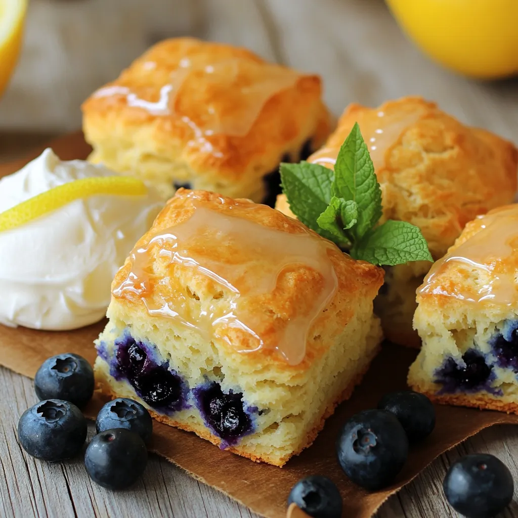 - 2 cups all-purpose flour - 1/4 cup granulated sugar - 1 tablespoon baking powder - 1/2 teaspoon salt - 1/2 cup unsalted butter, cold and cubed - 1 cup fresh blueberries (or frozen, if unavailable) - Zest of 1 large lemon - 1/2 cup heavy cream - 1 large egg - 1 teaspoon vanilla extract - 1 tablespoon lemon juice This recipe uses common ingredients, making it easy to find them at your local store. If you need a substitute for all-purpose flour, you can use whole wheat flour. It will change the flavor and texture a bit, but it works. For a dairy-free option, swap heavy cream with coconut cream. You can also use vegan butter instead of unsalted butter. Frozen blueberries work well if fresh ones are not available. Just toss them in flour before adding them to the dough. This helps keep them from sinking. Make sure to zest the lemon before juicing it. The zest gives a bright flavor to the scones. You can play with the sugar amount too. If you want less sweetness, cut it down to 3 tablespoons. Remember, it’s all about your taste! 1. First, preheat your oven to 400°F (200°C). This step is key for perfect scones. Line a baking sheet with parchment paper to make cleanup easy. 2. In a large mixing bowl, whisk together the dry ingredients. Combine 2 cups of all-purpose flour, 1/4 cup of granulated sugar, 1 tablespoon of baking powder, and 1/2 teaspoon of salt. Mix well until everything is blended. 3. Next, add 1/2 cup of cold, cubed unsalted butter to the dry mix. You can use a pastry cutter or your fingers for this. Mix until the mix looks like coarse crumbs. 4. Now, gently fold in 1 cup of fresh blueberries and the zest of 1 large lemon. Be careful not to crush the berries. 5. In another bowl, whisk together 1/2 cup of heavy cream, 1 large egg, 1 teaspoon of vanilla extract, and 1 tablespoon of lemon juice. Mix until it is all combined. 6. Pour this wet mixture into the dry mix. Stir until just combined. Do not overmix. This is very important. Overmixing makes the scones tough instead of light and fluffy. 7. Turn the dough out onto a lightly floured surface. Knead it gently a few times until it comes together. Shape the dough into a circle about 1 inch thick. 8. With a sharp knife, cut the circle into 8 wedges. Place them on the prepared baking sheet. Make sure to space them about 2 inches apart. 9. Bake your scones in the preheated oven for 18-20 minutes. Look for a light golden color on top to know they are ready. 10. Once baked, remove the scones from the oven. Let them cool slightly on a wire rack. For a special touch, drizzle with a simple lemon glaze. Just mix powdered sugar with lemon juice for sweetness. Remember, don’t rush through these steps. Each one builds flavor and texture. Enjoy the process! To make fluffy scones, start by mixing the dry ingredients well. Combine flour, sugar, baking powder, and salt in a large bowl. Use a whisk to blend them evenly. Next, add cold, cubed butter. This is key! The cold butter helps create a light texture. Use a pastry cutter or your fingers to mix until it looks like coarse crumbs. Minimize handling of the dough. Overworking it can make the scones dense. After adding blueberries and lemon zest, mix gently. Just fold until combined, then form the dough into a circle. Pair your scones with tea or coffee for a delightful treat. They also taste great with clotted cream or lemon curd. For presentation, serve scones warm on a nice plate. Add a few fresh blueberries and a sprig of mint for color. This makes your dish look even more inviting! {{image_2}} You can easily change the flavor of your blueberry lemon scones. Try using different fruits like raspberries, cranberries, or even peaches. Each fruit adds its own twist. If you want a unique flavor, consider adding spices. A pinch of cinnamon or nutmeg can warm your scones. You can also try zesting other citrus fruits. Lime or orange zest gives a fresh kick to the scone. If you need gluten-free scones, swap the all-purpose flour for a gluten-free blend. Many brands work well in baking. Just make sure it has a good mix of ingredients. For a vegan version, use plant-based butter and almond milk instead of heavy cream. You can also replace the egg with a flax egg. To make a flax egg, mix 1 tablespoon of ground flaxseed with 3 tablespoons of water. Let it sit for five minutes to thicken. This way, everyone can enjoy these tasty scones! To keep your blueberry lemon scones fresh, store them in an airtight container. This keeps moisture in and prevents them from drying out. Place a piece of parchment paper between layers if you stack them. For short-term storage, leave them at room temperature for up to two days. If you want to keep them longer, freezing is a great option. To freeze your scones, wrap each one in plastic wrap. Then, place them in a freezer-safe bag or container. They can last for up to three months in the freezer. When you are ready to eat them, let the scones thaw in the fridge overnight. This keeps them moist and soft. When it comes to reheating, you have a few options. The oven is best for keeping the scones nice and crisp. Preheat your oven to 350°F (175°C). Place the scones on a baking sheet and heat them for about 10 minutes. This will bring back their fresh-baked taste. If you’re in a hurry, a microwave works too. Place a scone on a microwave-safe plate. Heat it for about 10 to 15 seconds. Be careful not to overheat, or they might get tough. Enjoy your warm scones with your favorite drink or spread! Can I use frozen blueberries? Yes, you can use frozen blueberries in this recipe. Just toss them in flour before adding to the dough. This helps prevent them from sinking. The flavor will still shine through, making your scones delicious. How do I know when the scones are done baking? You will know the scones are done when they turn lightly golden on top. A toothpick inserted in the center should come out clean. Baking takes about 18 to 20 minutes, so keep an eye on them. Can I prepa
