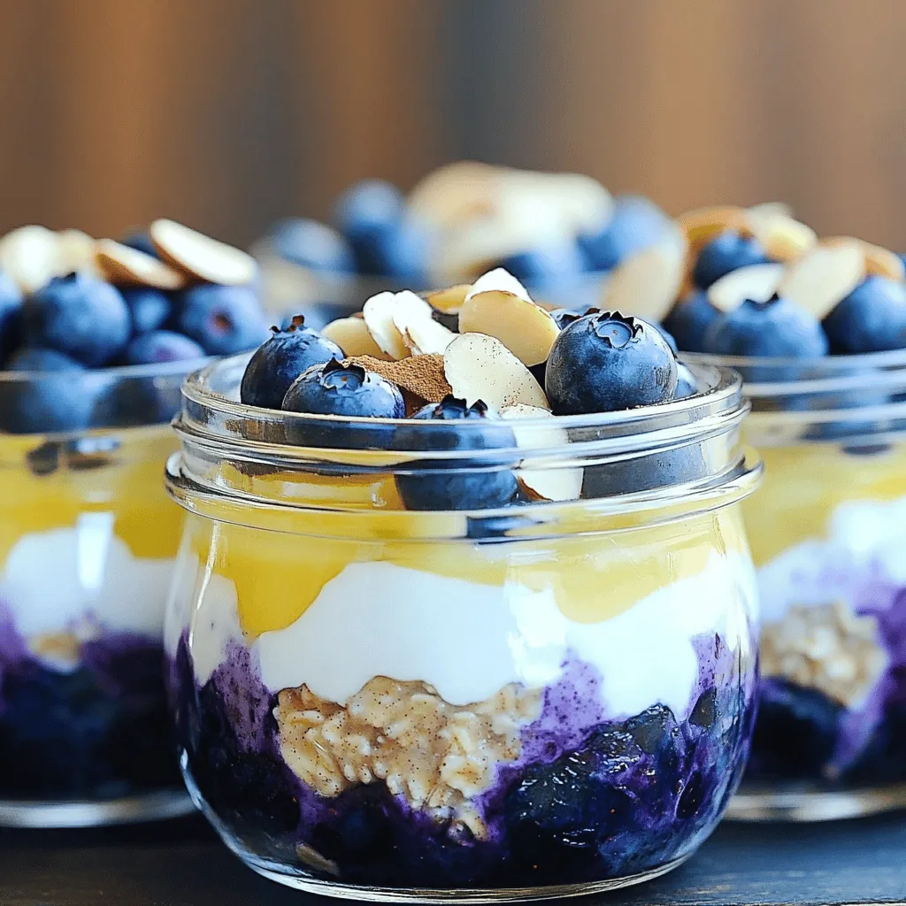 - 1 cup rolled oats - 1 cup almond milk (or milk of your choice) - 1/2 cup Greek yogurt (plain or vanilla) - 1/2 cup fresh or frozen blueberries - 2 tablespoons honey or maple syrup - 1/2 teaspoon vanilla extract - 1/2 teaspoon ground cinnamon - 1 tablespoon chia seeds (optional) - 1/4 cup protein powder (vanilla or unflavored) - A pinch of salt - Optional toppings: sliced almonds or walnuts Gather these ingredients before starting. Each one adds to the flavor and nutrition. The rolled oats provide a hearty base. Almond milk keeps it light and creamy. Greek yogurt adds protein and richness. Blueberries bring natural sweetness and color. Honey or maple syrup enhance the flavor. Vanilla extract and cinnamon round out the taste. Chia seeds boost fiber and protein. The protein powder gives an extra kick. Salt balances the flavors. Sliced almonds or walnuts can add a nice crunch on top. This blend of ingredients makes a protein-packed delight. It suits busy mornings well. You can prepare it the night before and enjoy it the next day. - In a large bowl, combine the rolled oats and almond milk. - Add Greek yogurt, honey, vanilla extract, ground cinnamon, chia seeds, and protein powder. - Mix well until everything is combined. - Gently fold in the blueberries. This helps keep them whole. - Divide the mixture into jars or bowls. - Seal each jar tightly with a lid. - Place them in the fridge overnight. - In the morning, stir the oats well. - If you want, add a splash of almond milk. - Top with more blueberries or sliced almonds. - Enjoy your tasty, protein-packed breakfast! - Always ensure oats are fully submerged in the liquid. This helps them soften nicely. - Use airtight containers for freshness. This keeps your oats tasty for longer. - Adjust sweetness to taste. You can add more honey or maple syrup if you like it sweeter. - Substitute dairy ingredients as needed. Use almond milk, soy milk, or coconut yogurt for a dairy-free option. - Serve in clear jars for visual appeal. This shows off the lovely layers and colors. - Garnish with fruit and nuts for added texture. Sliced almonds or extra blueberries make it look great! {{image_2}} You can easily change the taste of your overnight oats. Try adding spices like nutmeg or ginger for a warm touch. If you want a new flavor, swap blueberries for other berries like strawberries or raspberries. You can even use diced apples or bananas for a sweet twist. For more protein, you can use different protein powders. Vanilla or chocolate flavors can add a fun taste. Also, you can add nut butter like almond or peanut butter for a creamy texture. Seeds like pumpkin or sunflower seeds also pack a protein punch. If you need gluten-free oats, look for certified gluten-free brands. This makes your dish safe for those with gluten issues. For a dairy-free version, opt for plant-based yogurt and milk like coconut or soy. This way, you can enjoy the same great taste without dairy. You can store your Blueberry Muffin Overnight Oats in the fridge for up to 3 days. This keeps them fresh and tasty. Make sure to use airtight containers to lock in the flavor. If you want to store them longer, you can freeze the oats. They stay good in the freezer for up to 2 months. When you're ready to eat, thaw them overnight in the fridge. This gives them the right texture when you’re ready to enjoy. When reheating, add a splash of almond milk. This helps bring back the creamy texture. Make sure to stir well before eating. It ensures every bite is as good as fresh! Yes, you can easily make this recipe vegan. Just use plant-based milk, like almond or oat milk. Substitute Greek yogurt with a dairy-free yogurt option. Maple syrup is a great sweetener to keep it vegan. You should let the oats sit for at least 6 hours. Overnight is best for soft oats. This time allows the oats to absorb all the flavors and become creamy. I don’t recommend using instant oats. They cook faster and can become mushy. Rolled oats hold their texture well and create a nice bite in your overnight oats. This recipe is rich in protein, fiber, and antioxidants. The oats provide energy, while Greek yogurt adds protein. Blueberries are packed with vitamins and minerals, making it a wholesome meal. Absolutely! You can add fruits like strawberries, bananas, or apples. Nuts like walnuts or almonds add crunch and healthy fats. Get creative with your favorite toppings! This blog post covered how to make tasty Blueberry Muffin Overnight Oats. You learned the key ingredients, step-by-step directions, and helpful tips for the best results. Remember, you can customize flavors and textures to fit your taste. Store these oats in the fridge or freezer for easy meals. Whipping up this delicious, healthy treat saves time and boosts energy. Enjoy crafting your own variations and make breakfast fun!