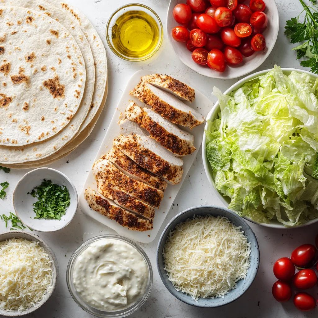 You need two chicken breasts for four wraps. Each wrap gets a tablespoon of seasoning. Use one tablespoon of olive oil to cook the chicken. For the tortillas, pick large ones to hold all the filling. The recipe calls for two cups of chopped Romaine. You will use half a cup of Caesar dressing. Add half a cup of grated Parmesan cheese for that rich flavor. For a fresh touch, use half a cup of cherry tomatoes, halved. Lastly, season with salt and pepper as you like.