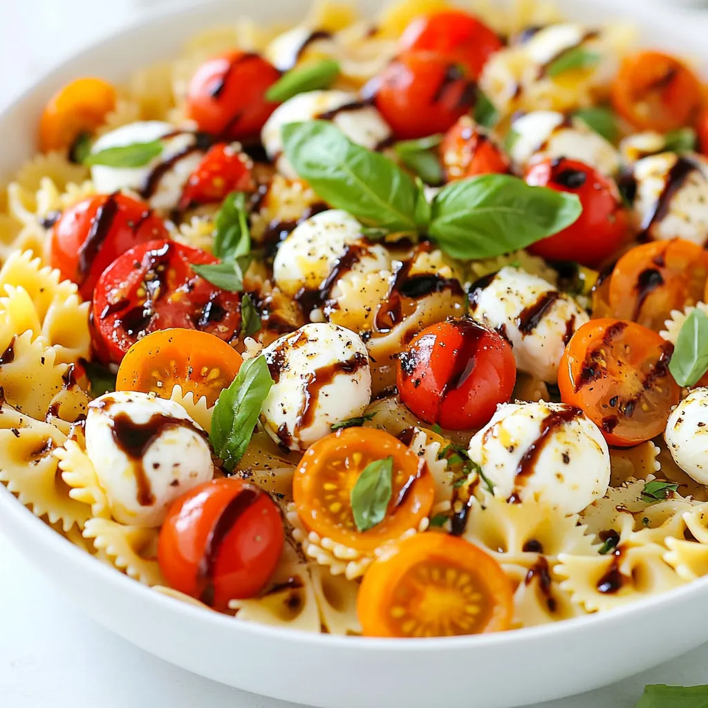 The key to a great Caprese pasta salad is fresh ingredients. I always choose ripe cherry tomatoes. Their sweetness adds a burst of flavor. Fresh mozzarella balls bring a creamy texture. You can find them in most stores. Look for ones packed in water for the best taste.