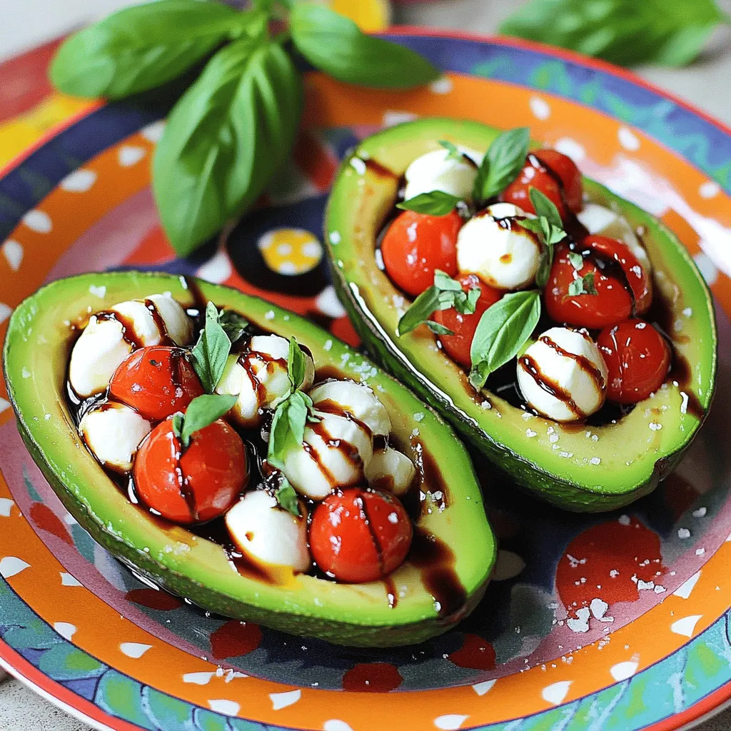 ![- 2 ripe avocados - 1 cup cherry tomatoes, halved - 1 cup mozzarella balls (bocconcini), drained - 1/4 cup fresh basil leaves, chopped - 2 tablespoons balsamic glaze - 1 tablespoon olive oil - Salt and pepper to taste - Pinch of red pepper flakes (optional) To make Caprese stuffed avocados, you need ripe avocados. Ripe avocados feel slightly soft when you gently press them. Look for dark green to black skin. Avoid any with large dark spots or cracks. When you buy avocados, store them at room temperature until they ripen. Once ripe, you can put them in the fridge to slow down the process. This way, they stay fresh longer. Always check your avocados for ripeness before using them. A good avocado makes this dish shine. For the full recipe, visit the Caprese Stuffed Avocados section. To start, you need to halve the avocados. Cut them lengthwise and twist to separate the halves. Carefully remove the pit with a spoon or knife. Next, create the cavity. Use a spoon to scoop out some flesh from each half. This makes space for the filling but be careful not to break the skin. Set aside the scooped avocado flesh for later use. Now, let’s make the filling. In a medium bowl, combine the halved cherry tomatoes, mozzarella balls, and chopped fresh basil. This mix will bring fresh flavors to the dish. Dice the reserved avocado flesh and add it to the bowl. Gently toss the ingredients together to mix. Drizzle olive oil and balsamic glaze over the mixture. Add salt, pepper, and red pepper flakes if you want a kick. Toss again to blend all the flavors. It’s time to fill the avocado halves. Spoon the Caprese mixture evenly into each avocado half. Make sure to pack it in well. Drizzle a little extra balsamic glaze on top if desired. For a finishing touch, sprinkle with more basil for garnish. This adds a nice pop of color and flavor. Now, enjoy your beautiful and tasty Caprese stuffed avocados! To make the best Caprese stuffed avocados, avoid these common mistakes. First, don’t use overripe avocados. They can get mushy and taste off. Look for avocados that are firm but yield slightly to pressure. Second, don’t skimp on seasoning. A pinch of salt and pepper brings out the flavors. You can also add herbs for extra taste. A little red pepper can add a nice kick, too. Balancing flavors is key. The creamy avocado pairs well with fresh basil and juicy tomatoes. Use high-quality balsamic glaze for a sweet and tangy finish. Olive oil adds richness, so don’t forget it! Always taste your filling before you stuff the avocados. To cut avocados safely, use a sharp knife. Cut the avocado in half and twist to separate. Remove the pit carefully. I like to use a spoon to scoop out the flesh. If you want even slices, make cuts while the avocado is still in the skin. This way, you can scoop out perfect pieces. Always be careful when using a knife. Keep your fingers away from the blade. If you’re not sure, use a safety knife or let someone help you. Caprese stuffed avocados are great on their own but pair well with many sides. Serve them with crusty bread or a fresh salad. A light vinaigrette can complement the meal. For a fun twist, add some grilled shrimp or chicken on the side. For presentation, use a colorful plate. Place whole basil leaves around the edges. This will make your dish pop! Adding a drizzle of balsamic glaze on top adds a nice finish. Enjoy your beautiful and tasty dish! For the full recipe, click here: [Full Recipe]. {{image_2}} You can easily boost the protein in your Caprese stuffed avocados. Grilled chicken works well. Just dice it and mix it into your filling. You can also use shrimp for a seafood twist. Cook the shrimp until they turn pink, then chop them up. If you prefer a plant-based option, try adding tofu. Firm tofu can add a nice texture. Be sure to season it well before mixing. Spices can make your dish even better. Try adding a pinch of garlic powder or smoked paprika for extra depth. You can also switch up the dressings. Instead of balsamic glaze, try a lemon vinaigrette or a pesto drizzle. These choices can change the flavor profile completely. It’s fun to experiment! If you want to keep it vegetarian or vegan, you can swap mozzarella for vegan cheese. Many brands offer tasty options now. For gluten-free needs, this recipe is already safe. Just make sure your dressings do not contain gluten. Enjoy making it your own! To keep your Caprese stuffed avocados fresh, refrigerate them right away. Place them in an airtight container. This method helps prevent browning on the avocado flesh. Use plastic wrap to cover the container tightly. This adds extra protection against air. If you only have one half left, sprinkle lemon juice on it. The acid slows down browning. This way, your leftover avocado stays tasty for another meal. Try to eat your leftovers within one day for the best flavor and texture. You might not need to reheat Caprese stuffed avocados. They taste great cold. If you prefer warm leftovers, use a microwave. Heat on low power for about 15-20 seconds. Check if they are warm enough for your taste. You can also use the leftovers in other dishes. Try adding them to a salad or a wrap. Chop them up and mix with pasta for a quick meal. The flavors blend well with many foods, making them a great addition to your meals. Yes, you can prepare Caprese Stuffed Avocados in advance. To do this, follow these tips: - Prep the filling: You can mix the tomatoes, mozzarella, and basil ahead of time. Store it in an airtight container. - Cut the avocados last: Wait to cut the avocados until just before serving. This keeps them fresh and green. - Add lemon juice: Squeeze a little lemon juice on the avocado flesh to slow browning. - Assemble before serving: Fill the avocados right before you eat. This keeps everything fresh and tasty. If you need a mozzarella substitute, here are some great options: - Feta cheese: It adds a salty and tangy flavor. - Goat cheese: This cheese has a creamy texture an