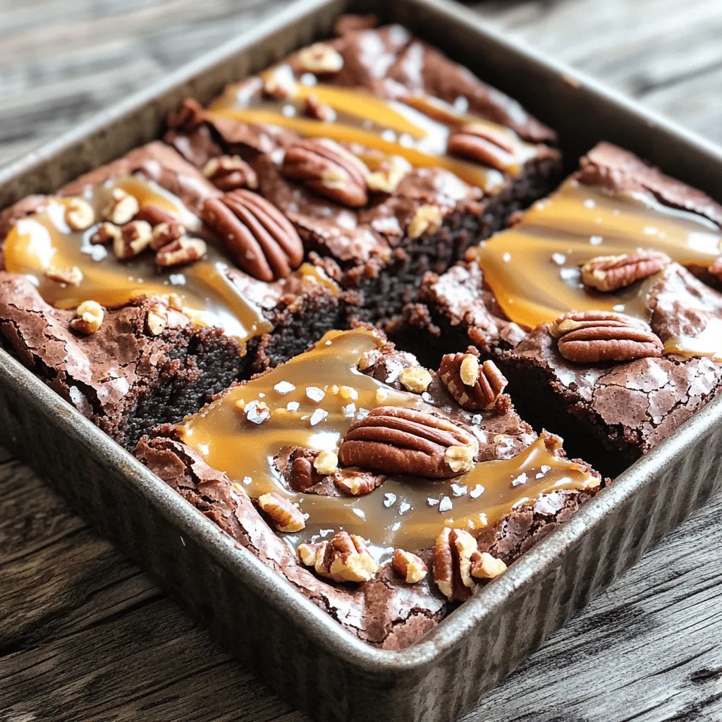To make Caramel Pecan Turtle Brownies, you need the following ingredients: - 1 cup unsalted butter (two sticks) - 2 cups granulated sugar - 4 large eggs - 1 tablespoon vanilla extract - 1 cup all-purpose flour - 1 cup cocoa powder - 1 teaspoon baking powder - 1/2 teaspoon salt - 1 cup pecans, chopped - 1 cup caramel sauce (store-bought or homemade) - Sea salt flakes for garnish Choosing the right ingredients can make a big difference. I recommend using high-quality unsalted butter like Kerrygold for a rich flavor. Use pure vanilla extract, not imitation, for the best taste. For the sugar, regular granulated sugar works well. For cocoa powder, I prefer Dutch-processed cocoa like Ghirardelli for a deep chocolate taste. Select fresh pecans, as they add crunch and flavor. If you make your own caramel sauce, ensure it’s thick enough to hold its shape when swirled into the brownies. You can swap some ingredients if you need to. If you want a dairy-free version, use a vegan butter substitute. You can replace granulated sugar with coconut sugar for a lower glycemic index. If you don't have eggs, consider using flaxseed meal mixed with water as a binder. For the flour, gluten-free all-purpose flour can work, but check that it has a binding agent. If you don’t like pecans, walnuts or almonds can be great substitutes. Start by gathering all your ingredients. This makes cooking easier and faster. You will need butter, sugar, eggs, vanilla, flour, cocoa powder, baking powder, salt, chopped pecans, caramel sauce, and sea salt flakes. Preheat your oven to 350°F (175°C). Grease a 9x13 inch baking pan and line it with parchment paper. This helps the brownies come out easily. Melt the butter in a pan over medium heat. When it is melted, mix in the granulated sugar. Stir well until you combine them fully. Next, add the eggs one by one. Mix well after each egg. Then, add the vanilla extract to the batter. In another bowl, mix the flour, cocoa powder, baking powder, and salt. Gradually add these dry ingredients to the wet mix. Be careful not to overmix. Once combined, fold in the chopped pecans. Pour half of this batter into the prepared pan. Spread it evenly. Drizzle half of the caramel sauce over this layer. Then, add the rest of the batter on top. Use a knife to swirl in the remaining caramel sauce for a fun look. Bake for 30 to 35 minutes. Use a toothpick to check for doneness. It should come out with a few moist crumbs. For chewy brownies, avoid overmixing your batter. This helps keep them soft. Make sure to let the brownies cool before cutting. This helps them set and makes cutting easier. If you like a little crunch, toast the pecans before adding them to the batter. This adds a nice flavor. For added flavor, sprinkle sea salt flakes on top before serving. For the full recipe, check back to ensure you follow every step correctly. You can boost the flavor of your caramel pecan turtle brownies in simple ways. Try adding a bit of espresso powder to the batter. This will deepen the chocolate taste. You can also mix in some dark chocolate chips for a richer flavor. If you love salt, sprinkle a bit more sea salt on top before baking. This adds a nice contrast to the sweetness. Watch out for overmixing the batter. This can make your brownies tough. You want them soft and chewy, not dry. Another mistake is baking for too long. Keep an eye on them. A toothpick should come out with a few moist crumbs, not clean. Finally, make sure you let them cool before cutting. This helps them set and makes them easier to slice. Using the right tools helps ensure your brownies turn out great. A good quality 9x13 inch baking pan is key. It helps the brownies bake evenly. Use parchment paper to line your pan. This makes removing the brownies easy. A mixing bowl, whisk, and rubber spatula make mixing the batter simple. Lastly, a toothpick is handy to test for doneness. For the full recipe, check the recipe section above. {{image_2}} If you want to switch things up, consider using different nuts. Walnuts add a nice crunch. Almonds give a sweet flavor. Pecans are classic, but you can experiment. Each nut will offer a unique twist to your brownies. Just chop them coarsely and mix them into the batter. You can easily make these brownies gluten-free. Use a 1:1 gluten-free flour mix instead of all-purpose flour. For a vegan version, replace eggs with flax eggs. Use 1 tablespoon of flaxseed meal mixed with 2.5 tablespoons of water for each egg. Also, choose a vegan caramel sauce. It’s simple and just as tasty! Want more chocolate? Add chocolate chips to the batter. Dark chocolate chips give a rich taste, while milk chocolate adds sweetness. You can also mix in peanut butter chips for a fun twist. Just fold them in with the pecans. This will create a delightful blend of flavors in every bite. For more ideas, check the Full Recipe! To keep your Caramel Pecan Turtle Brownies fresh, store them in an airtight container. This helps prevent them from drying out. You can layer the brownies with parchment paper to avoid sticking. If you want to keep them longer, consider wrapping them tightly in plastic wrap before placing them in the container. When stored properly, these brownies can last for about a week at room temperature. If you place them in the fridge, they can stay good for up to two weeks. For even longer storage, you can freeze them for up to three months. Just make sure to thaw them in the fridge before enjoying. If you prefer warm brownies, reheat them in the microwave. Place a brownie on a plate and heat for about 15-20 seconds. This brings back the gooey texture. You can also warm them in the oven. Set the oven to 350°F (175°C) and heat them for about 5-10 minutes. This works well if you want to serve them with ice cream. For the full recipe, check out the Caramel Pecan Turtle Brownies recipe above. Yes, you can make these brownies ahead of time. Let them cool completely first. Once cooled, wrap them tightly in plastic