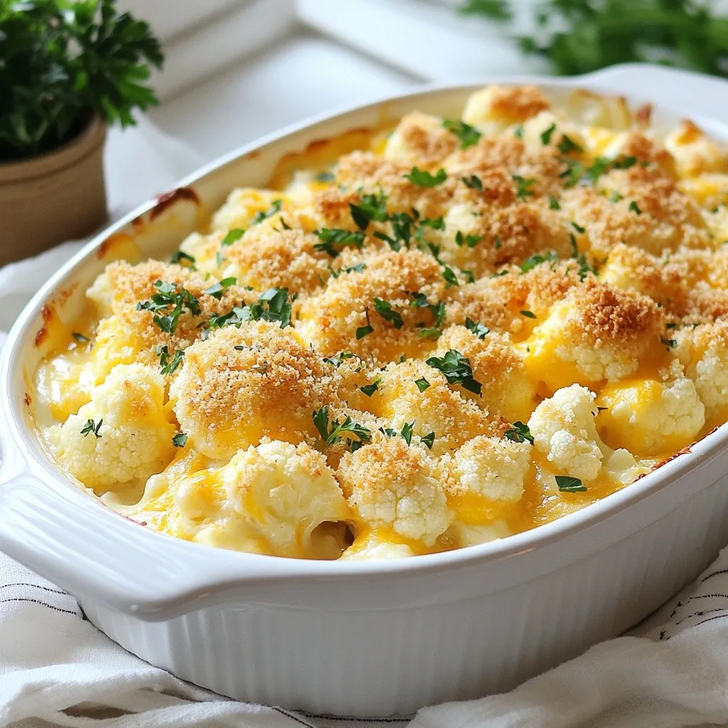 A creamy and cheesy casserole made with tender cauliflower florets, perfect as a side dish or a vegetarian main.