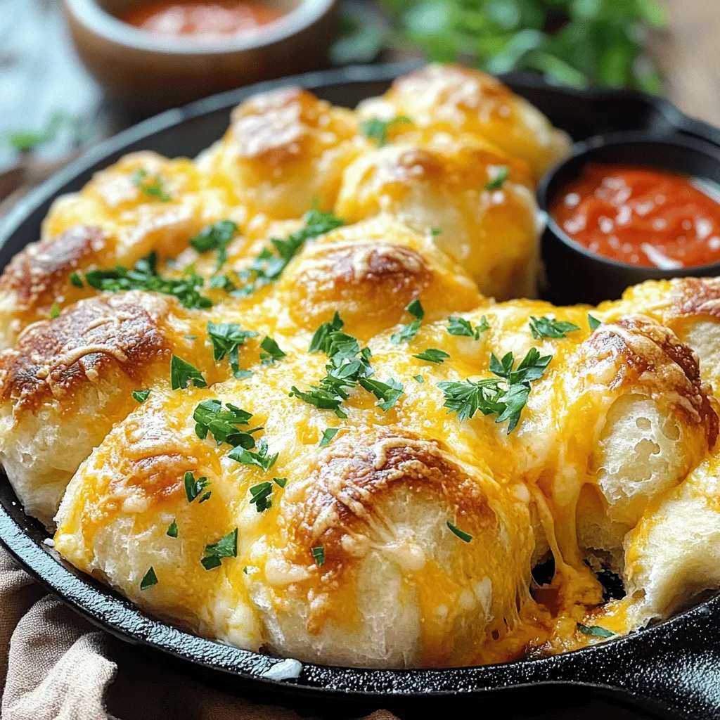 - 3 cups all-purpose flour - 1 packet (2 1/4 tsp) instant yeast - 2 tablespoons sugar - 1 teaspoon salt - 1 cup warm milk (110°F) - 1/4 cup unsalted butter, melted - 1 cup cheddar cheese, shredded - 1/2 cup mozzarella cheese, shredded - 4 cloves garlic, minced - 2 tablespoons fresh parsley, chopped - 1/4 teaspoon red pepper flakes (optional) - 1 tablespoon olive oil For my cheesy garlic pull-apart skillet bread, I focus on fresh, high-quality ingredients. Each one plays a key role in the flavor and texture. - All-purpose flour forms the base of the bread. It gives a soft and fluffy texture. - Instant yeast makes the dough rise quickly, so you can enjoy your bread sooner. - Sugar helps activate the yeast and adds a hint of sweetness. - Salt enhances all the flavors and balances the sweetness. - Warm milk is crucial for activating the yeast and adding moisture. - Unsalted butter gives richness and flavor to the bread. - Cheddar cheese provides a sharp and creamy taste. - Mozzarella cheese adds stretch and gooeyness when baked. - Garlic gives that strong, savory flavor we all love. - Fresh parsley adds a bright touch and a bit of color. - Red pepper flakes can give a slight kick. It’s optional but fun! - Olive oil helps crisp the bread and adds richness. - Additional herbs or spices can add more flavor. Think thyme, oregano, or even some Italian seasoning. - You can switch up the cheese. Try using pepper jack for heat or a blend of your favorites. - For dipping, marinara sauce is classic. You could also try garlic butter or a spicy aioli for a twist. These ingredients make my cheesy garlic pull-apart skillet bread special. Each bite is flavorful and satisfying. You can adjust based on your tastes and what you have at home. Happy baking! 1. Activating the yeast: Start by mixing warm milk, sugar, and instant yeast in a large bowl. Let it sit for about 5 minutes. This allows the yeast to foam and get active. 2. Mixing dough ingredients: Add melted butter, flour, and salt to the yeast mix. Stir until you see a soft dough form. This mixture should feel smooth and slightly sticky. 3. Kneading the dough: Place the dough on a floured surface. Knead it for about 5-7 minutes. You want it to be smooth and elastic. This step builds the dough's strength and texture. 1. First rise time: Put the dough in a greased bowl. Cover it with a clean towel and set it in a warm spot. Let it rise for 1 hour or until it doubles in size. 2. Dividing the dough: After it has risen, punch the dough down. Divide it into 20-25 small pieces. This makes it easier to fill each piece with cheese. 3. Filling with cheese mixture: In a bowl, combine cheddar, mozzarella, minced garlic, parsley, and red pepper flakes. Take each dough piece, flatten it, and place a spoonful of this cheese mix in the center. Pinch the dough closed to form a ball. 1. Arranging in the skillet: Grease a cast-iron skillet or oven-safe pan. Arrange the cheese-filled dough balls in the skillet, stacking them up. Drizzle olive oil over the top for extra flavor. 2. Second rise time: Cover the skillet with a kitchen towel. Let the dough rise again for 30 minutes. This helps the bread become fluffy. 3. Baking instructions: Preheat your oven to 350°F (175°C). Bake the bread for 25-30 minutes. Look for a golden color and bubbly cheese. Let it cool a bit before serving. Use a fork or your hands to pull apart the pieces. To get the perfect dough texture, use warm milk around 110°F. This helps the yeast rise. Mix until the dough is soft, not sticky. If it's too dry, add a bit more milk. If it's too wet, add a little flour. Knead the dough for 5-7 minutes until it feels smooth. Common dough issues include not rising or being too tough. If your dough does not rise, check your yeast. It may be old or too cold. A tough dough often means over-kneading. Try kneading less next time. For flavor profile adjustments, mix in herbs like rosemary or thyme. You can also add spices like garlic powder for depth. If you want extra garlicky goodness, increase the minced garlic to six cloves or add garlic powder to the dough. Serve this garlic bread directly from the skillet. It looks great and stays warm. Pair it with marinara sauce for dipping. This bread works well for parties, game nights, or family dinners. It’s also a fun treat for movie nights at home. {{image_2}} You can switch up the cheese for more fun. Try using gouda or pepper jack for a kick. Mixing in different cheeses adds depth to the flavor. You can also add spices or herbs to the cheese mix. Try Italian seasoning or a pinch of garlic powder for extra zest. Adding vegetables can really boost the taste. Chopped spinach or sun-dried tomatoes work well. They add color and nutrients too. If you want a sweet version, mix in cinnamon sugar. This twist gives a nice contrast to the savory bread. For gluten-free bread, swap all-purpose flour with a gluten-free blend. Make sure it is designed for baking. If you want vegan options, use plant-based milk and butter. You can also choose vegan cheese for a creamy texture. These adjustments make the recipe friendly for all diets. - Short-term storage tips: Before storing, let the bread cool completely. Wrap it in plastic wrap or foil. You can also place it in an airtight container. Store it at room temperature for up to 3 days. - Long-term storage tips: For longer storage, freeze the bread. Wrap it tightly in plastic wrap and then in foil. This keeps it fresh for up to 2 months. When ready to eat, thaw it in the fridge overnight. - Best practices for reheating pulling apart bread: To reheat, preheat your oven to 350°F. Place the bread in the oven for about 10-15 minutes. This warms it evenly and keeps it nice. - Avoiding sogginess: Avoid using the microwave, as it can make the bread soggy. If you must use it, keep the time short and check often to prevent moisture buildup. - Creative ways to use leftovers: You can turn leftover bread into croutons. Cut it into small cubes, 