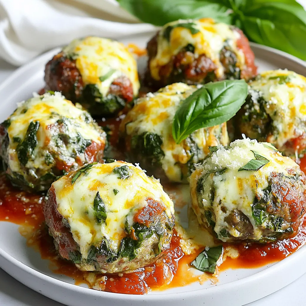 Serve the cheesy spinach stuffed meatballs on a plate, drizzled with additional marinara sauce and topped with the remaining mozzarella and Parmesan cheeses. Garnish with fresh basil leaves.