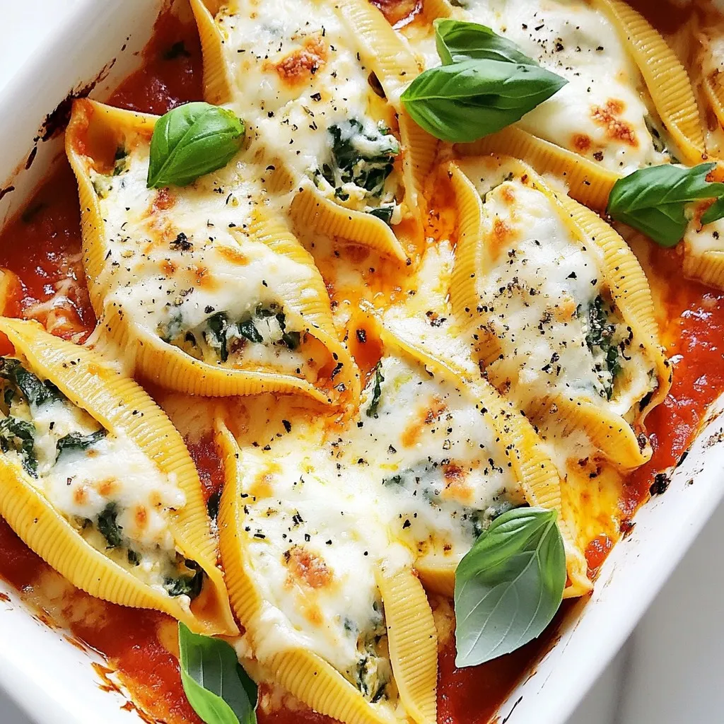 Pair your cheesy spinach stuffed shells with a fresh salad or garlic bread. A side of steamed vegetables adds a healthy touch. For garnishing, sprinkle fresh basil leaves on top right before serving. You can also add a dash of red pepper flakes for a bit of heat.