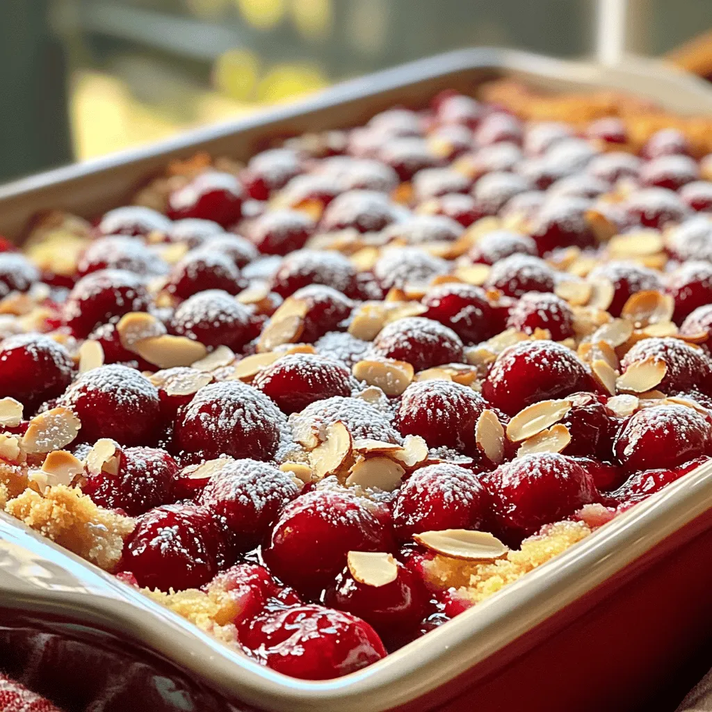 ![- Cherry pie filling: Use two cans (14.5 oz each). The filling should be sweet and flavorful. Look for brands with whole cherries. This adds a nice texture to your cake. - Sliced almonds: One cup of sliced almonds is key. They give a nice crunch and enhance the almond flavor. Plus, they contrast well with the soft cake and cherries. - Vanilla cake mix: One box (15.25 oz) of vanilla cake mix is best. It provides a sweet base and pairs well with cherries and almonds. Stick with vanilla for a classic taste. - Unsalted butter: Use half a cup of melted unsalted butter. This keeps the cake moist. The butter also helps the cake mix bake evenly. - Almond extract: One teaspoon of almond extract adds depth. It boosts the almond flavor and makes the cake more aromatic. - Vanilla extract: A half teaspoon of vanilla extract rounds out the flavors. It complements the almond and cherry taste. - Powdered sugar: Optionally, use a quarter cup for dusting. It adds a sweet finish and makes the cake look nice. - Powdered sugar for dusting: Dusting with powdered sugar is optional. It adds a touch of sweetness and looks lovely on top of the cake. - Additional toppings: Consider serving with ice cream or whipped cream. Vanilla ice cream pairs well with the cherries. Whipped cream adds a light, fluffy texture. Both toppings enhance the dessert and make it extra special. For the full recipe, check out the Cherry Almond Dump Cake . First, we need to preheat the oven. Set it to 350°F (175°C). This temperature is perfect for baking your cake evenly. While the oven heats, grab a 9x13-inch baking dish. This size works best for our dump cake. It gives enough space for all the tasty layers. Now, let's layer our ingredients. Start with the cherry pie filling. Spread it evenly across the bottom of the dish. This gives a sweet base. Next, sprinkle the sliced almonds on top of the cherries. This adds a nice crunch and flavor. In a medium bowl, mix the vanilla cake mix with the almond and vanilla extracts. Stir gently just until combined. This helps keep the cake light. Pour this mixture over the cherries and almonds. Make sure to cover as much of the filling as possible for a balanced taste. It's time to bake! Place the dish in your preheated oven. Bake for 30 to 35 minutes. Check for doneness by inserting a toothpick into the center. If it comes out clean, the cake is ready. The top should be golden brown and smell amazing. Let the cake cool for about 10 minutes before serving. Dust with powdered sugar if you like. This cake is simple yet delicious. Perfect for any gathering! For the full recipe, check the [Full Recipe]. To make the best Cherry Almond Dump Cake, avoid common mistakes. First, don’t skip the almond extract. It adds a lovely flavor. Also, ensure your butter is melted, not burnt. Burnt butter can ruin the taste. Another tip is to spread the cherry pie filling evenly. This helps the cake cook well. If the cherries are too thick, your cake may not bake right. To achieve a golden crust, keep an eye on your baking time. Bake the cake until it is golden brown. Use a toothpick to check if it’s done. If it comes out clean, your cake is ready! Get creative when serving your cake. Serve it warm and add a scoop of vanilla ice cream on top. The cold ice cream melts slightly, making it delicious. Try garnishing with more sliced almonds for a nice crunch. You can also dust powdered sugar on top for a sweet finish. For drinks, pair your cake with a hot cup of coffee or tea. A fruity drink also works well. These options complement the cherry flavor. For the full recipe, check the earlier section! {{image_2}} You can mix up the cherry almond dump cake by changing a few ingredients. If you don't have cherry pie filling, try other fruit fillings. Blueberry or peach pie filling work great too. These fruits give a different taste but still taste amazing. You can also switch out the sliced almonds for other nuts. Pecans or walnuts add a nice crunch. Each nut brings its own flavor. So, feel free to experiment with what you have on hand! Spices can boost the flavor of your cake. Try adding a dash of cinnamon or nutmeg to the cake mix. These spices add warmth and depth, making it even more delicious. If you want a chocolate twist, mix in some chocolate chips. You can also add a bit more almond extract for a stronger flavor. Vanilla or hazelnut extracts can also work well. These small changes can create a unique twist on the classic recipe. For the full recipe, refer to the Cherry Almond Dump Cake section. To keep your Cherry Almond Dump Cake fresh, use an airtight container. This helps prevent it from drying out. If you plan to eat it soon, store it in the fridge. It lasts about 3 to 5 days in the refrigerator. For longer storage, you can freeze the leftovers. Wrap the cake tightly in plastic wrap and then in aluminum foil. This keeps it safe from freezer burn. When frozen, it can last up to 3 months. Just remember to label it with the date! When reheating, it's best to use an oven. This keeps the cake's texture nice and soft. Preheat the oven to 350°F (175°C). Place the cake in an oven-safe dish and cover it with foil. Heat it for about 15 to 20 minutes, or until warm. If you use a microwave, the cake can become soggy. If you must use it, heat in short bursts. Start with 20 seconds, check, and repeat if needed. This method helps maintain some of the cake's original texture. Enjoy your delicious dessert! A dump cake is a super simple dessert. You just dump the ingredients into a pan and bake. It uses fruit filling and cake mix for an easy treat. You can also add nuts, like sliced almonds, for extra flavor. The beauty of a dump cake is its ease. You don’t need to mix or beat anything. Just layer and bake. This makes it great for busy days when you want dessert fast. Yes, you can make this recipe gluten-free! Use a gluten-free cake mix instead of regular. Many brands offer good gluten-free options that taste great. Make sur