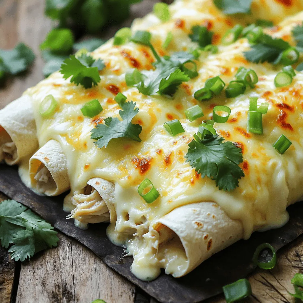 ![To make Chicken and Cheese Enchiladas Alfredo, you need a few key ingredients. Here’s what you'll need: - 2 cups cooked chicken, shredded - 1 cup cream cheese, softened - 1 cup shredded mozzarella cheese - 1/2 cup grated Parmesan cheese - 1 cup Alfredo sauce - 8 small flour tortillas - 1/2 cup diced green onions - 1/2 teaspoon garlic powder - 1/2 teaspoon onion powder - Salt and pepper to taste - Fresh cilantro for garnish (optional) These ingredients work together to create a rich and creamy dish. The chicken adds protein, while the cheeses bring a gooey texture that everyone loves. Once the enchiladas are baked, you can make them even better with toppings. Here are some fun options: - Diced tomatoes - Sliced jalapeños for heat - Avocado slices for creaminess - Extra green onions for crunch - Sour cream for tang These toppings let you customize the dish to your taste. Add them based on what you like or have at home. If you don't have some ingredients, don’t worry! Here are some easy swaps: - Use rotisserie chicken instead of cooking your own. - Swap cream cheese for ricotta or cottage cheese. - Try cheddar cheese instead of mozzarella for a sharper flavor. - Use any kind of sauce if you don't have Alfredo. These substitutes keep the dish simple and tasty. You can still enjoy Chicken and Cheese Enchiladas Alfredo with what you have on hand. For the complete recipe, check out the [Full Recipe]. First, gather all your ingredients. You will need: - 2 cups cooked chicken, shredded - 1 cup cream cheese, softened - 1 cup shredded mozzarella cheese - 1/2 cup grated Parmesan cheese - 1 cup Alfredo sauce - 8 small flour tortillas - 1/2 cup diced green onions - 1/2 teaspoon garlic powder - 1/2 teaspoon onion powder - Salt and pepper to taste - Fresh cilantro for garnish (optional) Next, preheat your oven to 350°F (175°C). In a large bowl, mix the shredded chicken, cream cheese, half of the mozzarella cheese, Parmesan cheese, garlic powder, onion powder, salt, and pepper. Stir well until everything is blended. Now it’s time to build the enchiladas. Take a tortilla and add about 1/4 cup of the chicken mixture in the center. Roll it up tightly. Place the rolled tortilla seam-side down in a greased 9x13 inch baking dish. Repeat this step for the rest of the tortillas until the dish is full. Once all the enchiladas are in the dish, pour the Alfredo sauce evenly over them. Sprinkle the remaining mozzarella cheese on top. This will create a creamy, cheesy layer that is hard to resist. Put the baking dish in the preheated oven. Bake for about 25 to 30 minutes. You want the cheese to melt and turn golden brown. Keep an eye on it. When it's done, remove it from the oven. Let it cool for a few minutes. Top with diced green onions and fresh cilantro if you want. Enjoy your Chicken and Cheese Enchiladas Alfredo! For the full recipe, check the section above. To get that wonderful cheese melt, use fresh cheese. Grate it yourself for the best results. Mix mozzarella with Parmesan for great flavor. When you bake, cover the dish with foil for the first half of cooking. This keeps moisture in and helps the cheese melt nicely. Remove the foil later to brown the top. One common mistake is overfilling the tortillas. Only use about 1/4 cup of filling. This helps with rolling and keeps everything neat. Another mistake is baking at too high a temperature. Stick to 350°F (175°C) for even cooking. Letting the dish cool for a few minutes after baking helps set the cheese. These enchiladas pair well with many sides. Try a simple green salad for freshness. Fresh avocado adds creaminess and flavor. You can also serve them with rice or beans for a heartier meal. A dollop of sour cream or guacamole on top adds a nice touch too. For a full meal, check out the [Full Recipe]. {{image_2}} For a vegetarian twist, swap the chicken for black beans or roasted veggies. You can use zucchini, bell peppers, or even spinach. Mix these with cream cheese and cheese for a creamy blend. The flavors will still shine through, making it a great dish for all. If you love heat, add sliced jalapeños to your filling. Mix them in with the chicken and cheese. You can also top the enchiladas with more jalapeños before baking. This adds a flavorful kick that heats things up. Adjust the amount based on your spice preference. To make this dish gluten-free, use corn tortillas instead of flour. They hold up well and add a nice flavor. Make sure your Alfredo sauce is gluten-free too. With this simple swap, you can enjoy enchiladas without worrying about gluten. For the full recipe and details, check out the [Full Recipe]. To keep your leftover enchiladas fresh, place them in an airtight container. Make sure to let them cool first. Store them in the fridge for up to three days. This way, you can enjoy them later without losing flavor. If you want to save enchiladas for later, freezing works great. Wrap each enchilada in plastic wrap and then in aluminum foil. This helps avoid freezer burn. You can freeze them for about three months. Just label them so you know what's inside! When you're ready to eat, reheating is easy. For best results, use an oven. Preheat it to 350°F (175°C). Place the enchiladas in a baking dish. Cover with foil to keep them moist. Heat for about 20-25 minutes. You can also use a microwave if you’re in a hurry. Just heat for a few minutes, checking often to avoid drying out. Enjoy your creamy chicken and cheese enchiladas Alfredo! For the full recipe, check out the main section. You can serve many sides with Chicken and Cheese Enchiladas Alfredo. I love a fresh salad with greens. A simple avocado salad pairs well too. You can also add rice or beans for a heartier meal. Chips with salsa or guacamole make a great crunchy side. Corn on the cob adds sweetness and color to the plate. Try topping your enchiladas with sour cream or more green onions for extra flavor. To spice up your Chicken and Cheese Enchiladas Alfredo, add jalap