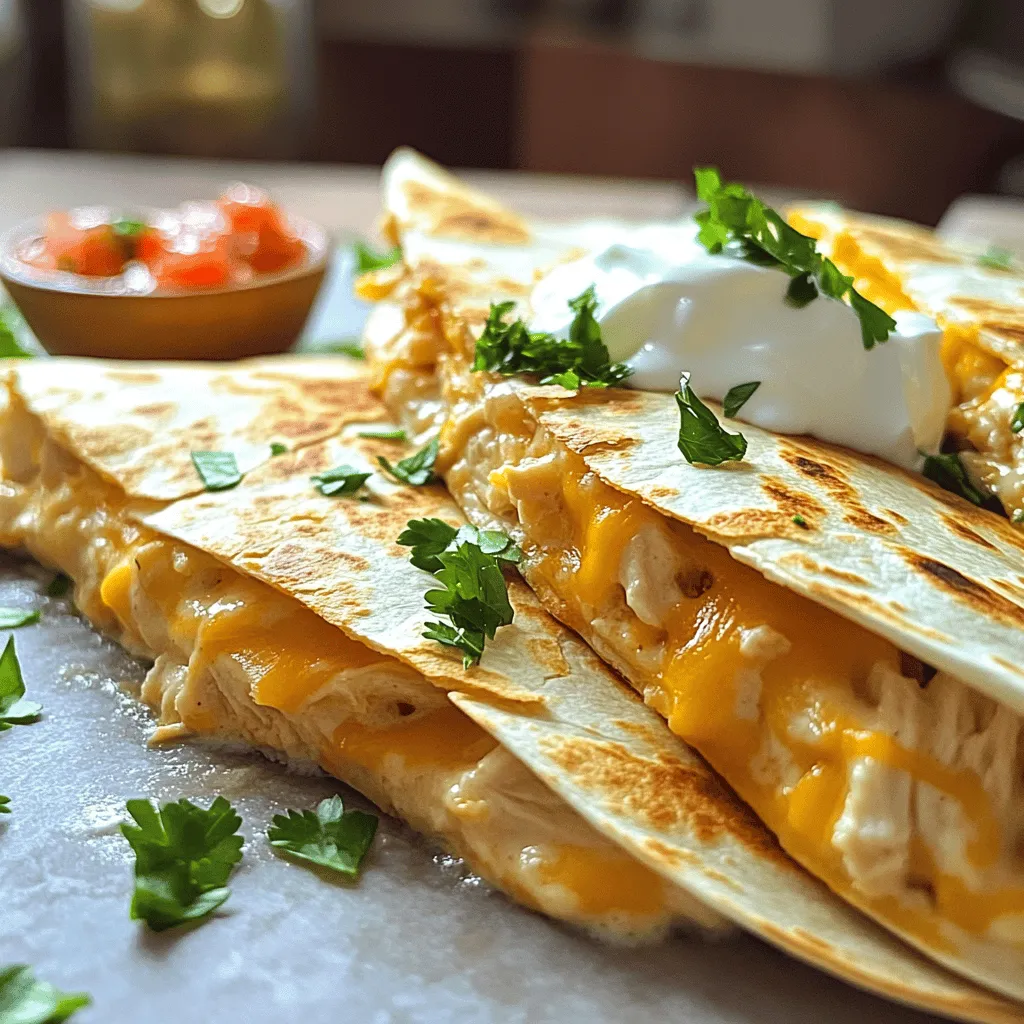 - 2 cups cooked chicken, shredded - 1 cup Alfredo sauce - 2 cups shredded mozzarella cheese - 1 cup shredded cheddar cheese - 4 large flour tortillas - 1 tablespoon olive oil - 1 teaspoon garlic powder - 1 teaspoon paprika - Salt and pepper to taste - Chopped fresh parsley for garnish - Sour cream - Salsa When I make Chicken and Cheese Quesadilla Alfredo, I focus on fresh, quality ingredients. The chicken should be tender and juicy. You can use leftover chicken or rotisserie chicken for ease. The Alfredo sauce adds a rich creaminess that makes each bite a delight. I like to use both mozzarella and cheddar cheese. Mozzarella melts perfectly, while cheddar adds a sharp flavor. The blend creates a gooey, cheesy filling that everyone loves. For the tortillas, I prefer large flour ones. They hold the filling well and crisp up nicely. Olive oil helps achieve that golden brown crust. Don’t forget to season with garlic powder and paprika. They add depth to the flavors. Adjust the salt and pepper to your taste too. I love to garnish with fresh parsley for a pop of color. If you want to take it up a notch, serve with sour cream or salsa. They add a nice contrast to the cheesy quesadilla. Check the [Full Recipe] for the details on how to bring it all together! In a large bowl, combine the following ingredients: - 2 cups cooked chicken, shredded - 1 cup Alfredo sauce - 2 cups shredded mozzarella cheese - 1 cup shredded cheddar cheese - 1 teaspoon garlic powder - 1 teaspoon paprika - Salt and pepper to taste Mix everything until smooth and well blended. This filling is the heart of your quesadilla. Next, heat a non-stick skillet over medium heat. Add 1 tablespoon of olive oil. Once hot, place one tortilla in the skillet. Scoop half of your chicken and cheese filling onto one half of the tortilla. Fold the tortilla over to cover the filling. Cook for about 3-4 minutes. You want the bottom to be golden and crispy. Then, carefully flip the quesadilla. Cook the other side for another 3-4 minutes. This ensures the cheese melts nicely. Remove the quesadilla from the skillet. Repeat these steps with the remaining tortillas and filling. After cooking, cut each quesadilla into wedges. Garnish with chopped parsley for a fresh touch. Serve these warm and enjoy the cheesy goodness! You can also add sour cream and salsa on the side for extra flavor. For the full recipe, you can check the link provided. To get that nice, crispy texture, cook your quesadilla on medium heat. This way, the tortilla gets golden without burning. If the heat is too high, the outside cooks fast, but the cheese inside stays cold. For even melting of cheese, flip the quesadilla halfway through cooking. This helps heat spread evenly and makes for gooey, melted cheese. You can jazz up your quesadilla with extra seasonings. Try adding a pinch of cumin or chili powder for a kick. If you want more flavor, consider adding diced onions or bell peppers to your filling. These ingredients can enhance the taste and add texture. Pair your quesadilla with tasty side dishes. A fresh salad or some guacamole makes a great match. For dips, sour cream and salsa are classic choices. You can also serve it with a zesty ranch or chipotle sauce for a fun twist. Enjoy your meal! {{image_2}} You can swap chicken for beef or shrimp. Beef adds a rich taste. For shrimp, you get a light, seafood twist. Cook them until they’re just done. This keeps them tender. If you want to try plant-based options, use tofu or jackfruit. Both are great at soaking up flavors. They work well with the creamy Alfredo too. Cheese is a key part of this dish. You can mix cheeses for fun flavors. Try adding pepper jack for spice or gouda for a smoky twist. Mozzarella melts well, and cheddar adds sharpness. The best cheeses for melting are mozzarella, Monterey jack, and fontina. They create that gooey texture we all love. While Alfredo sauce is classic, you can try new sauces. Homemade Alfredo can switch up flavors with herbs. Add fresh basil or sun-dried tomatoes. Other sauces work too! Consider using barbecue sauce for a sweet twist or salsa for a fresh kick. Each option gives your quesadilla a new life. To store cooked quesadillas, let them cool first. This prevents moisture buildup. Wrap each quesadilla in plastic wrap or aluminum foil. Place them in an airtight container. This keeps them fresh for up to three days in the fridge. To reheat without losing crispiness, use a skillet. Heat it on medium-low. Place the quesadilla in the skillet and cover it with a lid. Heat for about two to three minutes on each side. If using a microwave, set it to low power. Heat for 30 seconds, then check and add more time if needed. This helps keep them from getting soggy. To freeze uncooked quesadillas, assemble them but do not cook. Place them on a baking sheet, then freeze until firm. Once frozen, stack them in a freezer bag. For cooked quesadillas, let them cool, then wrap them tightly. Store them in a freezer-safe container. Use them within two months for the best taste. To make Alfredo sauce at home, you need just a few simple ingredients. Start with: - 1 cup heavy cream - 1/2 cup unsalted butter - 1 cup grated Parmesan cheese - 2 cloves garlic, minced - Salt and pepper to taste In a pan, melt the butter over medium heat. Add the minced garlic and cook for one minute. Pour in the cream and let it simmer. Next, stir in the Parmesan cheese until it melts. Season with salt and pepper. This sauce is creamy and perfect for your quesadilla. Yes, you can use whole wheat tortillas! They add a nutty flavor that complements the chicken and cheese. Whole wheat tortillas are healthier than regular ones. They have more fiber, which is good for digestion. You might notice a slight texture change, but they still taste great. To keep your quesadillas crispy, focus on a few key tips: - Use medium heat for cooking. - Don't overload with fillings; keep it balanced. - Make sure to cook each side until golden brown. -