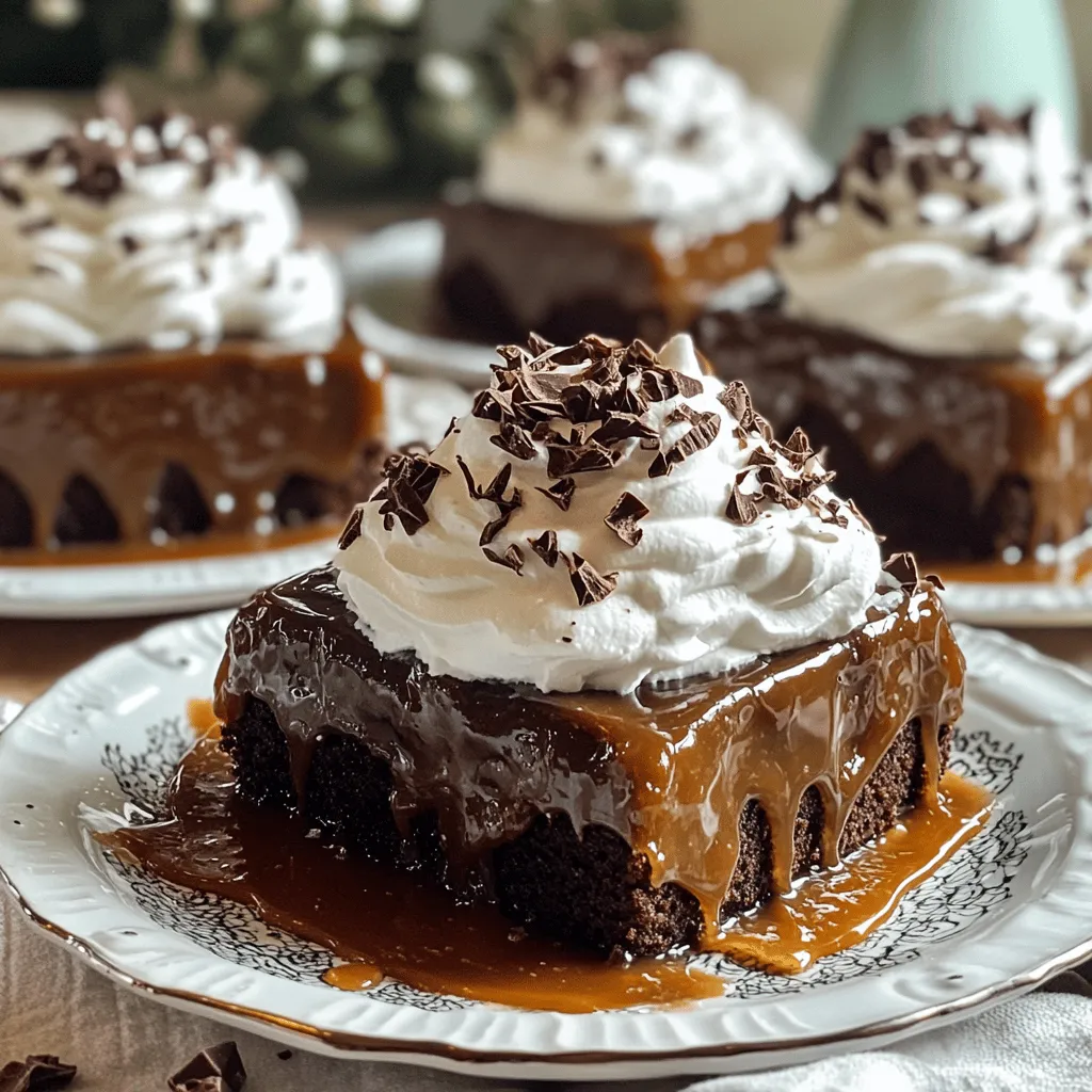 To make this cake, start with a box of chocolate cake mix. Mix it with eggs, water, and oil. Bake it in a greased 9×13 inch pan. After baking, poke holes in the warm cake. Pour a mix of sweetened condensed milk and caramel sauce over the holes. Let it cool completely. Top with whipped cream made from heavy cream, powdered sugar, and vanilla.