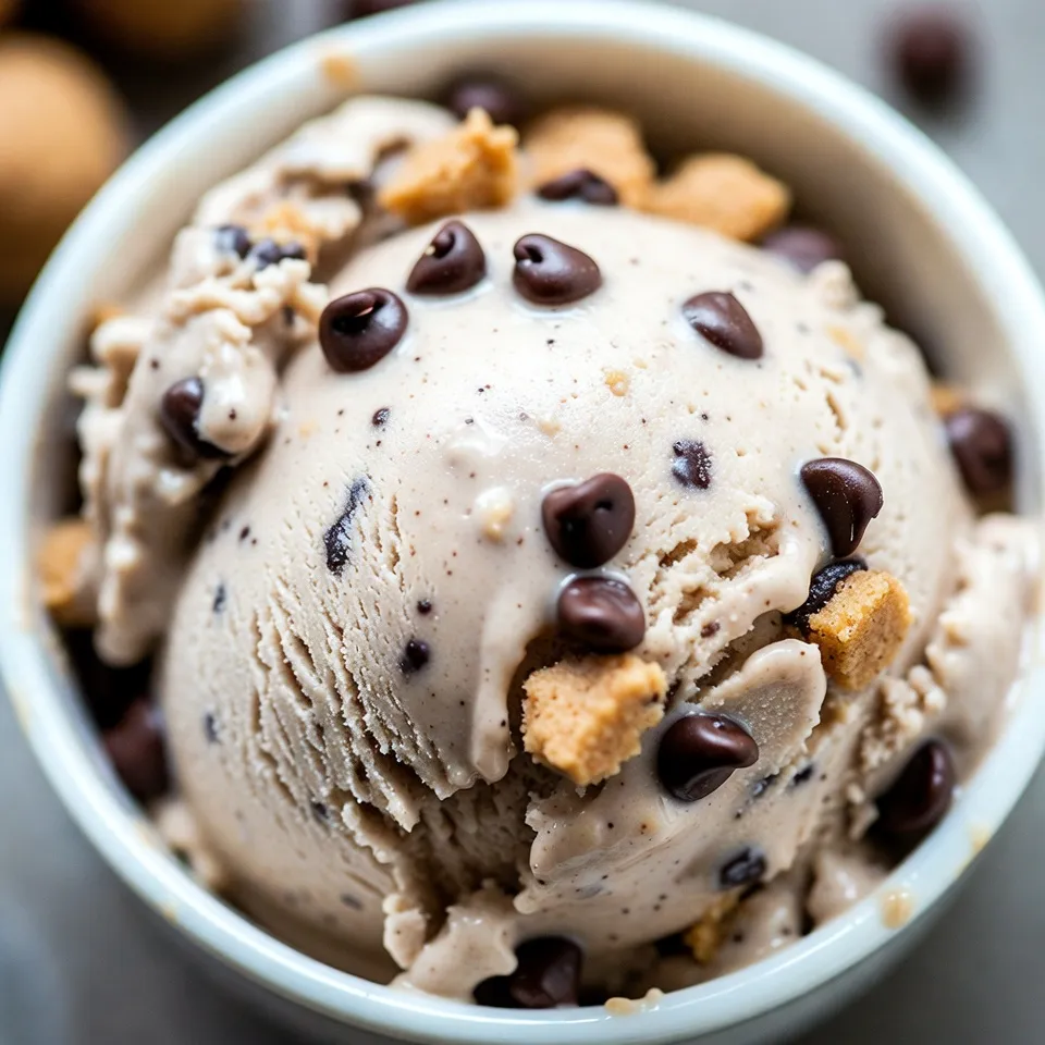 A delicious homemade ice cream featuring cookie dough and chocolate chips.