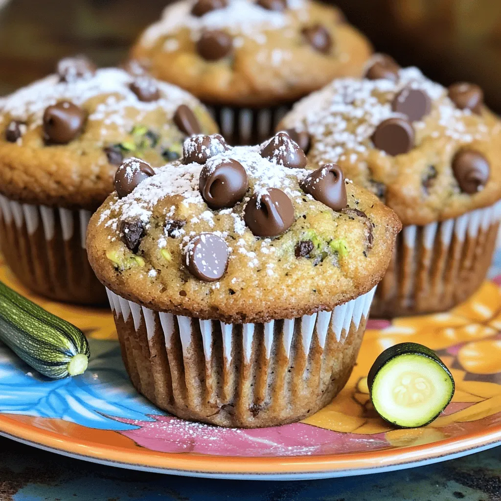 . Start by gathering your ingredients. You need a medium zucchini, which gives moisture and flavor. Grate it finely to blend well. Next, measure out your flours, sugars, and spices. It's best to have everything ready before you mix. This makes the process smooth and fun. In one bowl, mix the dry ingredients. Combine all-purpose flour, whole wheat flour, baking soda, baking powder, salt, and ground cinnamon. In another bowl, mix the grated zucchini with both sugars. Let it sit for five minutes. This step helps release moisture from the zucchini. After that, add eggs, oil, and vanilla to the zucchini mix. Stir until smooth. Now, slowly add the dry mix to the wet mix. Be gentle; you don't want to overmix. Once your batter is ready, it's time to bake. Preheat your oven to 350°F (175°C). Line your muffin tin with paper liners or grease it. Divide the batter into the muffin cups, filling them about two-thirds full. Bake for 20-25 minutes. Check with a toothpick; it should come out clean. After baking, cool the muffins in the pan for five minutes. Then, transfer them to a wire rack to cool completely. For a lovely touch, you can dust them with powdered sugar. To see the complete recipe, check the Full Recipe section. To get the best muffin texture, start with fresh zucchini. Grate it finely. This helps the zucchini mix well and adds moisture. Let the grated zucchini sit with the sugars. This step draws out extra water, making your muffins soft. When mixing the batter, be gentle. Overmixing can lead to tough muffins. Stop mixing when you see a few flour streaks. This keeps the muffins light and airy. One big mistake is not measuring your flour correctly. Too much flour makes muffins dry. Always spoon flour into your measuring cup and level it off. Another mistake is skipping the resting time for the zucchini. This step helps with moisture and flavor. Don’t forget to check your oven temperature. An oven that is too hot can burn the muffins. An oven thermometer can help with this. To boost flavor, add spices like nutmeg or ginger. A pinch can change the taste. You can also mix in extras like chopped nuts or dried fruit. These add texture and flavor. If you want a richer taste, try using dark chocolate chips instead of semi-sweet. This simple swap gives a deeper chocolate flavor. For a unique twist, add a splash of almond extract for added depth. For the complete method and ingredients, check out the Full Recipe. {{image_2}} You can easily make these muffins gluten-free. Swap the all-purpose flour for a gluten-free flour blend. Make sure it has xanthan gum for the right texture. For a vegan version, replace the eggs with flax eggs. Mix 1 tablespoon of ground flaxseed with 2.5 tablespoons of water. Let it sit for a few minutes to thicken. You can also use plant-based oil instead of vegetable oil. This keeps your muffins moist and tasty. Adding fruits or nuts can change the flavor of your muffins. You can toss in blueberries, chopped apples, or even dried cranberries. Each fruit adds a unique taste and goes well with chocolate. If you like nuts, walnuts or pecans add crunch. Just remember to chop them small so they mix well. Experiment with spices too. A pinch of nutmeg or ginger can give a warm twist. Sweetness can be adjusted based on your taste. If you want less sugar, reduce the brown and granulated sugars. You can replace some sugar with mashed bananas or applesauce for added moisture. This keeps the muffins soft. If you prefer a denser muffin, use more whole wheat flour. For a lighter texture, stick with all-purpose flour. Finding the right balance makes your muffins just how you like them. For the full recipe, check out the instructions provided earlier. To keep your chocolate chip zucchini muffins fresh, use an airtight container. Place parchment paper between layers to avoid sticking. You can also wrap each muffin in plastic wrap before storing. This helps lock in moisture and flavor. For longer storage, consider refrigerating them, especially in warm weather. When stored at room temperature, these muffins last about 2 to 3 days. If you keep them in the fridge, they can last up to a week. For the best taste, enjoy them fresh. However, they still taste great even after a few days. Just make sure to check for any signs of spoilage. To enjoy your muffins again, simply reheat them. You can use a microwave for about 10 to 15 seconds. If you prefer a crispy edge, pop them in the oven at 350°F for about 5 minutes. This brings back the fresh-baked flavor. Serve them warm with a bit of butter or your favorite spread for an extra treat. You can find the full recipe for these delicious treats to enjoy at any time. Yes, you can freeze Chocolate Chip Zucchini Muffins. After they cool, wrap each muffin in plastic wrap. Place the wrapped muffins in a freezer bag. They will stay fresh for up to three months. When you want to eat one, just take it out and thaw it at room temperature. You can also heat it in the microwave for a warm treat. If you don’t have zucchini, you can use grated carrots or applesauce. Grated carrots will add a nice sweetness. Applesauce will keep the muffins moist. Just remember that these substitutes can change the flavor slightly. You can also try using summer squash if you have it on hand. It works similarly to zucchini. Chocolate Chip Zucchini Muffins can be a healthy treat. Zucchini adds moisture without many calories. The whole wheat flour boosts fiber. The sugars can be reduced if you want a lighter muffin. You can also add nuts for extra protein. So, enjoy these muffins as a tasty snack or breakfast option! For the full recipe, check out the deliciously moist Chocolate Chip Zucchini Muffins. In this post, we explored the making of chocolate chip zucchini muffins. We discussed essential ingredients and offered measurement tips. You learned step-by-step instructions for mixing, baking, and achieving perfect texture. We also shared ways to customize flavors with add-ins and