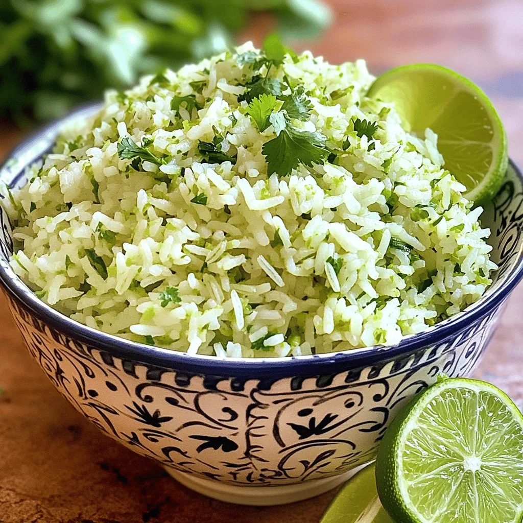 To make a tasty cilantro lime rice, you need: - 1 cup long-grain white rice - 2 cups vegetable broth (or water) - 1 tablespoon olive oil - 1 fresh lime (juiced and zested) - 1/2 cup fresh cilantro, chopped - 1 garlic clove, minced - 1/2 teaspoon salt (adjust to taste) - 1/4 teaspoon black pepper These ingredients blend well to create a fresh and zesty flavor. The rice acts as the base, soaking up the broth and lime juice. The cilantro adds a bright green color and a fresh taste. Garlic gives a rich aroma, making each bite delightful. You can enhance your cilantro lime rice with these optional ingredients: - 1/4 teaspoon chili powder for a hint of heat Adding chili powder can give a nice kick to the dish. If you like a bit of spice, this is a great choice. You can also mix in other herbs or even beans for extra flavor and texture. To prepare this dish, you will need: - A medium saucepan - A fine-mesh sieve for rinsing rice - A cutting board and knife for chopping - A fork for fluffing the rice These tools help you cook the rice perfectly and mix in the flavors. A good saucepan is key. It should have a tight-fitting lid to trap steam, ensuring fluffy rice. With these simple tools, you can create a dish that impresses everyone at the table. For the full recipe, check out the detailed instructions above. Rinsing rice is key for great texture. Place your rice in a fine-mesh sieve. Hold it under cold running water. Swirl the rice with your hand. Rinse until the water runs clear. This removes excess starch. Less starch means fluffier rice. Heat olive oil in a medium saucepan over medium heat. Add minced garlic to the pot. Sauté for about 30 seconds. You want it fragrant, not burnt. Now, add the rinsed rice to the pot. Stir to coat the rice in the garlic oil. Cook for 1-2 minutes. This toasting brings out the rice's rich flavor. Pour in 2 cups of vegetable broth or water. Add salt, black pepper, and optional chili powder. Give it a gentle stir to mix. Bring the mixture to a boil. Once boiling, reduce heat to low. Cover the pot tightly and simmer. Cook for 15-18 minutes until tender. The liquid should absorb fully. After cooking, remove the pot from heat. Let it rest for 5 minutes, covered. This step helps the rice to finish cooking. Now, fluff it with a fork. Stir in the lime juice, zest, and chopped cilantro. Mix well to combine. Taste and adjust seasoning as needed. Enjoy your fresh and zesty cilantro lime rice! For detailed cooking steps, check the Full Recipe. To make sure your rice is fluffy, rinse it well. Rinse the rice until the water runs clear. This step removes the extra starch. Extra starch can make the rice sticky. Use a fine-mesh sieve for best results. After cooking, let the rice rest for five minutes. This step helps the rice grains separate nicely. Fluff the rice gently with a fork before serving. You can easily tweak the flavors of cilantro lime rice. Start by adjusting the lime juice. More lime juice adds a zesty kick. If you love heat, add chili powder. You can also mix in more fresh herbs like parsley or green onions. Taste as you go, and don't be afraid to experiment. This dish is all about your taste! Cilantro lime rice is a great side dish. It pairs well with grilled chicken or fish. You can also serve it with tacos or burritos. For a fun twist, use it as a base for a rice bowl. Top it with beans, avocado, and fresh veggies. The bright flavors make every meal pop! For the full recipe, check out the complete guide. {{image_2}} You can turn cilantro lime rice into a full meal by adding protein. Grilled chicken, shrimp, or tofu work well. For chicken, marinate it in lime juice and spices before grilling. For shrimp, a quick sauté with garlic is perfect. Tofu can soak in the same marinade as chicken. Add the cooked protein on top or mix it in for a tasty dish. Cilantro lime rice is a great base for vegetarian and vegan meals. You can add black beans or pinto beans for protein and fiber. Corn adds a sweet crunch that balances the flavors. For a more filling dish, mix in sautéed bell peppers or zucchini. These veggies add color and nutrients, making your meal even better. If you like heat, there are easy ways to spice up your cilantro lime rice. Add diced jalapeños or serrano peppers while cooking the rice. For a smoky flavor, mix in chipotle powder or diced chipotle peppers. If you want a kick without the extra heat, try adding a splash of hot sauce just before serving. These additions bring a new layer of flavor to your rice. For the full recipe, check out the detailed steps above. Store leftover cilantro lime rice in an airtight container. Make sure it cools to room temperature first. This helps keep it fresh and prevents bacteria growth. Place it in the fridge for up to three days. If you want to keep it longer, consider freezing it. When reheating, add a splash of water or broth. This keeps the rice moist. You can use the microwave or a pan on the stove. Heat it gently until warm. Stir to blend the flavors again. This makes sure your cilantro lime rice tastes fresh. To freeze cilantro lime rice, scoop it into freezer-safe bags. Flatten the bags to save space. Label them with the date. You can freeze it for up to three months. When ready to eat, thaw it in the fridge overnight. Reheat as usual for the best taste. For the full recipe, check out the details above! Cilantro lime rice is a bright and tasty side dish. It combines fluffy rice with fresh cilantro and zesty lime. The dish has a refreshing flavor that pairs well with many meals. You can make it easily at home using simple ingredients. Yes, you can make cilantro lime rice ahead of time. Cook the rice and let it cool. Store it in an airtight container in the fridge. It stays good for about 3 days. When ready to eat, reheat it gently and add fresh cilantro and lime juice for the best flavor. Cilantro lime rice works well with many dishes. You can pair it with grilled chicken, fish, or shrimp. It also goes great wit