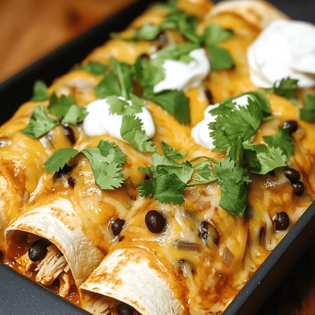 ![- Shredded chicken: Cooked chicken works best for enchiladas. You can use rotisserie chicken or your own cooked chicken. Shredding it allows the flavors to blend well. It also makes rolling easier. - Tortillas: You can choose between corn or flour tortillas. Corn tortillas give a nice texture and taste. They hold up well with the sauce. Flour tortillas are softer and easier to roll. Both options work great for this dish. - Enchilada sauce: You can use store-bought or homemade enchilada sauce. Store-bought is quick and easy. Homemade sauce allows you to control flavors and spice level. If you have time, I recommend making your own for a fresh taste. - Spices: Cumin and garlic powder are key spices. Cumin adds a warm, earthy flavor. Garlic powder gives a nice savory taste. Together, they enhance the chicken and make your enchiladas pop. - Beans: Adding black beans provides extra protein and fiber. They make the dish heartier and more filling. Plus, they add a creamy texture that complements the chicken. - Cheese: The best cheese options for melting are cheddar or a Mexican blend. Cheddar has a sharp flavor that pairs well with the spices. Mexican blend cheese melts beautifully and adds richness to your dish. For the complete recipe, check out the [Full Recipe]. Sautéing the onion: Tips for perfect flavor Start by heating olive oil in a skillet over medium heat. Add the diced onion and cook until it turns soft and clear, about 3 to 4 minutes. This brings out a sweet flavor that makes your enchiladas taste great. Combining chicken and spices: Ensuring even seasoning Next, add the shredded chicken, black beans, cumin, garlic powder, salt, and pepper to the onion. Stir everything well. Cook this mix for 2 to 3 minutes until it’s warm throughout. This step lets the spices flavor the chicken evenly. Assembling the filling: How to fill tortillas properly Take a tortilla and place a scoop of the chicken mixture in the center. Roll it up tightly and place it seam-side down in a baking dish. Repeat this for all tortillas. Filling them right helps keep everything inside while baking. Layering enchiladas: Importance of sauce and cheese Once all enchiladas are in the dish, pour the rest of the enchilada sauce over them. Make sure each one gets a nice coating. Then sprinkle the remaining cheese on top. This makes for a tasty, cheesy layer once baked. Baking times: When to cover and uncover Cover the baking dish with foil. Bake it at 375°F (190°C) for 20 minutes. After that, remove the foil and bake for another 10 minutes. This helps the cheese melt and brown nicely on top. Tips for checking doneness: Ensuring optimal melty cheese To check if they are done, look for bubbly and slightly golden cheese. If it looks good, take them out of the oven. Let them cool for a few minutes before serving. This way, you avoid burning your mouth with hot cheese! - Avoiding soggy tortillas: To keep your tortillas from getting soggy, warm them before filling. Heat them in a pan for a few seconds on each side. This helps them stay firm when you bake them. - Flavor enhancements: Add more depth to your enchiladas with spices like chili powder or smoked paprika. Fresh herbs, like cilantro or oregano, also bring brightness to the dish. - Presentation tips: To make your enchiladas look great, sprinkle fresh cilantro on top. A dollop of sour cream or Greek yogurt adds a nice touch too. Serve with lime wedges for a zesty kick. - Common mistakes: One common mistake is overfilling your tortillas. This can cause them to break. Also, avoid using too much sauce; it can make the dish too watery. - Fixing dry enchiladas: If your enchiladas turn out dry, add more sauce on top before serving. A drizzle of sour cream can also help add moisture and flavor. For the full recipe, refer to the Classic Chicken Enchiladas section. Enjoy creating these tasty, comforting meals! {{image_2}} You can switch the chicken for other proteins. Ground beef or turkey works well. Both options give a rich taste. Just cook them in the skillet as you would with chicken. Drain any fat before adding spices. This keeps your enchiladas light and tasty. For a meatless option, try beans or mushrooms. Black beans add protein and fiber. They also bring a nice texture. You can use sautéed mushrooms for a hearty feel. Combine them with spinach for extra flavor. These vegetarian enchiladas are just as satisfying. Enchilada sauce comes in many flavors. You can try red or green. Red sauce has a rich, deep flavor. It pairs well with chicken and beef. Green sauce, or salsa verde, is bright and tangy. It works great with vegetables and pork. Choose what you like best. If you enjoy a spicy kick, add some chili powder to your sauce. For a creamier sauce, mix in some sour cream. This gives your dish a unique twist. You can even blend different sauces for a custom flavor. Just remember to adjust the spices to match. When you have leftover enchiladas, store them in an airtight container. This keeps them fresh. Make sure the enchiladas are cool before you seal them up. They last in the fridge for about 3 to 4 days. If you want to enjoy them later, consider freezing. To freeze enchiladas, you can do this before or after baking. If you freeze them unbaked, wrap them tightly in plastic wrap and place them in a freezer bag. They will stay good for about 2 to 3 months. When you’re ready to bake, remove the plastic and add a bit more sauce on top before baking. If you freeze baked enchiladas, let them cool down first. Then, wrap them well in foil or plastic wrap. They can last in the freezer for about 2 months. To reheat frozen enchiladas, preheat your oven to 350°F (175°C). Place them in a baking dish, cover with foil, and bake for about 25 to 30 minutes. Remove the foil for the last 10 minutes to make the cheese nice and bubbly. Enjoy your enchiladas just like when they were fresh! Enchiladas come from Mexico. They date back to ancient times. The Aztecs rolled tortillas aroun