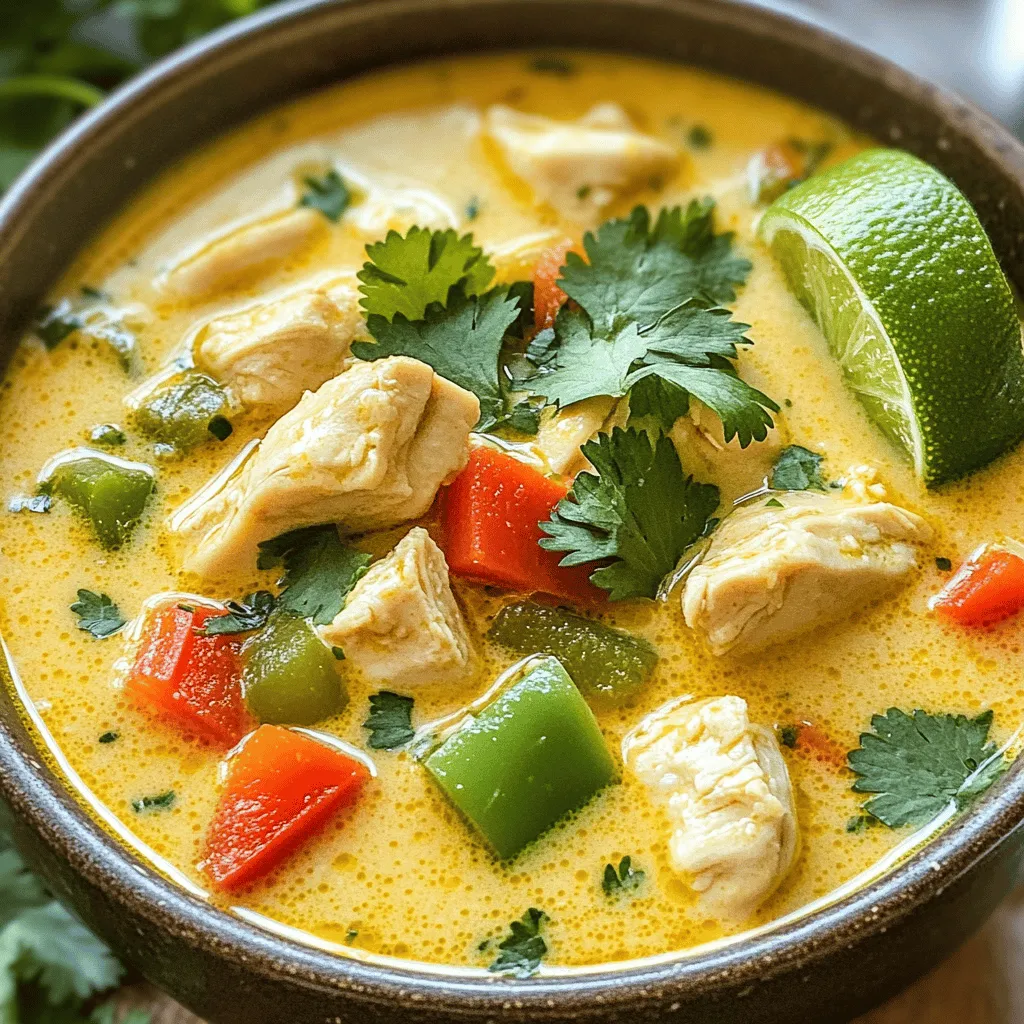 To start your Coconut Lime Chicken Soup, gather these key items: - 2 boneless, skinless chicken breasts, diced - 1 can (14 oz) coconut milk - 4 cups chicken broth - 1 tablespoon olive oil Next, add some flavor with these ingredients: - 1 medium onion, diced - 3 cloves garlic, minced - 1 red bell pepper, diced - 1 green bell pepper, diced - 1 tablespoon fresh ginger, grated Finally, season and garnish your soup with these items: - 2-3 tablespoons lime juice (to taste) - 1 tablespoon fish sauce (optional) - 1 teaspoon ground coriander - 1 teaspoon cumin - 1-2 red chilies, sliced - Salt and pepper to taste - Fresh cilantro, for garnish - Lime wedges, for serving With these ingredients, you can make a tasty and flavorful Coconut Lime Chicken Soup. Each element plays a role in building a warm, comforting bowl. The chicken adds protein, while the coconut milk brings creaminess. The fresh veggies and spices create a vibrant taste. The lime juice gives a zesty kick that brightens the dish. Each bite feels fresh and satisfying, perfect for any meal. - First, heat 1 tablespoon of olive oil in a large pot over medium heat. - Next, add the diced onion. Sauté until the onion turns translucent, about 5 minutes. - After the onion is ready, stir in 3 cloves of minced garlic and 1 tablespoon of grated ginger. Cook for 1 more minute until fragrant. - Now, add 2 diced chicken breasts to the pot. Sauté until the chicken is no longer pink, which takes about 5 to 7 minutes. - Once the chicken is cooked, add 1 diced red bell pepper and 1 diced green bell pepper. Continue to sauté for another 3 to 4 minutes until the peppers soften. - Pour in 1 can of coconut milk and 4 cups of chicken broth. Stir well to combine everything. - Then, add 1 teaspoon of ground coriander, 1 teaspoon of cumin, and 1 to 2 sliced red chilies. - Bring the soup to a gentle boil. Reduce the heat and let it simmer for about 15 to 20 minutes. - To finish, stir in 2 to 3 tablespoons of lime juice and 1 tablespoon of fish sauce if you choose to use it. - Season the soup with salt and pepper to taste. - Remove the pot from heat and let it cool slightly before serving. - Adjust lime juice for acidity. Start with two tablespoons. Taste, then add more if needed. - Use fresh herbs for better flavor. Cilantro adds a fresh zing. - Ensure chicken is fully cooked. Check that it turns white inside. This keeps the soup safe. - Avoid boiling coconut milk too hard. It can split and ruin the creamy texture. - Serve with lime wedges and cilantro garnish. This adds color and freshness to your dish. - Suggest complementary side dishes. Rice or crusty bread pairs well with the soup. {{image_2}} You can switch out the chicken for shrimp or tofu. Shrimp cooks fast and adds a nice flavor. Tofu works great if you want a plant-based option. Just make sure to sauté it well. You can also change up the veggies. Use what you have at home. Carrots, zucchini, or snap peas are good choices. They add color and crunch. Do you want more heat? Add more red chilies. If you prefer less spice, use fewer chilies. You can also add milder chili types, like poblano or Anaheim. These give flavor without too much heat. If you want a kick, try a dash of hot sauce at the end. For a vegan version, use vegetable broth instead of chicken broth. Replace chicken with chickpeas or lentils. This keeps it hearty and filling. You can also use low-sodium chicken broth for a healthier soup. This is great if you watch your salt intake. Adjust lime juice to brighten flavors without adding too much salt. The soup lasts about 3 to 4 days in the fridge. Store it in an airtight container to keep it fresh. Glass containers work well, as they do not absorb odors. You can also use plastic containers, but make sure they are BPA-free. To freeze the soup, let it cool completely first. Pour it into freezer-safe bags or containers. Leave some space at the top for expansion. It can last up to 3 months in the freezer. When you're ready to eat, thaw it overnight in the fridge. Reheat on the stove over low heat. Stir often to keep it smooth. To maintain flavor and texture, avoid freezing the soup with fresh cilantro or lime juice. Add these just before serving. Prepping ingredients in advance saves time. Chop the onions, bell peppers, and garlic the night before. Store them in separate bags in the fridge. This makes cooking quick and easy. Serve this soup with jasmine rice or crusty bread. A light salad pairs well, too. Enjoy your meal with some lime wedges on the side for extra zing! You can use vegetable broth as a great alternative. Homemade broth is another option. Both will add flavor and keep the soup tasty. If you prefer, you can also use water, but it may lack depth. Yes, you can prepare this soup ahead of time. It tastes even better the next day! Store it in the fridge for up to three days. Just reheat it on the stove before serving. For longer storage, freeze it in an airtight container. It will last for about three months in the freezer. The soup can be adjusted to your taste. If you like it spicy, use more red chilies. For less heat, remove the seeds from the chilies. You can also skip them entirely. The lime juice and coconut milk will still give it a nice flavor. To make the soup healthier, use leaner chicken breast. You can also add more veggies like spinach or carrots. This boosts the nutrition without changing the great taste. Another tip is to reduce the amount of coconut milk for fewer calories. In this post, we explored the key ingredients needed for a delicious Coconut Lime Chicken Soup. From chicken to fresh herbs, every element plays a role in great flavor. I shared step-by-step instructions to guide you through cooking it perfectly. Remember to adjust flavors based on your taste. Try substituting proteins or veggies to mix things up. With the right tips, you can avoid common mistakes and store leftovers properly. Enjoy your cooking journey, and create a dish your family will love!