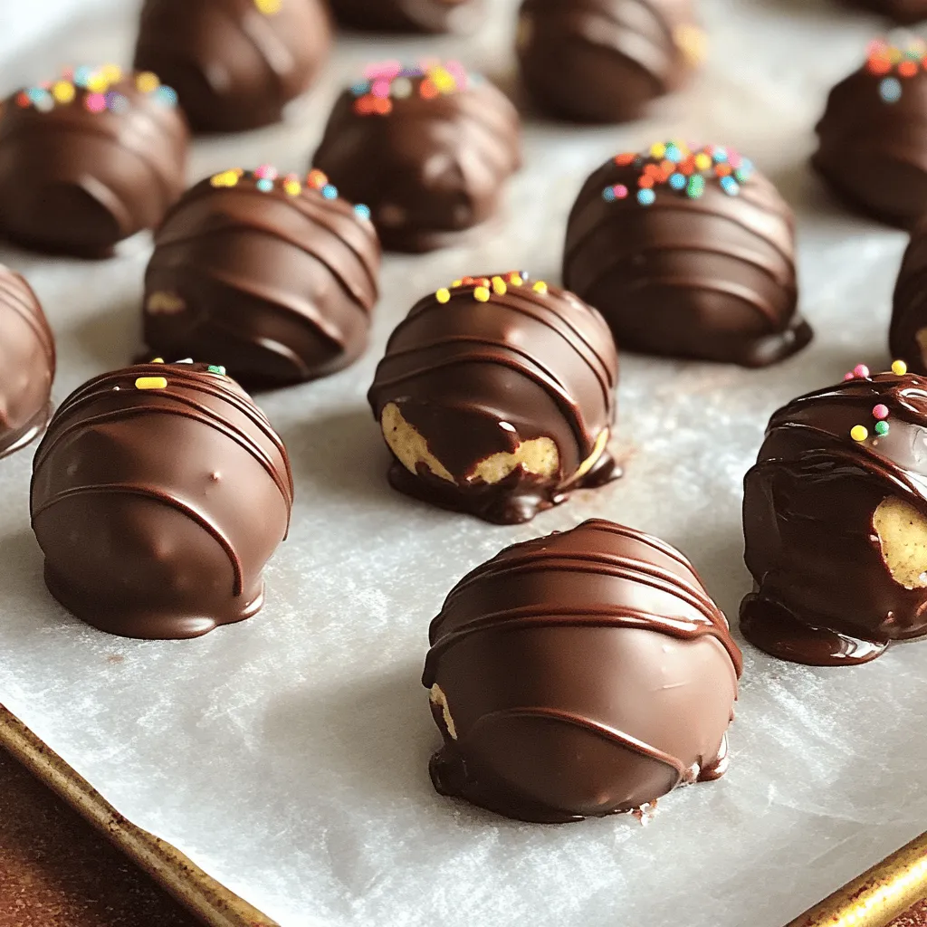 Next, melt the chocolate chips. Use a microwave-safe bowl and heat in 30-second intervals, stirring in between. If you like, add coconut oil for a smoother coating. Remove the truffles from the freezer. Dip each one into the melted chocolate, rolling it around with a fork until fully coated. Place the coated truffles back on the parchment-lined sheet. Before the chocolate sets, sprinkle some leftover chocolate chips or colorful sprinkles on top. Finally, refrigerate the truffles for 15 to 20 minutes, until the chocolate hardens. Enjoy your cookie dough truffles!