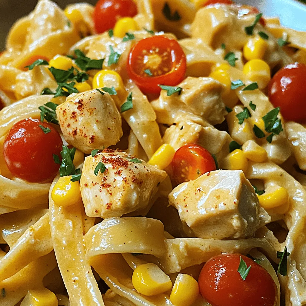 Now, it’s time to bring everything together. Add the cherry tomatoes and corn kernels to the skillet. Sauté these for about 3 to 4 minutes until the tomatoes soften. Return the cooked chicken to the pan. Pour in the heavy cream and the reserved pasta water. Stir everything together until well combined. To achieve a creamy texture, add the cooked pasta and mix gently. Gradually add in 1 cup of shredded cheddar cheese. Keep stirring until the cheese melts fully. Adjust the seasoning with salt and pepper as needed. Enjoy the rich, creamy goodness of Cowboy Butter Chicken Pasta!