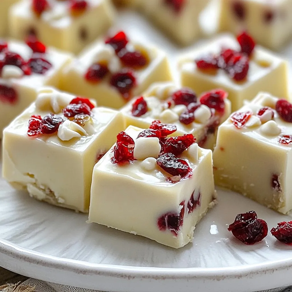 To make this tasty fudge, you need a few key items: - 2 cups white chocolate chips - 1 can (14 oz) sweetened condensed milk - 1 teaspoon vanilla extract - 1 cup dried cranberries, chopped - Pinch of salt These ingredients create a creamy and sweet base. The white chocolate chips are the star, giving the fudge its rich flavor. The sweetened condensed milk adds a smooth texture. The cranberries provide a fruity pop that pairs well with the chocolate. You can enhance your fudge with some optional ingredients: - 1/2 cup walnuts, chopped (optional) - Extra dried cranberries and white chocolate chips for topping Adding walnuts gives a nice crunch. If you love cranberries, sprinkle extra on top for a festive look. These options let you customize your fudge to your taste. You will need a few simple tools to make this fudge: - 8x8 inch square baking dish - Parchment paper - Medium saucepan - Spatula Using parchment paper helps you lift the fudge out easily. A medium saucepan is perfect for melting the chocolate and milk. A spatula ensures you mix and spread everything well. With these tools, making fudge becomes a breeze! {{ingredient_image_1}} Before cooking, gather your ingredients. You need: - 2 cups white chocolate chips - 1 can (14 oz) sweetened condensed milk - 1 teaspoon vanilla extract - 1 cup dried cranberries, chopped - 1/2 cup walnuts, chopped (optional) - Pinch of salt - Extra dried cranberries and white chocolate chips for topping Also, get your tools ready. You will need a medium saucepan, an 8x8 inch square baking dish, and a spatula. Prepare the baking dish by lining it with parchment paper. Leave some paper hanging over the sides. This helps you lift the fudge out later. 1. Melt the Chocolate: Place the white chocolate chips and sweetened condensed milk in the saucepan. Cook on low heat. Stir often until the chocolate melts and the mix is smooth. 2. Add Flavor: Take the saucepan off the heat. Stir in the vanilla extract and a pinch of salt. This adds great taste! 3. Mix in the Good Stuff: Gently fold in the chopped dried cranberries and walnuts if you want them. Make sure they are spread evenly. 4. Pour and Spread: Pour the fudge mix into your lined baking dish. Use a spatula to spread it out evenly. 5. Add Toppings: Sprinkle extra dried cranberries and white chocolate chips on top. Press them in lightly to keep them from falling off. 6. Chill: Put the fudge in the fridge for at least 3 hours. It needs to set completely before you cut it. 7. Cut and Serve: Once set, lift the fudge out using the parchment paper. Cut it into small squares. Enjoy your tasty treat! To ensure your fudge turns out smooth, keep the heat low while melting the chocolate. Stir often to avoid burning. If the fudge is too thick, you can add a little more sweetened condensed milk. Also, make sure to mix in the ingredients gently. This keeps the fudge light and fluffy. When making cranberry white chocolate fudge, some mistakes can ruin the fun. Here are a few to watch for: - Not using low heat: Always melt white chocolate on low heat. High heat can burn it. - Skipping the salt: A pinch of salt balances the sweet taste. Don't leave it out. - Overmixing after adding cranberries: Gently fold them in. Overmixing can make the fudge grainy. - Not chilling long enough: This fudge needs at least three hours to set properly. Be patient. For smooth and creamy fudge, follow these tips: - Use good quality chocolate: High-quality white chocolate chips melt better. - Stir constantly: Mixing the chocolate and condensed milk keeps it smooth. - Check for lumps: Make sure the mixture is completely melted before adding extras. - Let it cool slightly: Allow the mixture to cool for a few minutes before pouring it into the dish. This helps it set evenly. This fudge is a treat for the eyes and taste buds. Here are some fun ideas for serving: - Plate it nicely: Stack fudge squares on a decorative plate. Add chopped cranberries for color. - Wrap for gifts: Use clear cellophane to wrap individual pieces. They make great gifts! - Pair with drinks: Serve with hot cocoa or coffee for a cozy treat. - Add a scoop of ice cream: A small scoop of vanilla ice cream pairs well with fudge. Pro Tips Use High-Quality Chocolate: Opt for premium white chocolate chips for a smoother, richer flavor in your fudge. Chill for Perfect Texture: Allow the fudge to chill for a full 3 hours or more to achieve the ideal firmness. Enhance with Spices: Add a pinch of cinnamon or nutmeg to the mixture for a warm, holiday-inspired flavor. Store Properly: Keep the fudge in an airtight container in the refrigerator to maintain freshness for up to 2 weeks. {{image_2}} You can switch things up with your fudge. Try adding different nuts like almonds or pecans. If you want a fruity twist, mix in dried cherries or blueberries. You can also use coconut for a tropical flair. Each mix-in adds a unique taste and texture. Making vegan fudge is easy. Use dairy-free white chocolate chips and coconut milk. For a gluten-free option, just check the labels on your ingredients. Most white chocolate chips are gluten-free, but it’s always good to confirm. These simple swaps let everyone enjoy the treat. Add a splash of orange zest for a bright flavor. It pairs well with cranberries. A sprinkle of cinnamon adds warmth and spice. You can also mix in a hint of peppermint extract for a festive touch. Each flavor enhancement makes your fudge more special and fun. To keep your cranberry white chocolate fudge fresh, store it in an airtight container. Use parchment paper between layers to prevent sticking. This keeps the fudge from drying out and helps maintain its creamy texture. Always place the container in a cool, dry area. Avoid direct sunlight or heat sources, as they can melt the fudge. When stored properly, fudge can last up to two weeks at room temperature. If you want to keep it longer, refrigerate it. In the fridge, it can last for about three weeks. Always check for any signs of 
