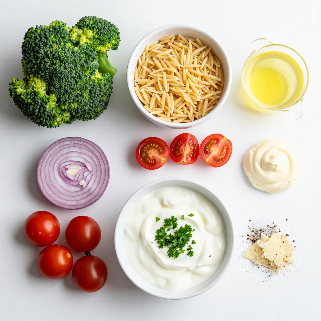 You need some key parts to make this creamy broccoli orzo salad. First, orzo pasta is the base. It cooks up nice and soft, perfect for this dish. Next, add fresh broccoli florets. They give a nice crunch and bright color. Donβt forget the cherry tomatoes. They add a sweet burst of flavor that makes every bite special.