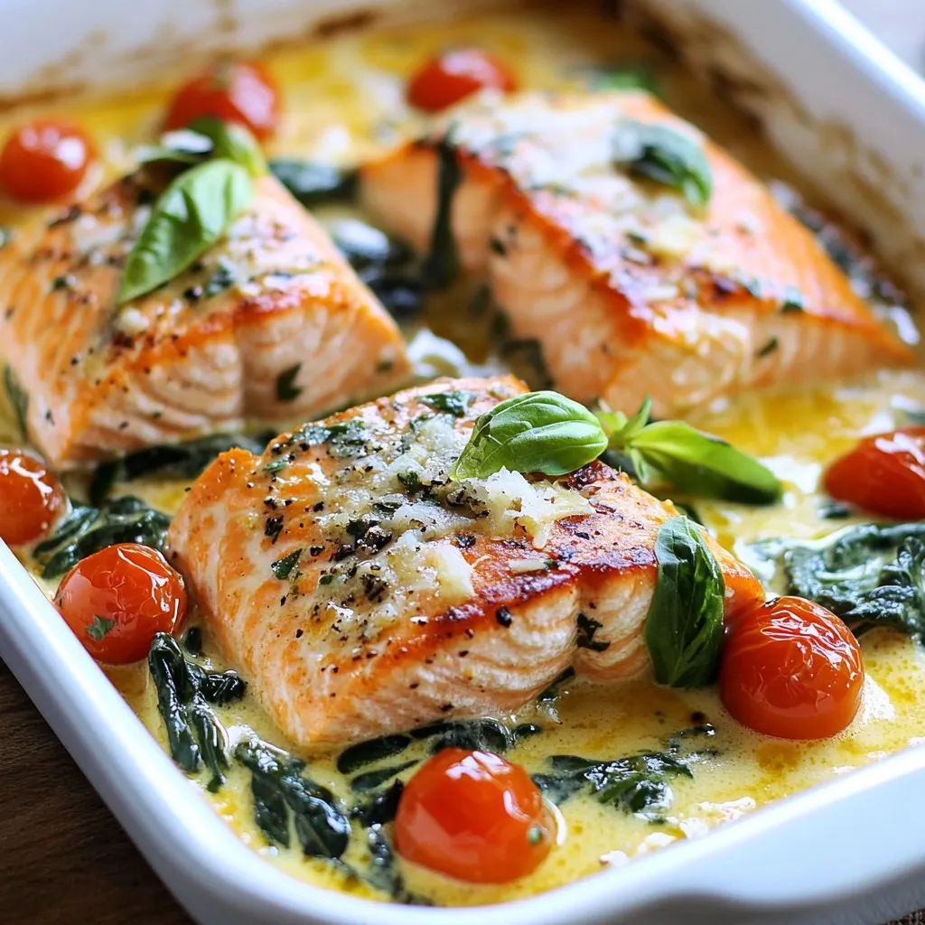 To make this dish special, you need a few key items: - 4 salmon fillets - 2 tablespoons olive oil - 4 cloves garlic, minced - 1 cup heavy cream - ½ cup chicken or vegetable broth - 1 cup cherry tomatoes, halved - 1 cup fresh spinach - 1 teaspoon Italian seasoning - Salt and pepper to taste - Grated Parmesan cheese, for garnish - Fresh basil leaves, for garnish These ingredients blend together to create a rich, creamy sauce that pairs perfectly with the salmon. You can add a personal touch with optional garnishes. Here are a few ideas: - Lemon wedges for a fresh zing - Extra grated Parmesan for cheesy goodness - Red pepper flakes for a spicy kick These garnishes can take your dish to the next level! You might not have every item on hand. Here are some easy swaps: - Use butter instead of olive oil for a richer flavor. - Swap heavy cream with coconut cream for a dairy-free option. - Replace spinach with kale or arugula for a different green. These substitutions help you customize the dish to fit your pantry and taste! {{ingredient_image_1}} Start by heating 2 tablespoons of olive oil in a large skillet over medium heat. When the oil is hot, place 4 salmon fillets in the skillet, skin-side down. Season them with salt and pepper. Cook for about 4-5 minutes on each side. You want the salmon to be golden and cooked through. Once done, remove the salmon from the skillet and set it aside. In the same skillet, add 4 cloves of minced garlic. Sauté the garlic for about 1 minute. The garlic should smell nice and fragrant. Next, pour in ½ cup of chicken or vegetable broth. Let it simmer for 2-3 minutes. Be sure to scrape any brown bits from the bottom of the skillet. This adds great flavor. Then, stir in 1 cup of heavy cream and 1 teaspoon of Italian seasoning. Cook for an additional 3-4 minutes until the sauce thickens slightly. Add 1 cup of halved cherry tomatoes and 1 cup of fresh spinach to the sauce. Stir them in until the spinach wilts and the tomatoes heat through. Now, return the salmon fillets back to the skillet. Spoon the creamy sauce over the salmon. Let it cook together for about a minute. Finally, remove the skillet from the heat. Garnish with grated Parmesan cheese and fresh basil leaves. This dish is ready to serve! To cook salmon well, start with fresh fillets. They should be bright and smell like the sea. Heat olive oil in your skillet. Place the salmon skin-side down. Sear it for about 4-5 minutes. This gives a nice crust. Flip and cook for another 4-5 minutes. The salmon should be golden and just cooked through. Use a fork to check. It should flake easily. If you prefer it rare, reduce the cooking time by a minute or two. To boost flavor, add more garlic. Fresh herbs like thyme or oregano also work well. A squeeze of lemon juice adds brightness. You can also sprinkle in some red pepper flakes for heat. This dish shines with good Parmesan cheese. Don’t forget to garnish with fresh basil. It adds color and a nice aroma. One common mistake is overcooking the salmon. Keep an eye on it, as it cooks quickly. Another mistake is not seasoning enough. Salt and pepper are key for flavor. Avoid skipping the step of scraping the skillet. This adds depth to your sauce. Lastly, don’t rush the sauce. Let it simmer to thicken properly. This ensures a rich, creamy texture. Pro Tips Tip for Perfect Salmon: Ensure your salmon fillets are at room temperature before cooking to promote even cooking. Garlic Timing: Be careful not to burn the garlic when sautéing; it should be fragrant but not browned. Thickening the Sauce: If you prefer a thicker sauce, let it simmer a bit longer after adding the cream. Fresh Herbs for Garnish: Use fresh basil leaves for garnish to enhance the flavor and presentation of the dish. {{image_2}} You can swap salmon for chicken or shrimp. For chicken, use boneless breasts. Cook the chicken in the same way as the salmon. For shrimp, sauté them until pink and firm. The creamy sauce works well with both. To make this dish vegetarian, replace the salmon with tofu or chickpeas. Use firm tofu, cut into cubes. Sauté it until golden, then follow the same steps for the sauce. Chickpeas add protein and have a nice texture too. Incorporate seasonal veggies to add color and nutrients. Try asparagus, zucchini, or bell peppers. Just add them to the skillet after the garlic. Cook until they are tender, then mix in the sauce. This keeps your dish fresh and exciting. To store your leftovers, let the dish cool first. Place the salmon and sauce in an airtight container. This keeps it fresh for up to three days in the fridge. Make sure to separate the salmon from the sauce if you prefer. This helps maintain the fish’s texture. When you are ready to enjoy your leftovers, reheat them gently. Use a skillet on low heat to warm the salmon. Add a splash of broth or cream to keep it moist. You can also microwave it in short bursts, stirring often. This prevents the salmon from drying out. If you want to freeze this dish, do it before adding the spinach and tomatoes. These ingredients do not freeze well and can become mushy. Place the salmon and sauce in a freezer-safe container. It will keep for about three months. Thaw overnight in the fridge before reheating. Yes, you can use frozen salmon. Just thaw it first. Place the salmon in the fridge overnight to thaw. If you are short on time, place it in cold water for about 30 minutes. This will help keep the fish fresh and tasty. You can serve this salmon with many sides. Here are some great ideas: - Garlic mashed potatoes - Steamed broccoli - Rice or quinoa - A fresh garden salad - Crusty bread for dipping in sauce These sides will balance the flavors and make your meal complete. The salmon is done when it reaches an internal temperature of 145°F. You can use a food thermometer for this. If you don’t have one, check the color. The fish should be opaque and flake easily with a fork. If it still looks raw in the center, cook it a bit longer. 