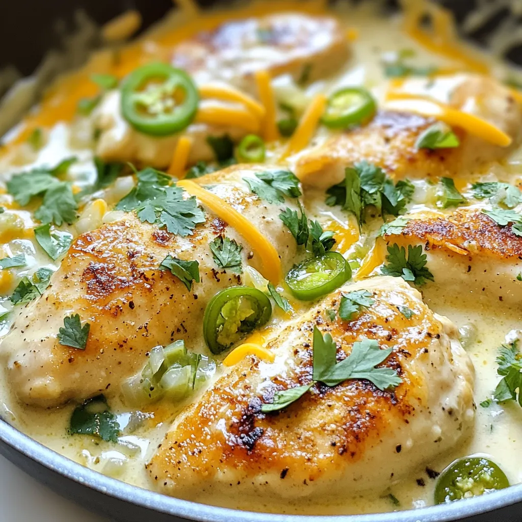 A delicious skillet dish featuring tender chicken breasts in a creamy jalapeño sauce.