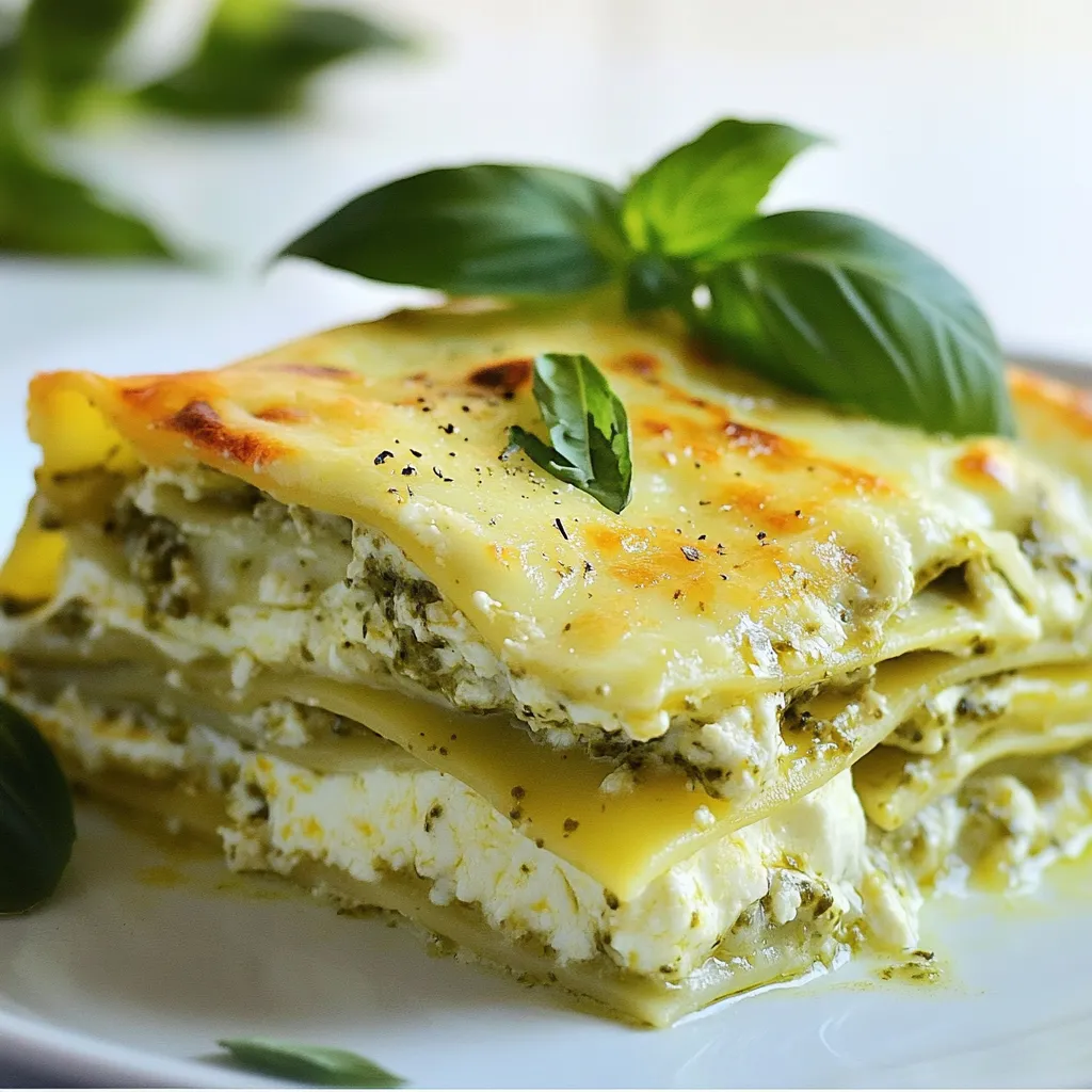 A delicious lasagna layered with creamy pesto, chicken, and cheeses.