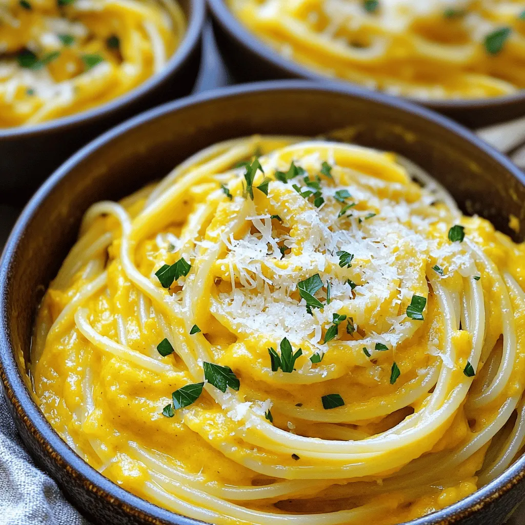 - 12 oz. spaghetti or fettuccine - 1 cup pumpkin puree (canned or homemade) - 1 cup heavy cream For this dish, I love using spaghetti or fettuccine. Both types hold the sauce well. The star of this recipe is the pumpkin puree. It adds creamy texture and a rich flavor. You can use canned pumpkin or make your own. Heavy cream is key for that luscious sauce. It makes everything smooth and rich. - 2 cloves garlic, minced - 1 small onion, finely chopped - 2 tbsp olive oil - 1 tsp dried sage - 1/2 tsp nutmeg - 1/2 cup grated Parmesan cheese Aromatics are essential. I use garlic and onion for a strong base. The garlic gives a nice kick, while the onion adds sweetness. Olive oil helps to sauté these well. Sage brings a warm, earthy taste. Nutmeg adds depth to the pumpkin flavor. Finally, Parmesan cheese makes the sauce even creamier and adds a salty note. - Fresh parsley, chopped (for garnish) - Optional extra Parmesan Garnishing makes a dish shine. I sprinkle fresh parsley on top for color and freshness. If you love cheese, add extra Parmesan for a richer flavor. These small touches elevate your creamy pumpkin pasta and make it look beautiful. For the full recipe, you can check out the details and get cooking! - Boiling Instructions: In a large pot, fill it with salted water. Bring it to a boil. Add 12 oz. of spaghetti or fettuccine. Cook until al dente, about 8-10 minutes. This keeps the pasta firm but not hard. - Draining and Reserving Pasta Water: Once cooked, drain the pasta. Make sure to save 1 cup of the pasta water. This water has starch that helps the sauce stick. - Heat Olive Oil: Take a large skillet and put it on medium heat. Add 2 tablespoons of olive oil to the skillet. Let it warm for a minute. - Sautéing Onion and Garlic: Add 1 small finely chopped onion to the hot oil. Cook for about 3-4 minutes until it turns soft and clear. Next, add 2 cloves of minced garlic and cook for 1 more minute. The garlic should smell great, but don’t let it burn. - Combining Ingredients for Sauce: Stir in 1 cup of pumpkin puree and 1 cup of heavy cream. Then, add 1 teaspoon of dried sage and 1/2 teaspoon of nutmeg. Whisk until it is all smooth and blended. - Simmering Instructions: Let the sauce cook on low heat for about 5 minutes. Stir it often to keep it from sticking. This step helps the flavors mix well. - Combining Pasta and Sauce: Add the drained pasta to the skillet with the pumpkin sauce. Toss gently to coat the pasta. If you need more creaminess, add the reserved pasta water a little at a time. - Adding Cheese and Seasoning: Mix in 1/2 cup of grated Parmesan cheese. Stir until it’s melted and creamy. Taste and add salt and pepper as needed. This method creates a rich, comforting dish that feels like a warm hug on a plate. For more detailed steps, check out the Full Recipe. To make your creamy pumpkin pasta shine, use reserved pasta water. When you drain the pasta, save some water before you toss it. This water has starch that helps thicken the sauce. It adds a silky texture that makes each bite smooth. Add this water a little at a time until you reach the creaminess you want. Adjusting the consistency is key. If the sauce is too thick, add more reserved water. If it's too thin, let it simmer longer. This method gives you control over the sauce. You can create your perfect creamy dish. To boost flavor, consider adding spices. Nutmeg and sage are great choices. They pair well with the pumpkin. You can also try a pinch of cinnamon for warmth. If you like a kick, add a bit of red pepper flakes. These spices will elevate your dish. If you want a lighter option, swap heavy cream for half-and-half or coconut milk. These alternatives keep the creaminess while adding unique flavors. You can enjoy a creamy texture without the heaviness of cream. For serving, choose deep bowls. They hold the pasta well and look nice. Drizzle a bit of olive oil on top for shine. This small touch makes the dish pop. Garnish with fresh parsley for color. You can also add a sprig of sage or some pumpkin seeds. These simple touches enhance the dish's look and make it more inviting. Serve it hot, and enjoy the warmth of fall in every bite! {{image_2}} To make this dish vegan, swap out the heavy cream and cheese. For cream, use coconut cream or cashew cream. Both options give a rich and creamy texture. For cheese, nutritional yeast adds a cheesy flavor without dairy. You can also enhance the taste with extra herbs. Try thyme or rosemary for added depth. A splash of lemon juice brightens the dish, balancing the pumpkin's sweetness. If you need a gluten-free meal, choose gluten-free pasta. Options like brown rice pasta or chickpea pasta work well. They cook similarly to regular pasta. Just check the package for cooking times. To adjust cooking techniques, always rinse gluten-free pasta after cooking. This helps prevent sticking. Also, add a bit more pasta water when mixing. It helps the sauce cling better to the pasta. Want some heat? Add red pepper flakes to the pumpkin sauce. Start with a pinch and taste. You can always add more if you like it spicier. If you want different heat options, try jalapeños or crushed black pepper. Both add great flavor and spice. Just remember, heat can build, so add slowly! How long does creamy pumpkin pasta last in the fridge? It lasts about 3 to 5 days. Store it in an airtight container to keep it fresh. The best storage containers are glass or BPA-free plastic. These help prevent moisture loss and keep flavors intact. Can I freeze leftover creamy pumpkin pasta? Yes, you can freeze it! Make sure to cool it completely first. Use freezer-safe containers or bags. This helps avoid freezer burn. For best results, eat it within 2 to 3 months. How do I thaw and reheat frozen pasta? The best way is to leave it in the fridge overnight. If you're in a hurry, you can use the microwave. Just make sure to cover it to keep moisture in. Should I use the stovetop or microwave to reheat? Using the stove