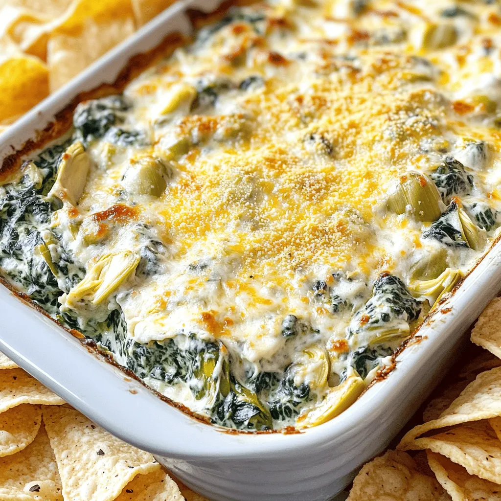 For a Mediterranean-style twist, add chopped olives and feta cheese. This version gives a salty, briny flavor that pairs well with the spinach and artichokes. If you like spice, make a spicy version by mixing in buffalo sauce. This adds a kick that will please heat lovers. Each variation brings a new taste to this classic dip, making it fun to try!