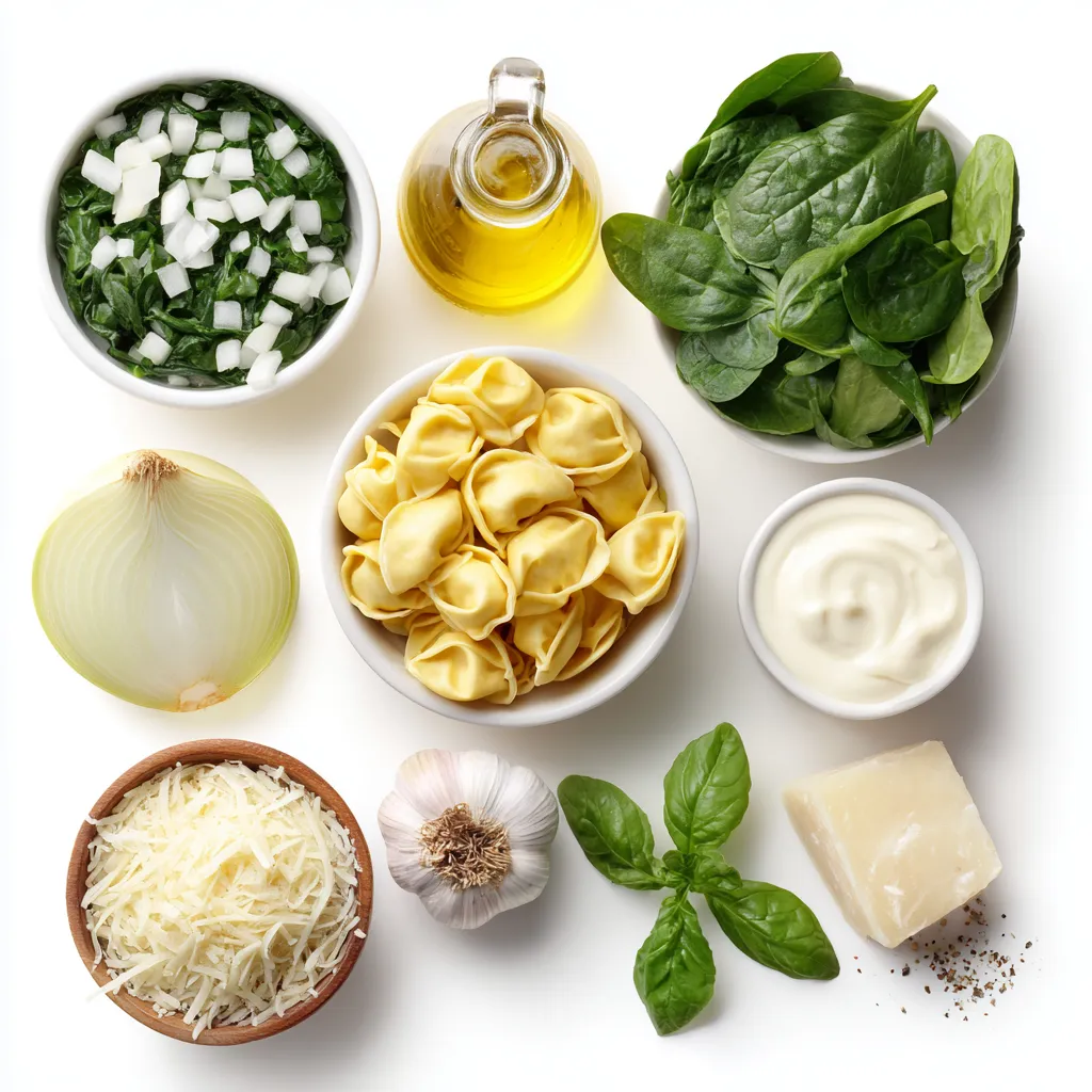 Gather these fresh and pantry ingredients to make a delicious creamy spinach tortellini soup. The olive oil adds richness, and the onion and garlic create a strong base. Fresh spinach gives color and nutrition, while basil adds a lovely aroma.