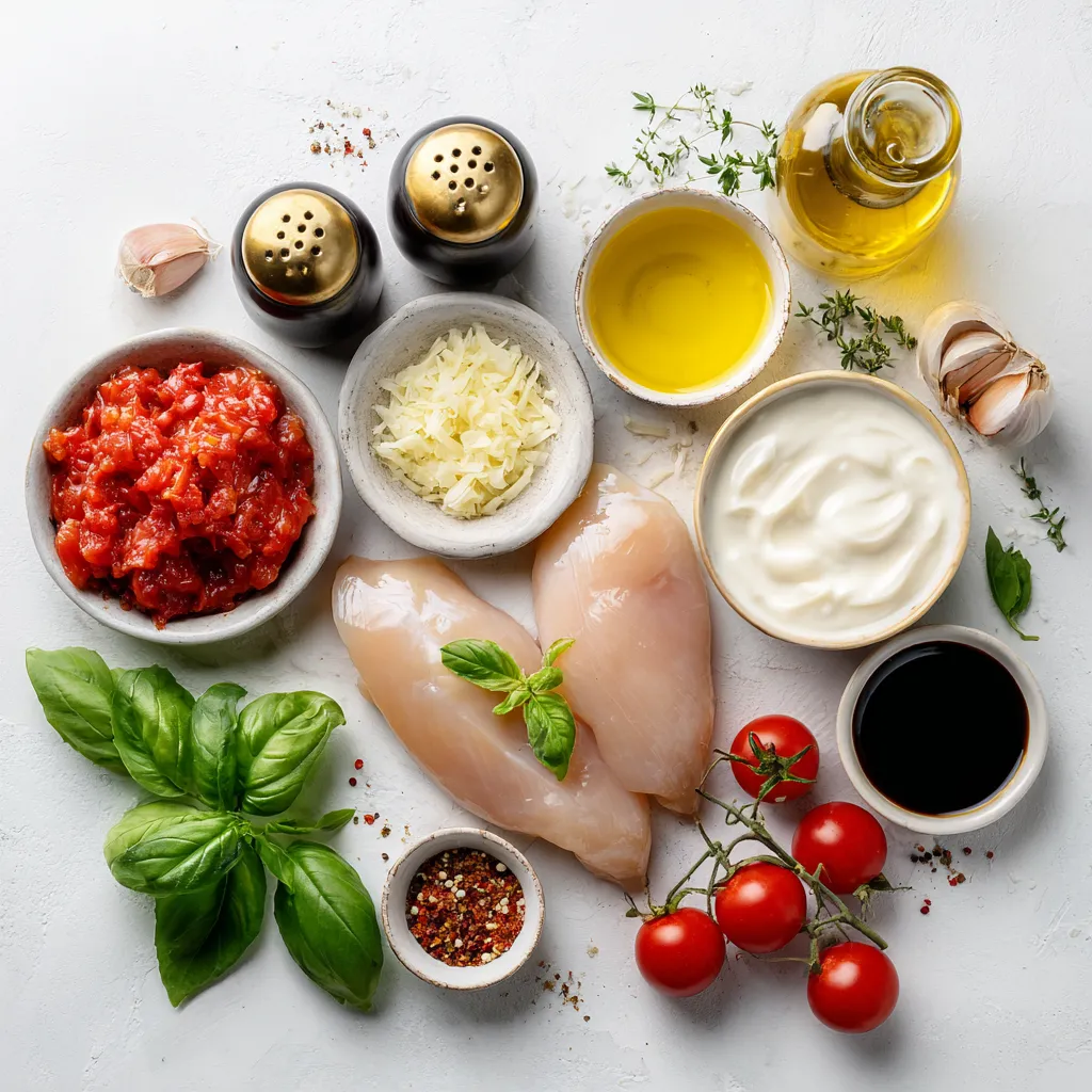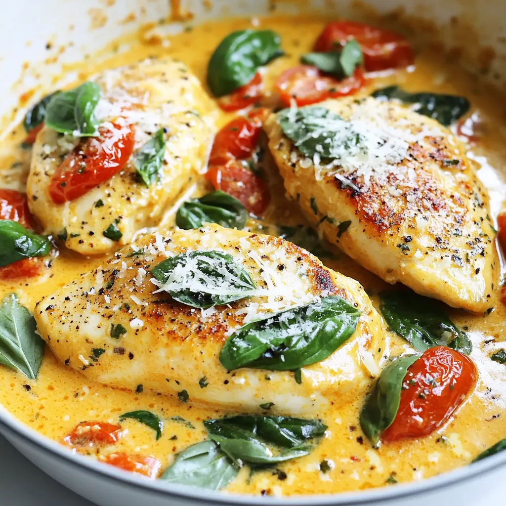 - 4 boneless, skinless chicken breasts - Salt and pepper to taste - 2 tablespoons olive oil - 1 medium onion, finely chopped - 4 cloves garlic, minced - 1 can (14 oz) crushed tomatoes - 1 cup heavy cream - 1 cup fresh basil leaves, chopped - 1 teaspoon Italian seasoning - ½ cup grated Parmesan cheese - 1 tablespoon balsamic vinegar - Optional: Red pepper flakes for extra heat The chicken breasts are the main star of this dish. I love using boneless and skinless chicken for a tender bite. Season them simply with salt and pepper. This helps bring out their natural flavor. Next is the sauce, which is the magic in this recipe. I start with olive oil for cooking. It adds flavor and helps brown the chicken. The onion and garlic create a sweet base. They soften quickly, making your kitchen smell amazing. Crushed tomatoes bring tanginess and richness to the sauce. I use a can because it saves time. Heavy cream makes the sauce creamy and smooth. For freshness, I add chopped basil. This herb gives a bright taste that pairs well with tomatoes. Italian seasoning is a blend of herbs. It adds depth to the sauce. Grated Parmesan cheese adds a nice salty touch and thickens the sauce. Balsamic vinegar adds a hint of sweetness and acidity. If you like a little heat, red pepper flakes are perfect. I often add them for an extra kick. Each ingredient plays a key role, making this dish a savory delight. {{ingredient_image_1}} Start by seasoning the chicken breasts with salt and pepper. This adds flavor right from the start. Heat olive oil in a large skillet over medium heat. Once hot, place the chicken breasts in the skillet. Sear them for about 5 to 6 minutes on each side. You want them golden brown and cooked through. When done, remove the chicken and set it aside. In the same skillet, add the chopped onion. Sauté it for about 3 minutes until it becomes soft. Then, add the minced garlic and cook for another minute. This step makes your kitchen smell amazing! Pour in the can of crushed tomatoes. Stir to mix everything well and let it simmer for 5 minutes. Next, lower the heat. Stir in the heavy cream, chopped basil, Italian seasoning, and balsamic vinegar. Let the sauce simmer for another 2 to 3 minutes. This allows the sauce to thicken just right and combine all the flavors. Now, return the chicken to the skillet. Make sure to coat it well with the creamy tomato basil sauce. Sprinkle the grated Parmesan cheese over the top. Let everything cook together for about 3 to 5 minutes. This heats the chicken through and melts the cheese. If you want some extra heat, add red pepper flakes for a kick! Serve it hot, and enjoy your delicious meal. To avoid dry chicken, consider a few key steps. First, always season the chicken breasts before cooking. Salt and pepper add flavor and help tenderize the meat. Use a meat thermometer to check for doneness. The internal temperature should reach 165°F. This helps keep the chicken juicy. For best searing, heat the olive oil on medium heat. Once hot, add the chicken breasts. Sear them for 5-6 minutes on each side. Look for a golden-brown color. This gives flavor and texture. Don't crowd the skillet. Cook in batches if needed. You can boost the flavor of your sauce with some simple additions. Try adding a splash of white wine for depth. A teaspoon of sugar can balance the acidity of the tomatoes too. If you want some heat, mix in red pepper flakes. To thicken the sauce, let it simmer longer. The heavy cream will help, but patience is key. You can also mix in a cornstarch slurry. Combine one tablespoon of cornstarch with two tablespoons of water. Stir it in and let it cook until thick. Garnishing makes your dish look great. Add fresh basil leaves on top for color. You can also sprinkle more grated Parmesan for a rich finish. For serving, consider a side of pasta or rice. These pair well with the creamy sauce. You can also serve it with a fresh salad for a light touch. Enjoy your meal with friends or family for a special night! Pro Tips Perfectly Cooked Chicken: To ensure your chicken breasts are juicy and tender, use a meat thermometer. The internal temperature should reach 165°F (75°C). Fresh Basil Flavor: For the best flavor, add the fresh basil at the end of cooking. This preserves its bright taste and vibrant color. Thickening the Sauce: If you prefer a thicker sauce, let it simmer uncovered for a few extra minutes, allowing more moisture to evaporate. Adjusting Spice Levels: If you enjoy a bit of heat, feel free to add more red pepper flakes or even a splash of hot sauce to the creamy sauce. {{image_2}} You can switch up the proteins in this dish easily. Using shrimp is a great option. The shrimp cooks fast and adds a nice touch of flavor. Just sauté them for a few minutes until they turn pink. Another choice is pork. Thinly sliced pork tenderloin works well. It cooks quickly and pairs nicely with the creamy sauce. If you prefer a vegetarian meal, try using mushrooms or tofu. Both absorb flavors well. Sauté the mushrooms until they are golden brown and tender. For tofu, choose firm tofu and cube it before cooking. Want to add some heat? Toss in red or green peppers. They bring a nice crunch and spice. You can sauté them with the onions for extra flavor. If you want to change the herbs, consider using thyme or oregano. They both add unique tastes to the dish. Fresh herbs work best, but dried ones are fine too. For those who need gluten-free options, simply check the labels on your ingredients. Most crushed tomatoes and seasonings are gluten-free. Just ensure that your broth, if using, is also gluten-free. If you want a dairy-free version, swap the heavy cream for coconut milk. It keeps the dish creamy and adds a hint of sweetness. You can also use nutritional yeast instead of Parmesan cheese for a cheesy flavor without dairy. To store leftovers, let the dish cool to room temperature. Then, place it in an airtight container. This helps keep the flavors fresh. You can st