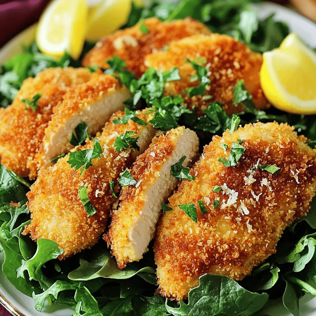 To make crispy Parmesan crusted chicken cutlets, you need: - 4 boneless, skinless chicken breasts - 1 cup grated Parmesan cheese - 1 cup breadcrumbs (preferably panko for extra crunch) - 1 teaspoon garlic powder - 1 teaspoon Italian seasoning - 1/2 teaspoon salt - 1/2 teaspoon black pepper - 2 large eggs - 1/4 cup all-purpose flour - Olive oil or cooking spray (for frying) You can add more fun to your cutlets with these extras: - 1/4 cup fresh parsley, chopped (for garnish) - Lemon wedges (for serving) - Balsamic vinegar (for drizzling) These ingredients enhance taste and look. The parsley adds color and freshness, while lemon gives a zesty kick. To cook these delicious cutlets, gather these tools: - Meat mallet or rolling pin - Three shallow dishes (for breading) - Large skillet - Tongs (for flipping chicken) - Paper towels (for draining) Having the right tools makes the process smooth. You will enjoy cooking and serving this dish more when you are prepared! Start by prepping the chicken. Place the chicken breasts between two pieces of plastic wrap. You can also use a large zip-top bag. Next, grab a meat mallet or a rolling pin. Pound the chicken to an even thickness of about 1/2 inch. This helps the chicken cook evenly. Now, let’s set up the breading station. You will need three shallow dishes. In the first dish, add 1/4 cup of all-purpose flour. In the second dish, whisk together two large eggs. In the third dish, mix 1 cup of grated Parmesan, 1 cup of breadcrumbs, 1 teaspoon of garlic powder, 1 teaspoon of Italian seasoning, 1/2 teaspoon of salt, and 1/2 teaspoon of black pepper. This mix will give the chicken a tasty crust. It’s time to cook the chicken. Heat about 1/4 inch of olive oil in a large skillet over medium heat. Wait until the oil shimmers. This means it’s hot enough. Carefully add the breaded chicken cutlets in batches. Don’t overcrowd the pan. Fry each cutlet for about 4-5 minutes on each side. You want them golden brown and cooked through. The internal temperature should reach 165°F. Once cooked, transfer the cutlets to a plate lined with paper towels. This helps drain any excess oil. Enjoy your crispy chicken cutlets! To get that perfect crunch, use panko breadcrumbs. They add extra texture that regular breadcrumbs lack. Make sure to press the breading firmly onto the chicken. This helps it stick better when frying. Fry in hot oil; it should shimmer. Do not overcrowd the pan. This keeps the oil hot and gives a nice golden color. Feel free to tweak the seasoning mix. If you love garlic, add more garlic powder. You can also try adding a pinch of cayenne for heat. Fresh herbs like thyme or oregano can add more flavor. Adjust salt and pepper based on your taste. Taste your egg mixture for a hint of seasoning before breading. One mistake is not pounding the chicken evenly. This will lead to uneven cooking. Another common error is skipping the chilling step after breading. Chill the cutlets for about 10 minutes. This helps the breading set. Lastly, don’t rush the frying. Cook each side until golden brown. Rushing can lead to soggy cutlets. {{image_2}} You can change the cheese to fit your taste. Try using mozzarella for a melty bite. It adds a nice stretch and flavor. Cheddar also works well, giving a sharp taste. You can even mix cheeses for a unique flavor. Just remember to keep the same amount of cheese. Want some heat? Add red pepper flakes to the breadcrumb mix. Start with half a teaspoon and taste. You can always add more! Another option is to use pepper jack cheese. This gives a creamy texture with a spicy kick. You can also try hot sauce in the egg wash for extra flavor. To make these cutlets gluten-free, swap the breadcrumbs. Use gluten-free breadcrumbs or crushed rice cereal. You can also use ground almonds for a nutty flavor. Just ensure the flour is gluten-free too. The cooking method stays the same, so you still get that crunch! After cooking your crispy Parmesan crusted chicken cutlets, let them cool down. Place them on a wire rack. This keeps air circulating and helps prevent sogginess. If you stack them, they may steam and lose their crunch. Store any leftovers in an airtight container. Make sure they cool completely before sealing. You can keep them in the fridge for up to three days. For longer storage, freeze them in a freezer-safe bag. They can last up to three months in the freezer. To reheat, use an oven for the best crunch. Preheat the oven to 375°F. Place the chicken cutlets on a baking sheet and bake for about 10-15 minutes. If you are short on time, you can use a microwave, but this may make them soft. If you want to use the microwave, heat in short bursts and check often. To check if your chicken is cooked, use a meat thermometer. Insert it into the thickest part of the cutlet. The chicken should reach an internal temperature of 165°F. If you don’t have a thermometer, cut into the chicken. The meat should be white and juices should run clear, not pink. Yes, you can freeze chicken cutlets. Allow them to cool completely after cooking. Place them in a single layer on a baking sheet. Freeze for about 1 hour, then transfer them to a freezer-safe bag. They can last for up to three months in the freezer. When ready to eat, thaw in the fridge overnight and reheat in the oven. Many sides work well with these chicken cutlets. Here are some great options: - Mixed greens salad: A fresh salad adds crunch and color. - Roasted vegetables: Try carrots, broccoli, or zucchini for a tasty side. - Mashed potatoes: Creamy potatoes balance the crunch of the chicken. - Pasta: A light pasta dish with olive oil and garlic complements the meal. - Rice pilaf: Fluffy rice adds a nice texture and flavor contrast. Feel free to mix and match these sides to create your perfect meal! You learned the key steps to make crispy Parmesan chicken cutlets. We covered the essential and optional ingredients, along with the best cooking tools. I shared tips for achieving tha