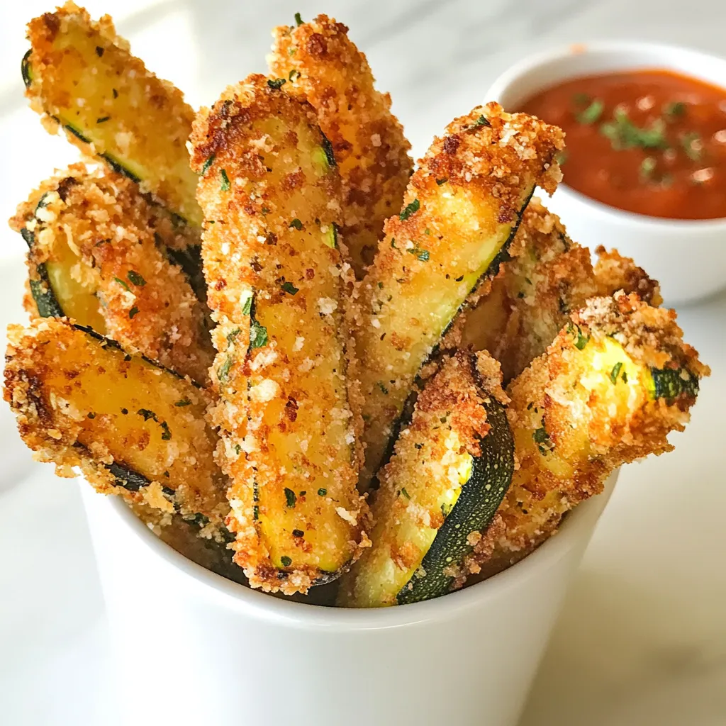 These zucchini fries pair well with many dips. You can serve them with marinara sauce for a classic touch. Ranch dressing or garlic aioli also make great choices. For a twist, try spicy sriracha or a creamy avocado dip. You can even serve them alongside burgers or salads for a tasty side dish.