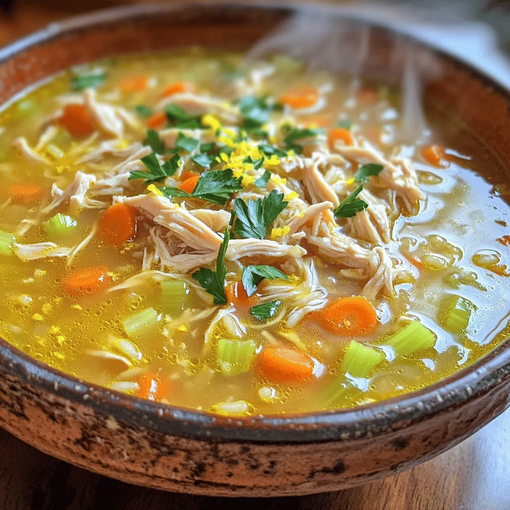 ![When I think of Easy Chicken and Rice Soup, I focus on fresh, simple ingredients. Each one plays a key role in making this dish comforting and tasty. Here’s what you need: - 1 tablespoon olive oil - 1 medium onion, chopped - 2 cloves garlic, minced - 2 medium carrots, diced - 2 celery stalks, diced - 1 pound boneless, skinless chicken breasts - 6 cups chicken broth - 1 cup long-grain rice (uncooked) - 1 teaspoon dried thyme - 1 teaspoon dried oregano - Salt and pepper to taste - Juice of 1 lemon - Fresh parsley for garnish These ingredients create a warm and hearty soup. The olive oil gives a nice base flavor. The onion and garlic add depth, while the carrots and celery bring sweetness and crunch. Chicken breasts provide protein and heartiness. Chicken broth is the soul of the soup, while rice thickens it up. Herbs like thyme and oregano enhance the flavor. A little salt and pepper bring everything together. The lemon juice adds brightness at the end, and parsley gives a fresh touch. Gather these items before you start cooking. Trust me, having everything on hand makes the process smoother. If you want the full recipe, check the [Full Recipe]. 1. Sautéing vegetables Start by heating one tablespoon of olive oil in a large pot over medium heat. Add one chopped onion. Cook it until it is soft and clear, which takes about five minutes. Then, stir in two minced garlic cloves, two diced carrots, and two diced celery stalks. Cook these veggies for three to four minutes until they soften a bit. 2. Cooking chicken in broth Next, add one pound of boneless, skinless chicken breasts into the pot. Pour in six cups of chicken broth to cover the chicken. Bring this mixture to a gentle boil. Once it boils, reduce the heat, and let it simmer for about 15 minutes. The chicken should be fully cooked at this point. 3. Shredding chicken and adding rice After cooking, take the chicken out of the pot. Use two forks to shred it into bite-sized pieces. Return the shredded chicken back into the pot. Add one cup of uncooked long-grain rice, one teaspoon of dried thyme, and one teaspoon of dried oregano. Season with salt and pepper to your taste. 4. Simmering and flavoring the soup Mix everything well. Cover the pot and let it simmer for 20 to 25 minutes. The rice should be tender and fluffy. Before serving, add the juice of one lemon for a fresh, bright taste. You can adjust the seasoning again if needed. This recipe makes a cozy meal for four to six people. For the full recipe, check the ingredients and steps above. Choosing the right chicken for flavor I recommend using boneless, skinless chicken breasts. They cook quickly and stay tender. If you want deeper flavor, try bone-in chicken thighs. They add richness to the soup. Adjusting seasoning for personal taste Taste your soup while cooking. If you like more flavor, add salt, pepper, or herbs. Fresh herbs, like parsley, can brighten up the dish. A splash of lemon juice adds a nice zing too. How to make the soup creamier For a creamier soup, add a splash of heavy cream or milk near the end. Stir it in gently to combine. You can also mash some of the rice to thicken the broth. This will give your soup a nice, silky texture. Try these tips to make your chicken and rice soup perfect every time. For the full recipe, check the Cozy Chicken and Rice Soup section. {{image_2}} You can change up your Easy Chicken and Rice Soup in fun ways. - Adding vegetables like peas or corn: Toss in some frozen peas or corn. These add color and sweetness. You can add them in the last 5 minutes of cooking. They will stay bright and tasty. - Using brown rice instead of white: Brown rice gives a nuttier flavor. It also adds more fiber. Just remember, it takes longer to cook. Add about 10 extra minutes to your cooking time. - Making it gluten-free with alternative broth: If you want a gluten-free version, choose a gluten-free broth. Many brands offer this. Check the labels to make sure. You can also use vegetable broth for a lighter taste. Feel free to mix and match these ideas! You can create a soup that suits your taste. For the full recipe, check out the Cozy Chicken and Rice Soup. Proper storage keeps your soup fresh and tasty. First, let the soup cool down. This step is key. After cooling, you can put it in a container. Use an airtight container for best results. - Refrigeration guidelines: Store your Easy Chicken and Rice Soup in the fridge. It stays good for about 3 to 4 days. Make sure to label the container with the date. This way, you know when to use it. - Freezing tips for leftovers: If you want to keep it longer, freeze the soup. Pour it into freezer-safe bags or containers. Leave some space at the top to allow for expansion. It will last for about 3 months in the freezer. When you are ready to eat it, thaw it in the fridge overnight. - Best reheating methods to maintain flavor: Reheat the soup on the stove for the best flavor. Pour it into a pot and heat over medium-low heat. Stir it often to prevent sticking. You can also use a microwave. Just heat it in a microwave-safe bowl. Stir it halfway through heating to warm it evenly. This soup is great because you can make it ahead. Enjoying it later is easy with these storage tips. For the full recipe, check out the Cozy Chicken and Rice Soup above. Can I use leftover chicken for this recipe? Yes, you can use leftover chicken. Just shred it and add it in step 5. This step saves time and adds flavor. Make sure the chicken is cooked and safe to eat. How can I make this soup dairy-free? To make this soup dairy-free, simply skip any cream or milk. The broth and lemon juice add great taste. You can also add a splash of coconut milk for creaminess if you like. What can I serve with chicken and rice soup? You can serve this soup with crusty bread or a fresh salad. Both pair well with the soup's warmth. I also like to add some crackers for a nice crunch on the side. For a full meal, consider a light dessert afterward. For the comple