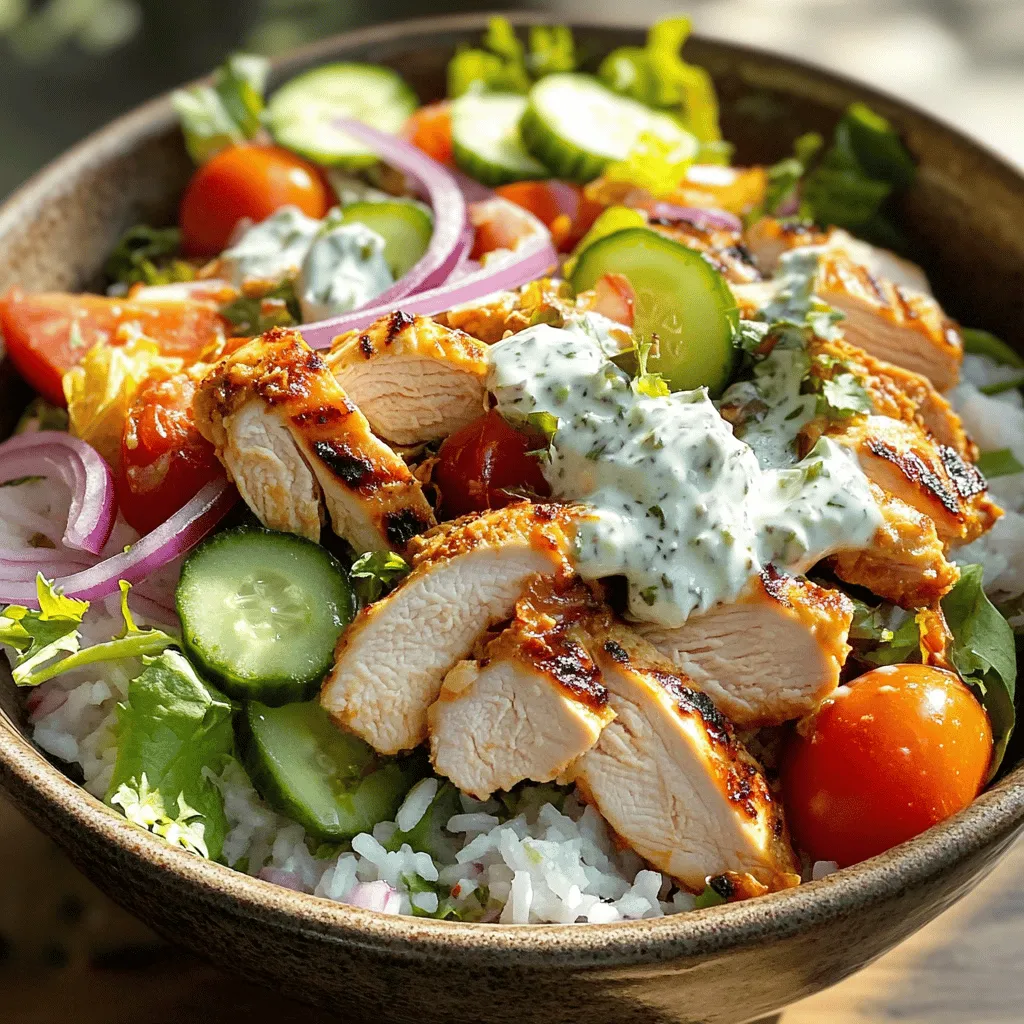 Now for the fun part—assembling your bowl! Start with your base of rice or quinoa in a bowl. Next, add the sliced grilled chicken on top. Then, layer in the diced cucumber, tomatoes, and sliced red onion. Top it off with a handful of mixed greens. Finally, drizzle tzatziki sauce over everything. For a fresh touch, sprinkle parsley or dill on top. Enjoy your easy chicken gyro bowl now!