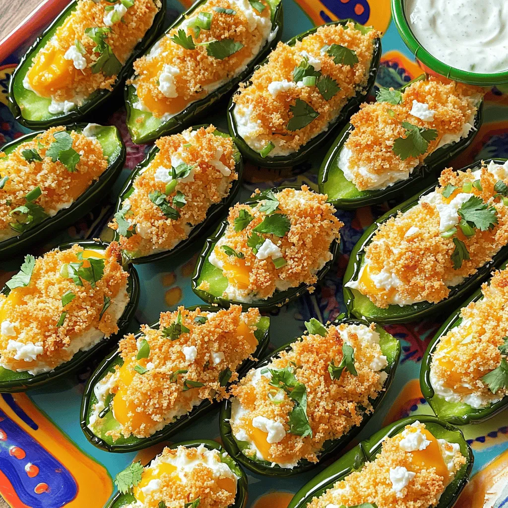 Preheat your oven to 375°F (190°C). Spoon the cheese mixture into each jalapeño half. Fill them generously to ensure great flavor in every bite. In a separate bowl, mix the panko breadcrumbs with a bit of olive oil or cooking spray. Coat the tops of the stuffed jalapeños with the breadcrumbs. Place them on the baking sheet, spaced out. Bake for 20-25 minutes. Look for bubbly cheese and golden breadcrumbs. Let them cool for a few minutes before enjoying.