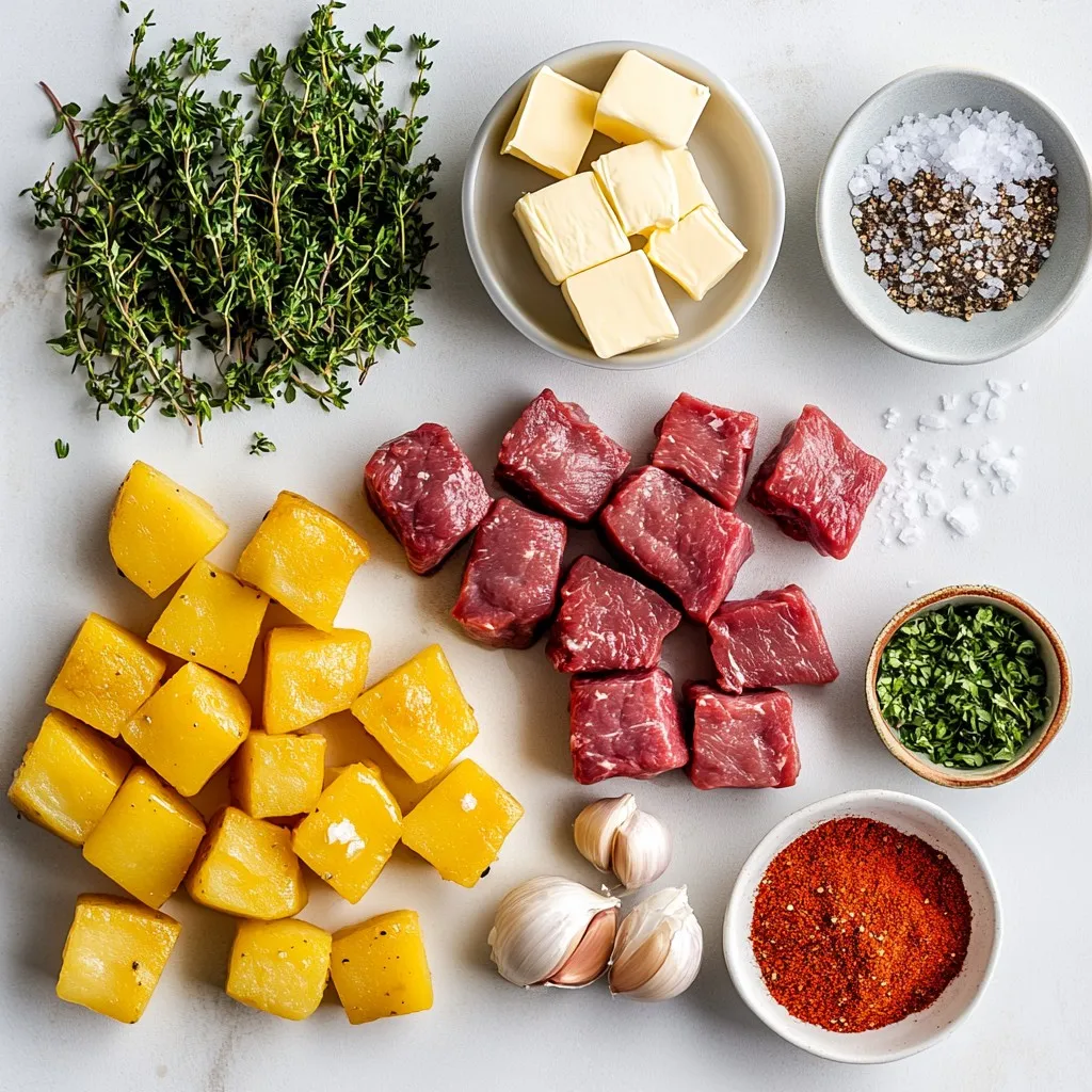 The main ingredients create a rich, hearty dish. Sirloin steak gives great flavor and tender bites. Potatoes add a nice texture. They soak up the garlic butter and spices. Butter is the star here, making everything taste better. Garlic adds a strong, savory punch. Thyme and smoked paprika bring depth and warmth.
